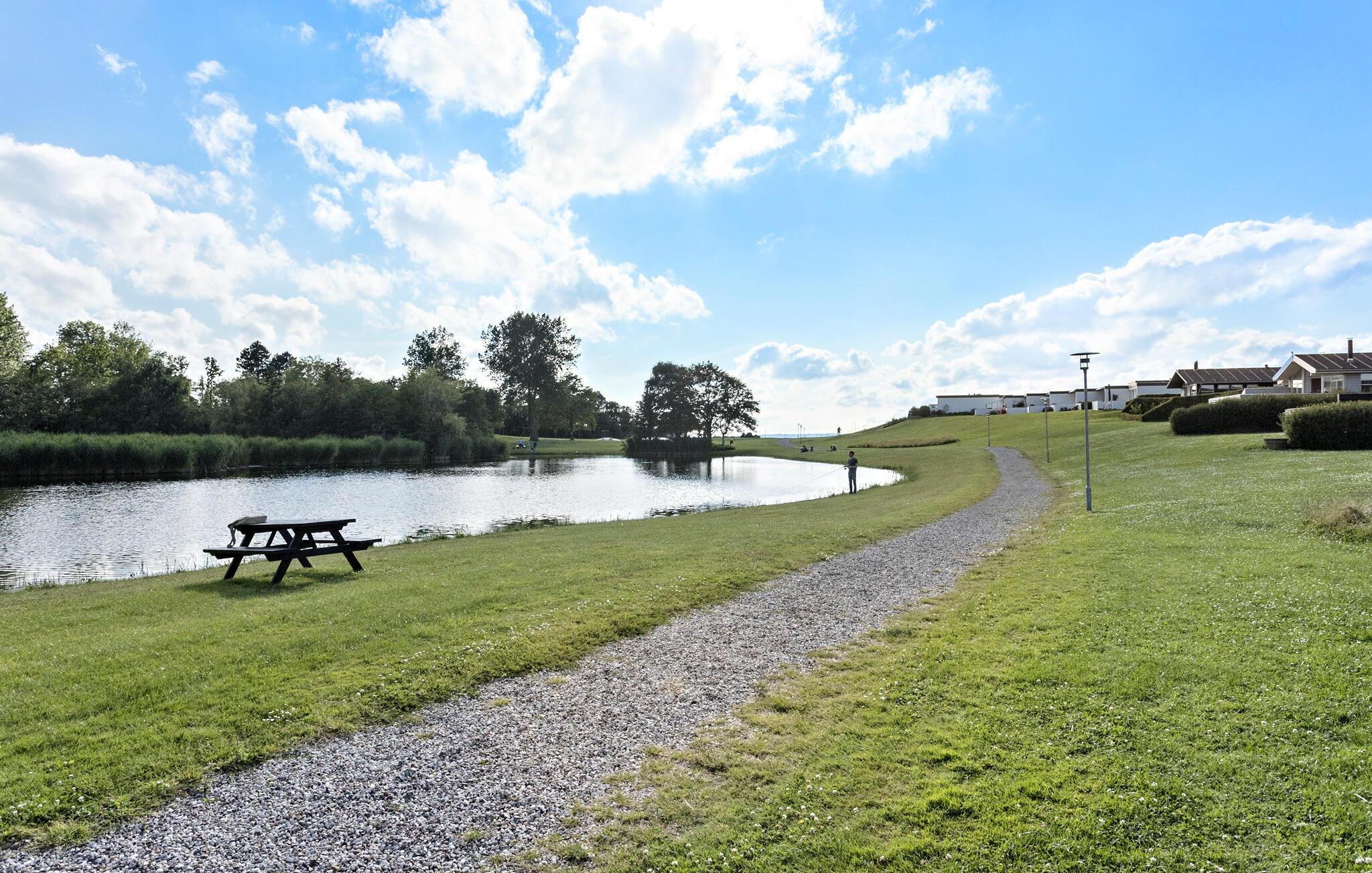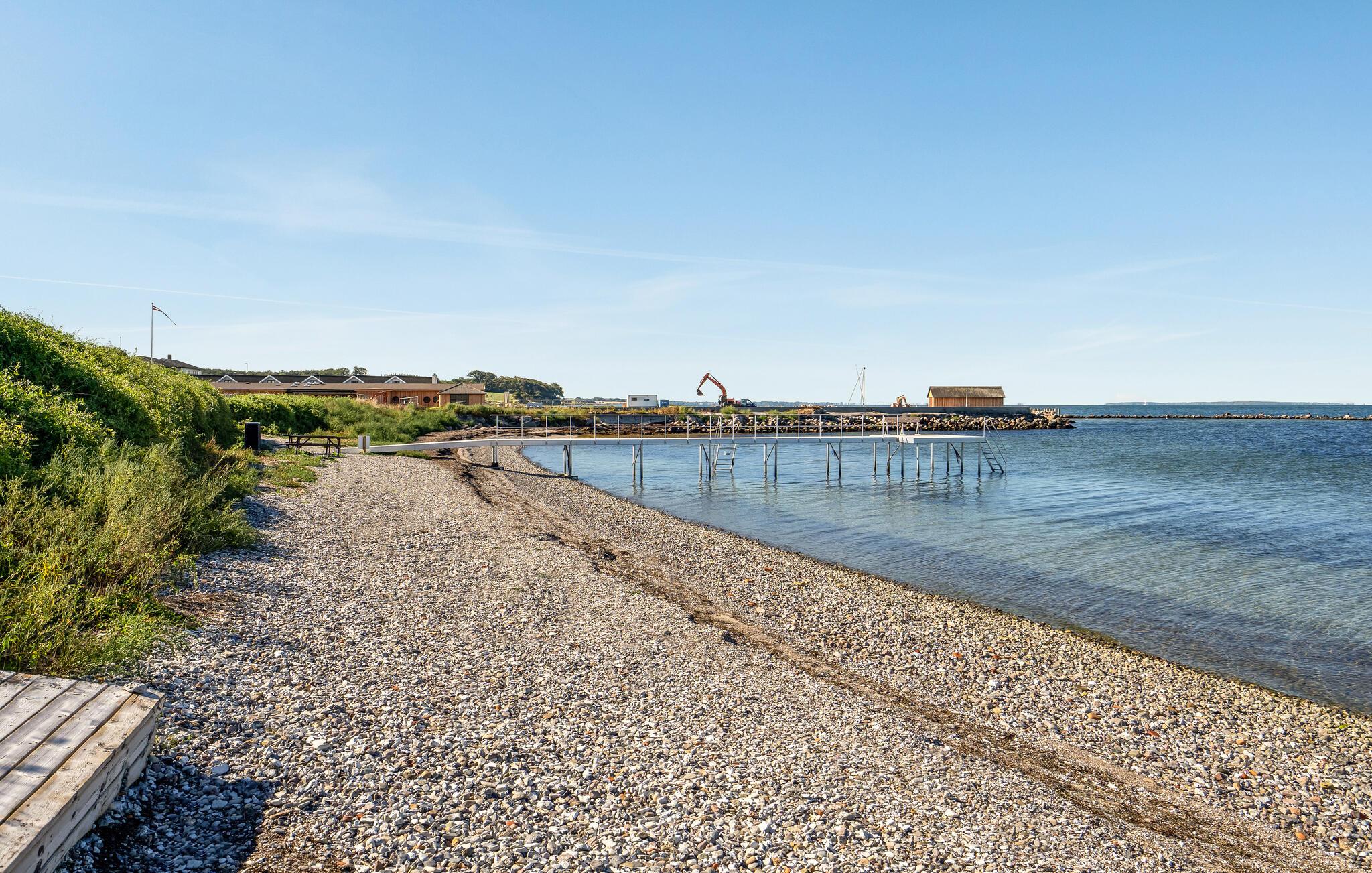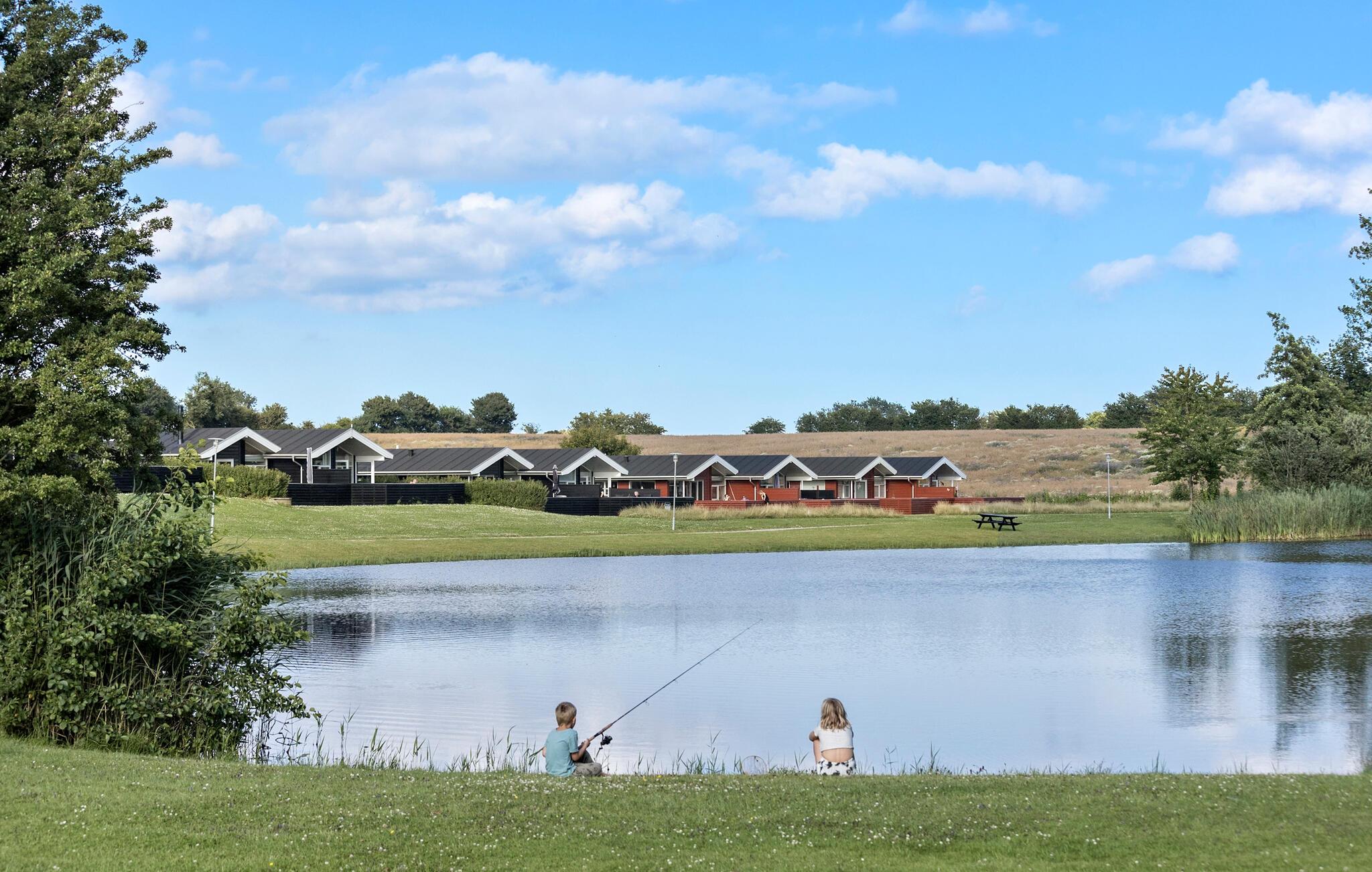 Huset ligger i første række til søen, hvorfra I kan fiske, omgivet af smuk natur i den nordlige del af Langeland. Der er kun få hundrede meter til den børnevenlige sandstrand med roligt, lavt vand, hvor I kan svømme, fiske og surfe. Feriecentret tilbyder et aktivitetscenter og en fælles fiskerenseplads med rensebord. På den store græsplæne er der en legeplads med boldbane og hoppeborg, samt en petanquebane og minigolf. I kan også spille badminton. De fleste faciliteter er kun åbne om sommeren. I er velkomne til at medbringe jeres egne ketsjere og bolde til sport. Der er også en restaurant kun 500 meter fra huset.