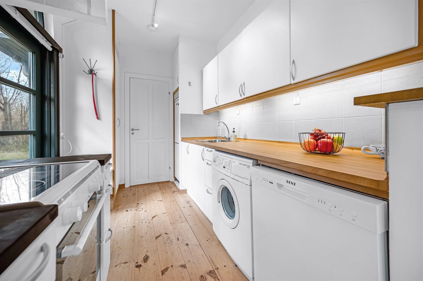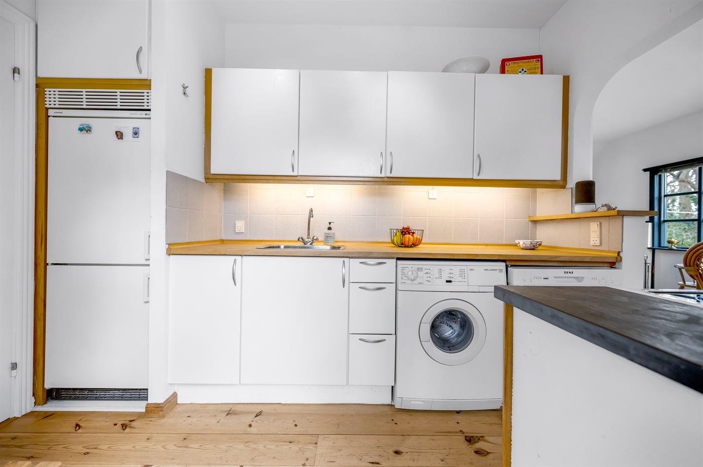 Køkkenet er udstyret med 1 køleskab. Der er 4 keramiske kogeplader, varmluftovn samt opvaskemaskine.