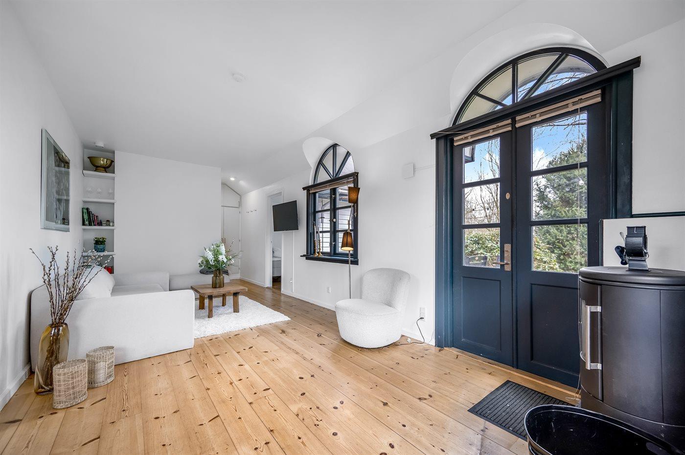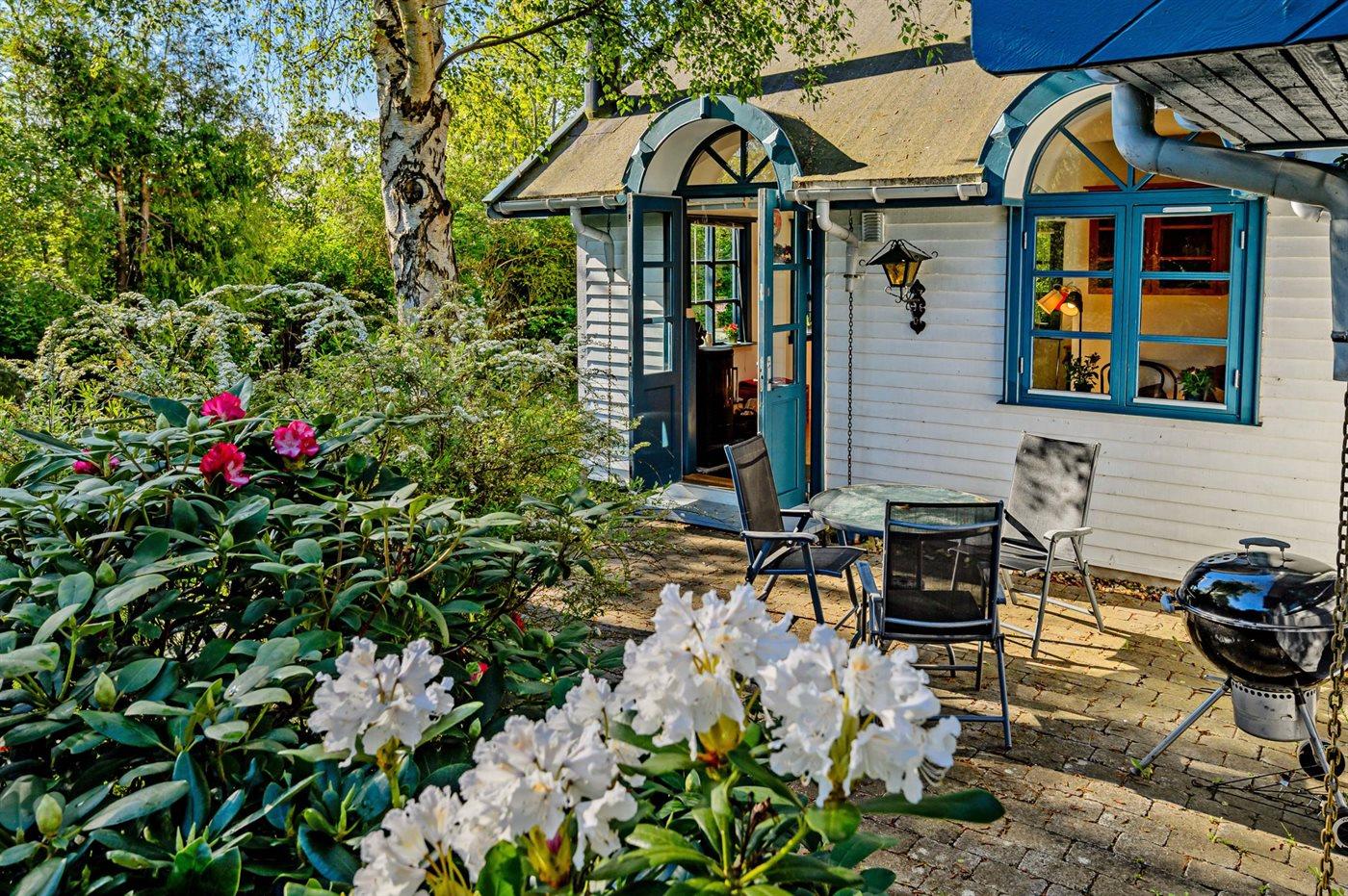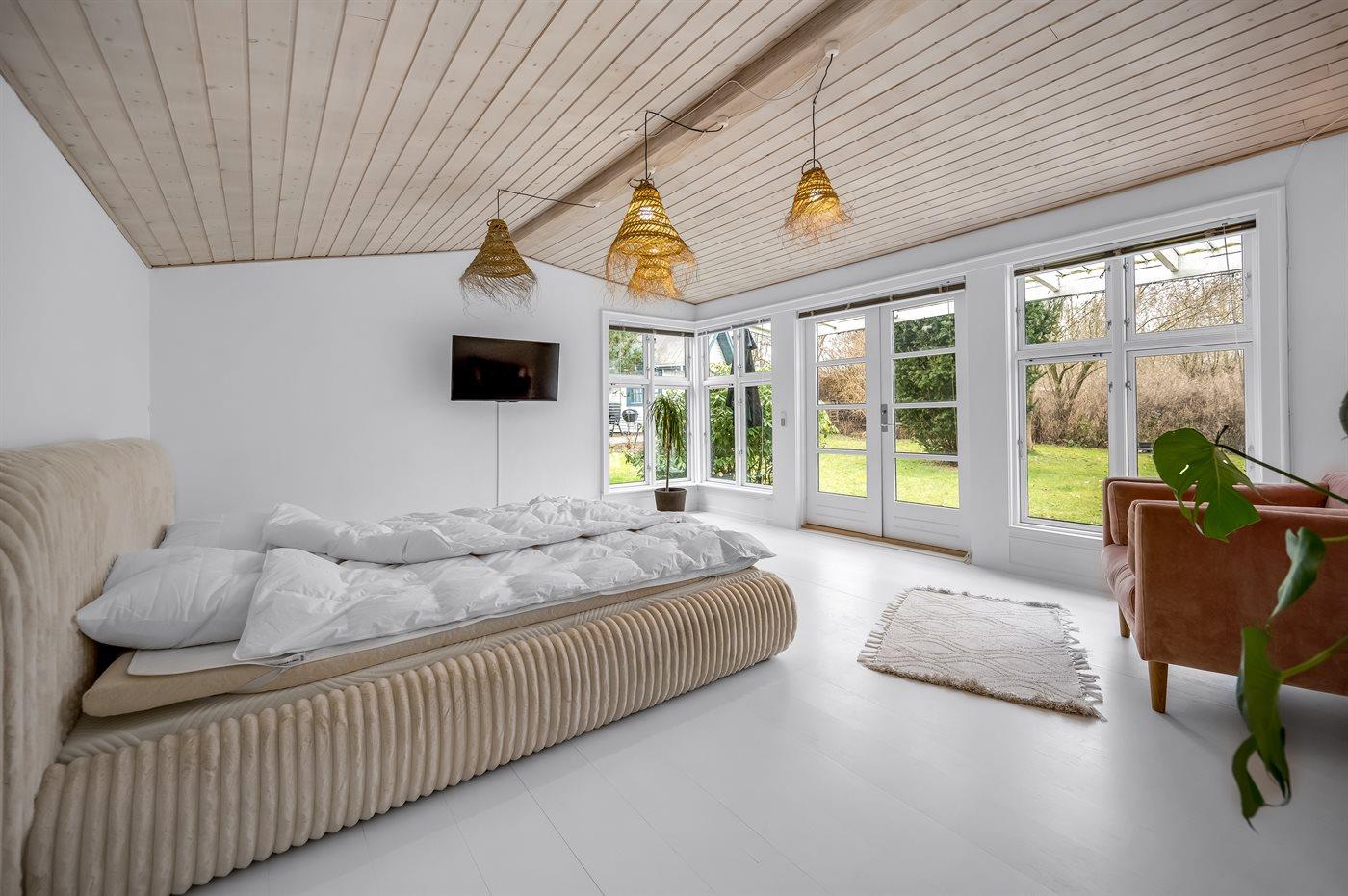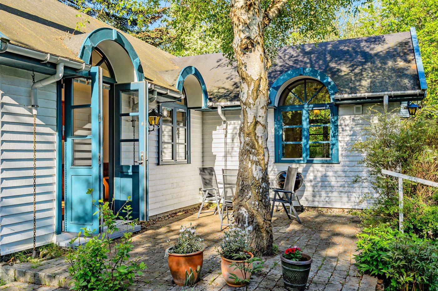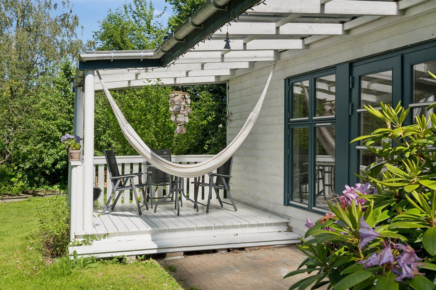 Huset er lyst og luftigt med masser af lysindfald og med en dejlig sommerlig indretning. Stuen og spisepladsen er i åben forbindelse og med køkkenet grænsende op til. Herfra er udgang til terrassen og haven, hvor der er flere hyggekroge og god mulighed for at nyde solen og finde skygge. Der er desuden en udendørs sauna.