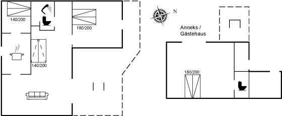 I selve huset er der 2 soveværelser med hver 2 sovepladser i dobbeltsenge. I det store soveværelse er sengen med elevation. I stuen er en dobbelt sovesofa med 2 sovepladser. I det 30 kvadratmeter store anneks er der 2 sovepladser i dobbeltseng og her er også toilet. Huset er derfor meget velegnet til 2 familier. I selve huset er badeværelset med bruseniche og gulvvarme. Huset opvarmes med el-radiatorer og brændeovn. I annekset er der el-radiator.