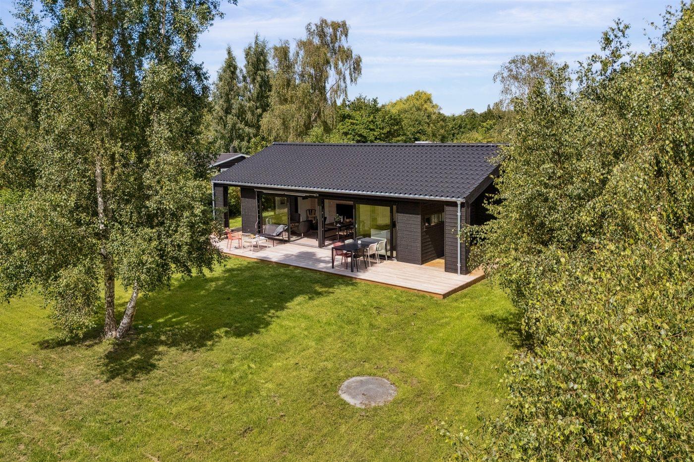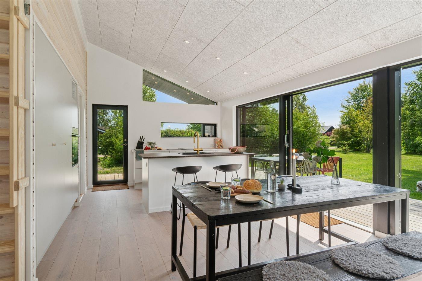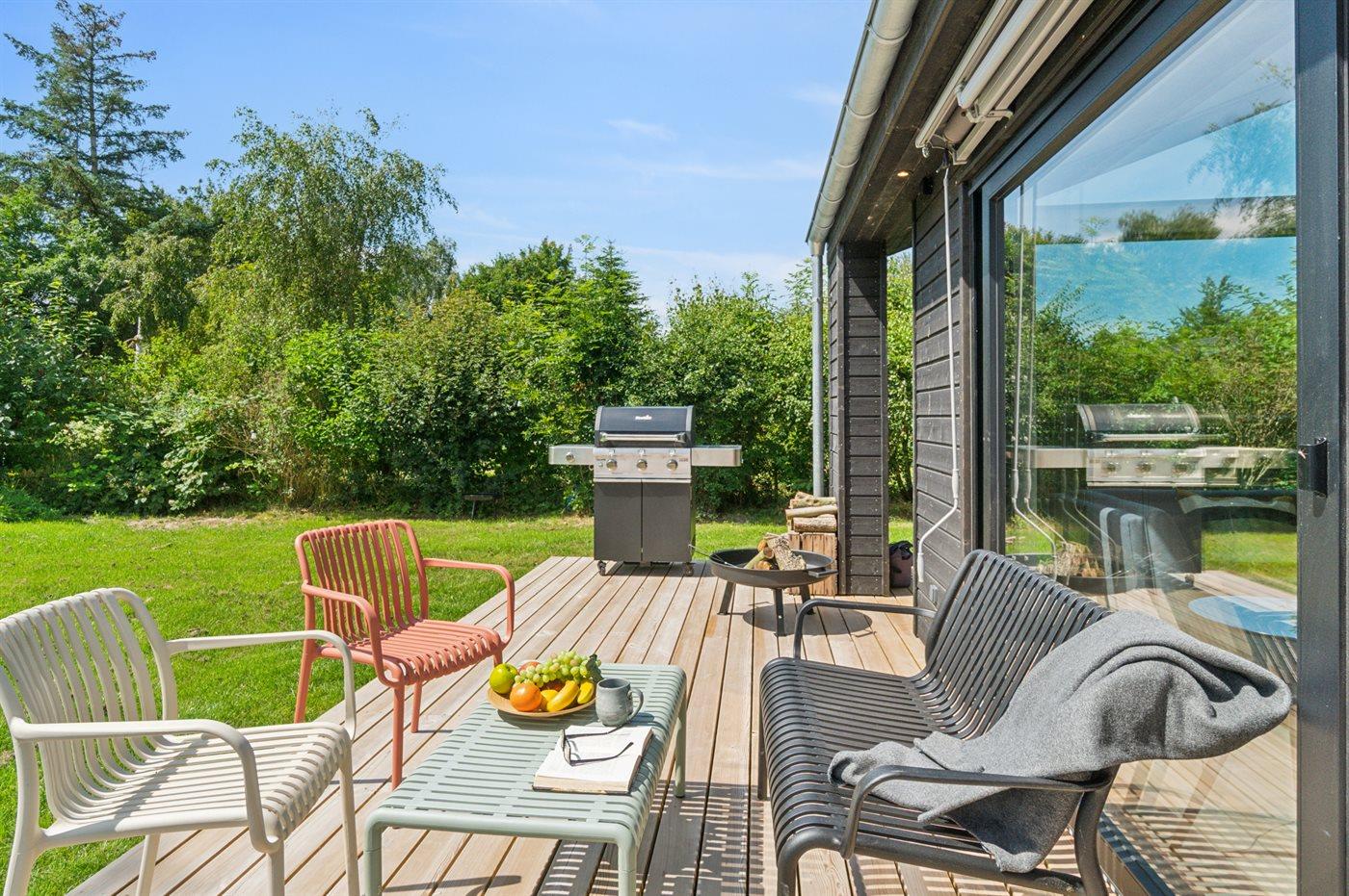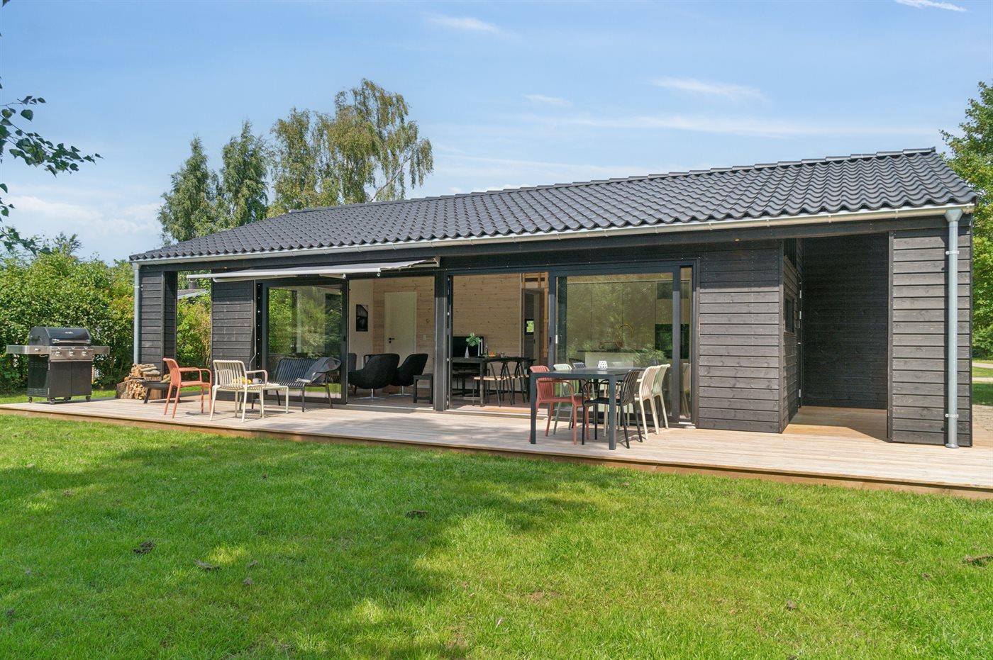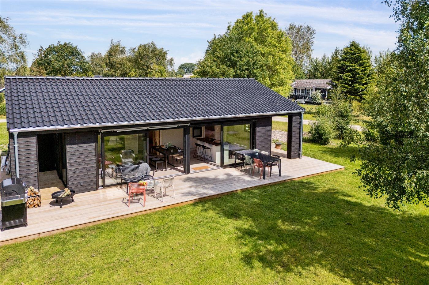 Moderne sommerhus fra 2025 nær Dalby Strand med stor terrasse, bålplads og oplader til elbil.