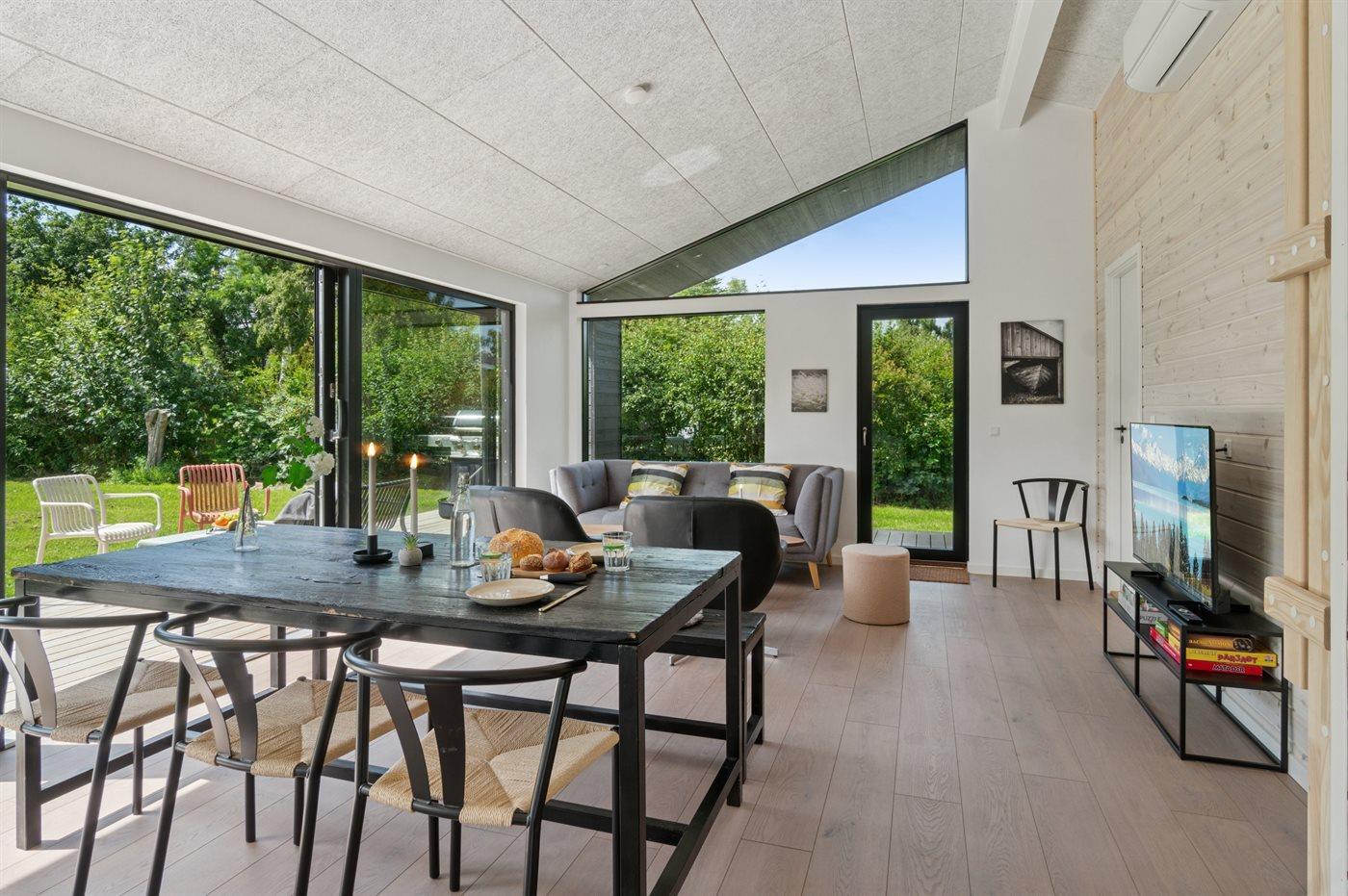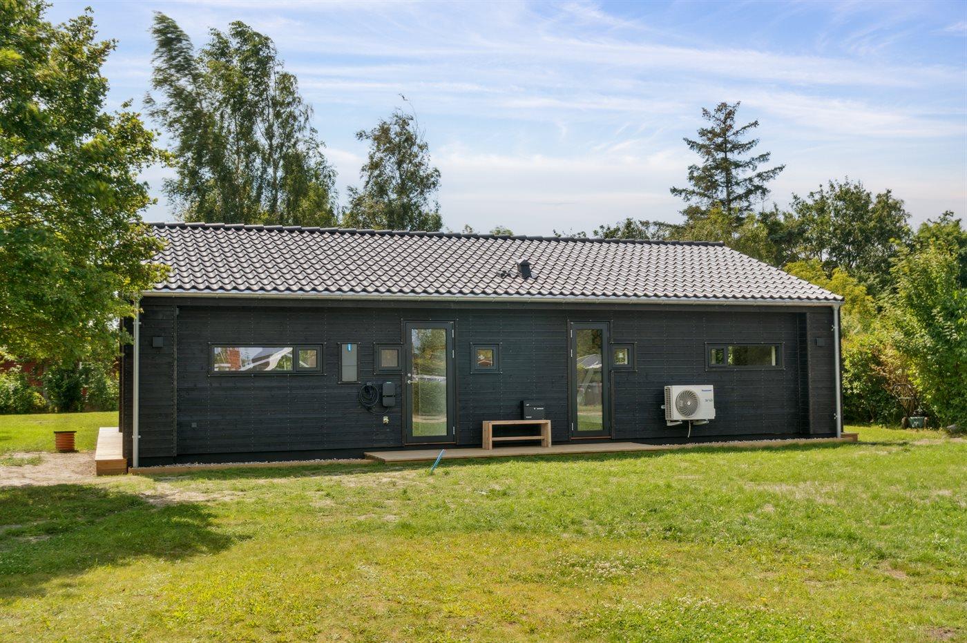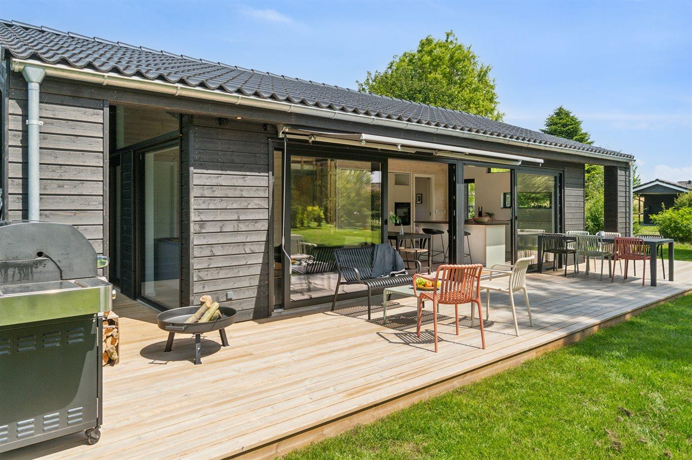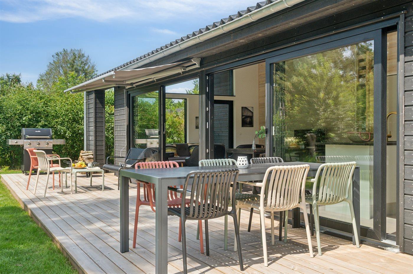 Moderne sommerhus fra 2025 nær Dalby Strand med stor terrasse, bålplads og oplader til elbil.