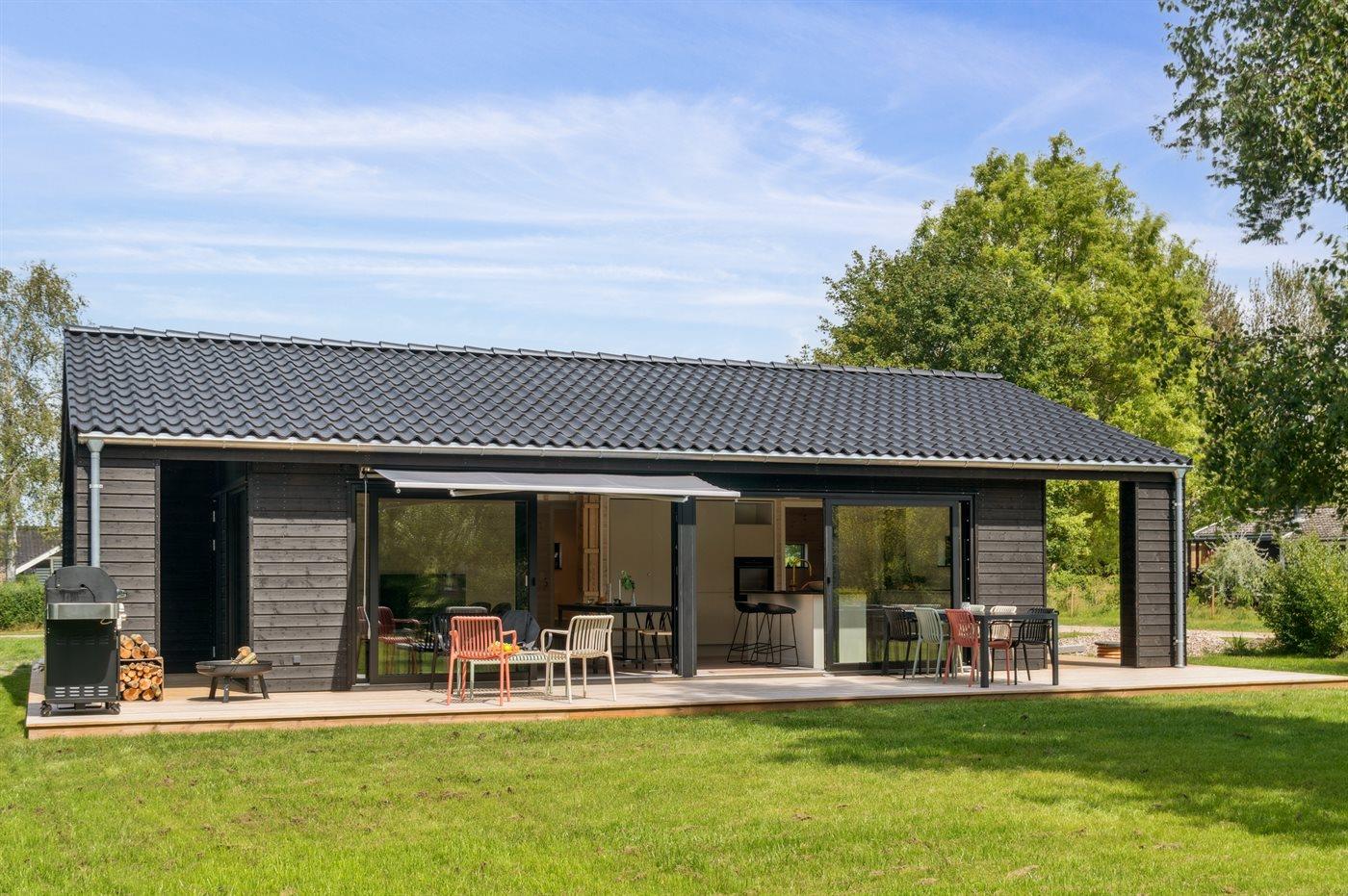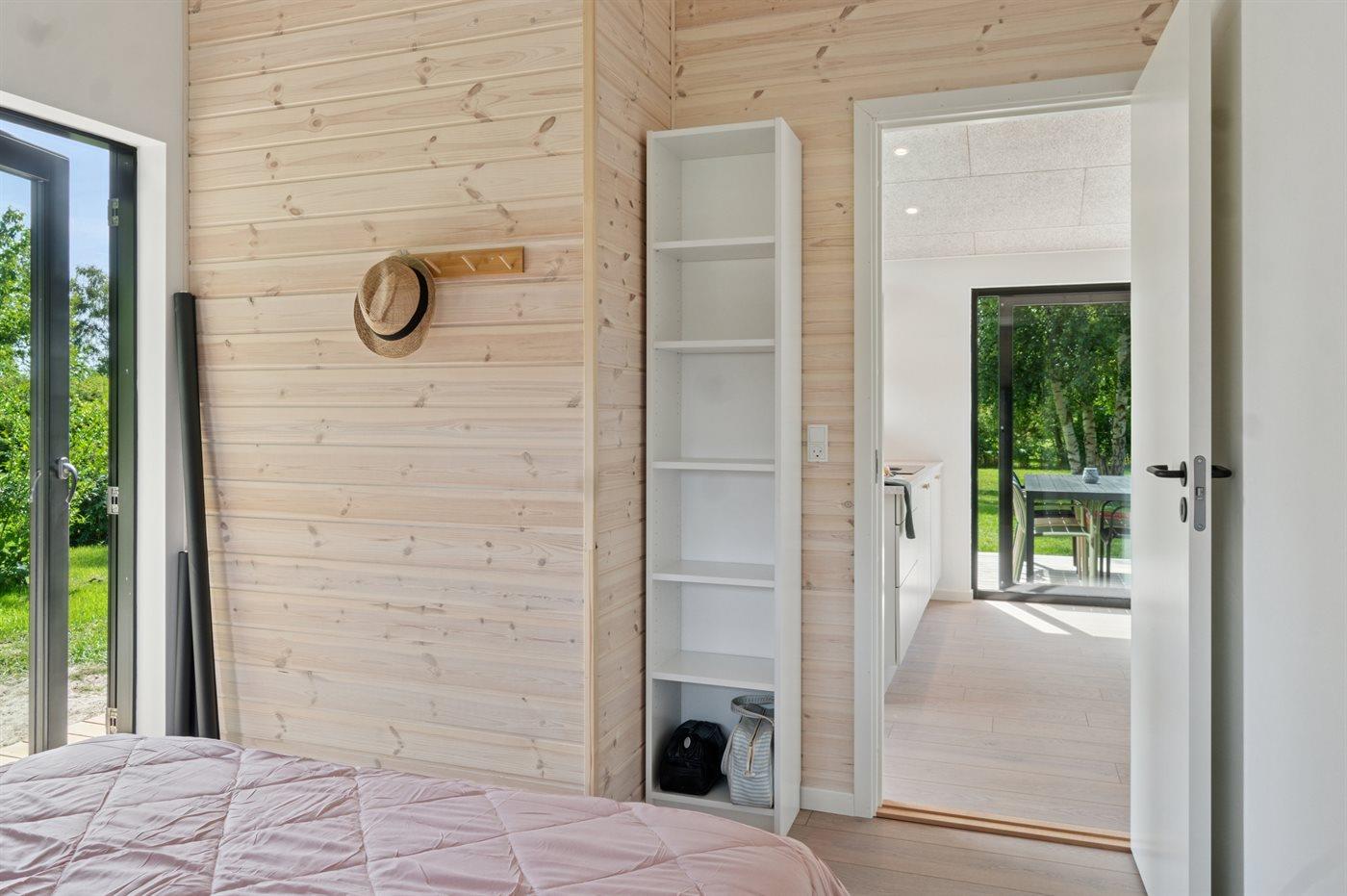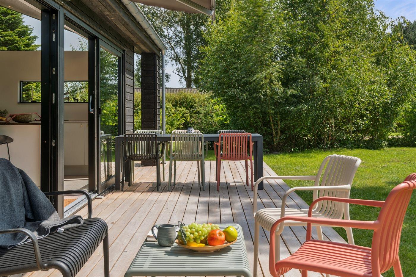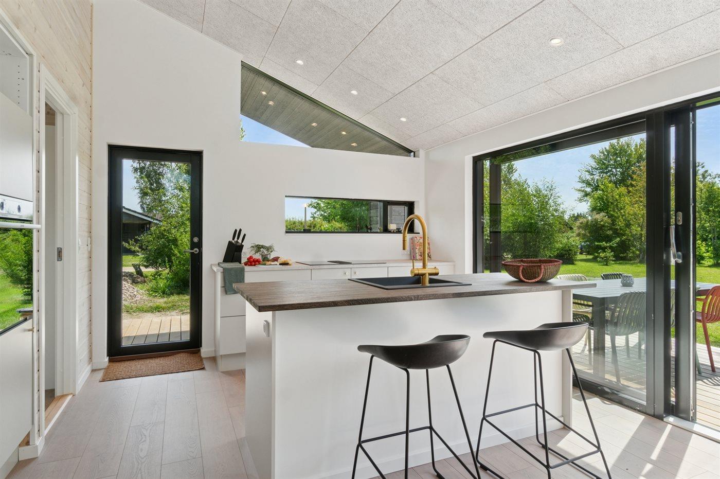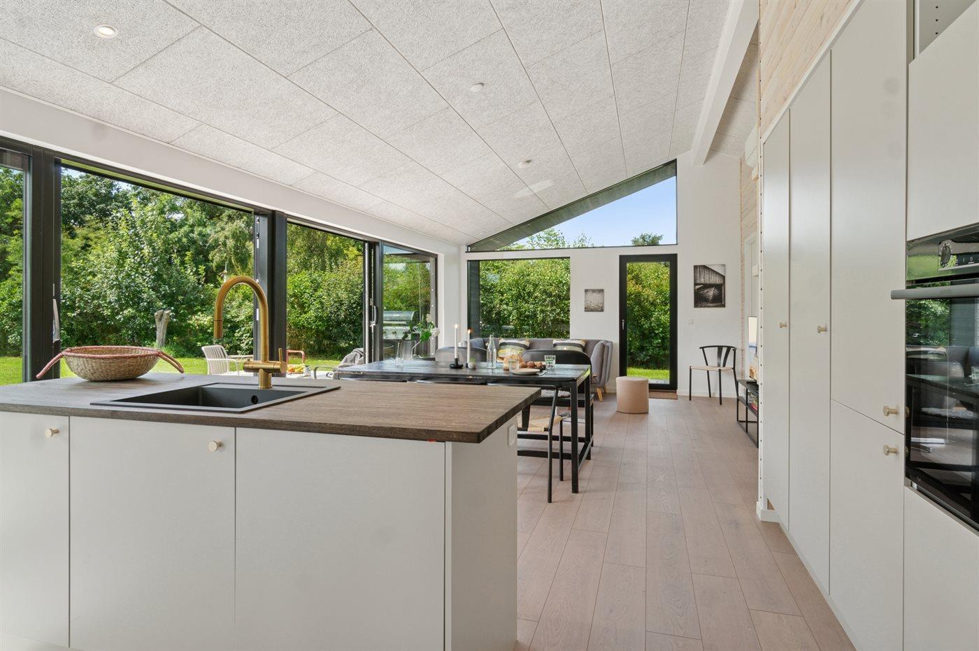 Moderne sommerhus fra 2025 nær Dalby Strand med stor terrasse, bålplads og oplader til elbil.