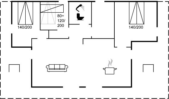 Der er i alt 3 soveværelser. Sovepladserne fordeler sig på: 4 sovepladser i dobbeltsenge. 2 sovepladser i køjeseng. 2 sovepladser på madrasser. 2 af disse sovepladser befinder sig på husets hems. Derudover er der 1 stk. barneseng.