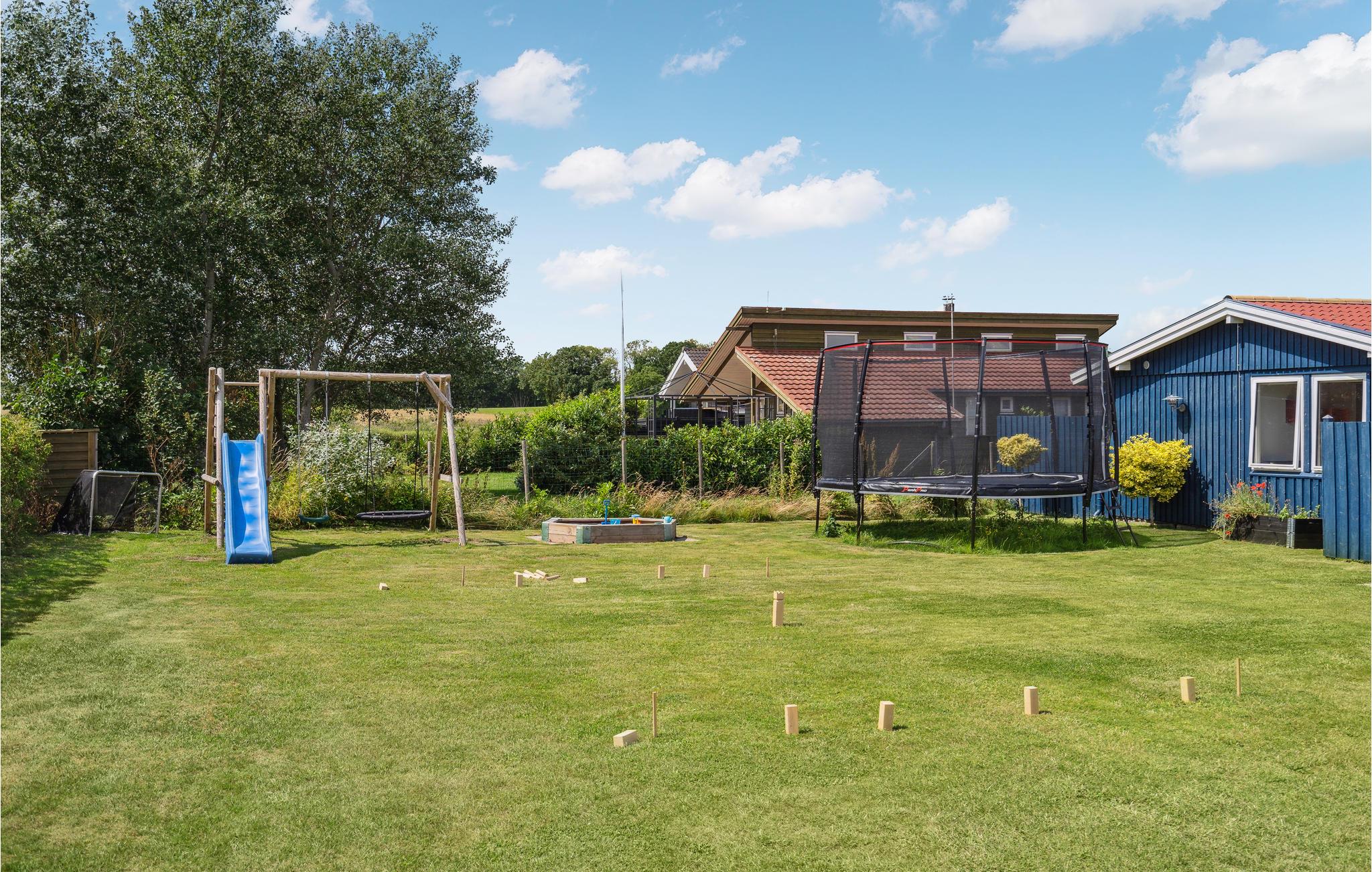 Hyggeligt feriehus i Mesinge tæt på sandstrand med brændeovn og stor have med legeredskaber.