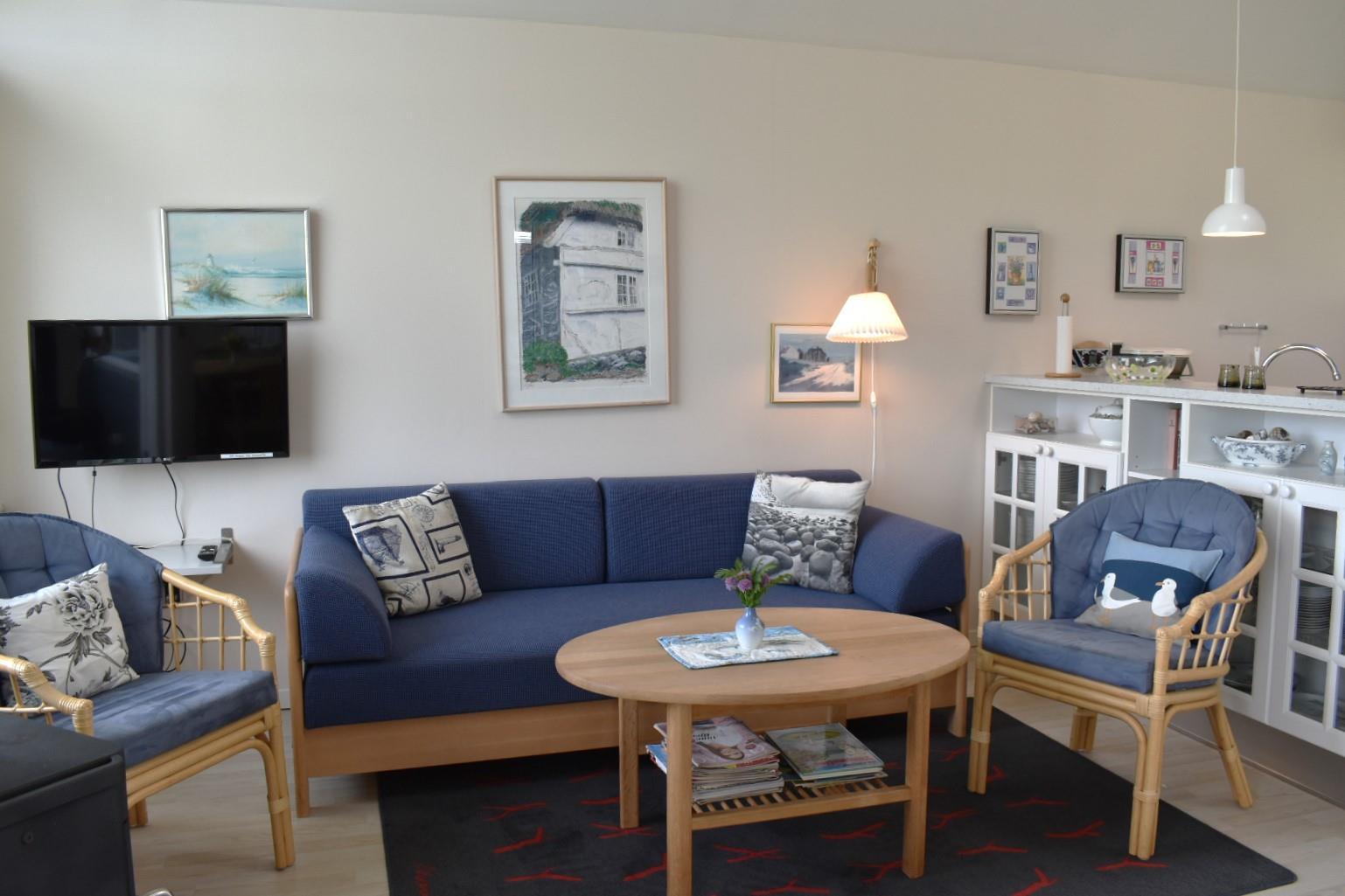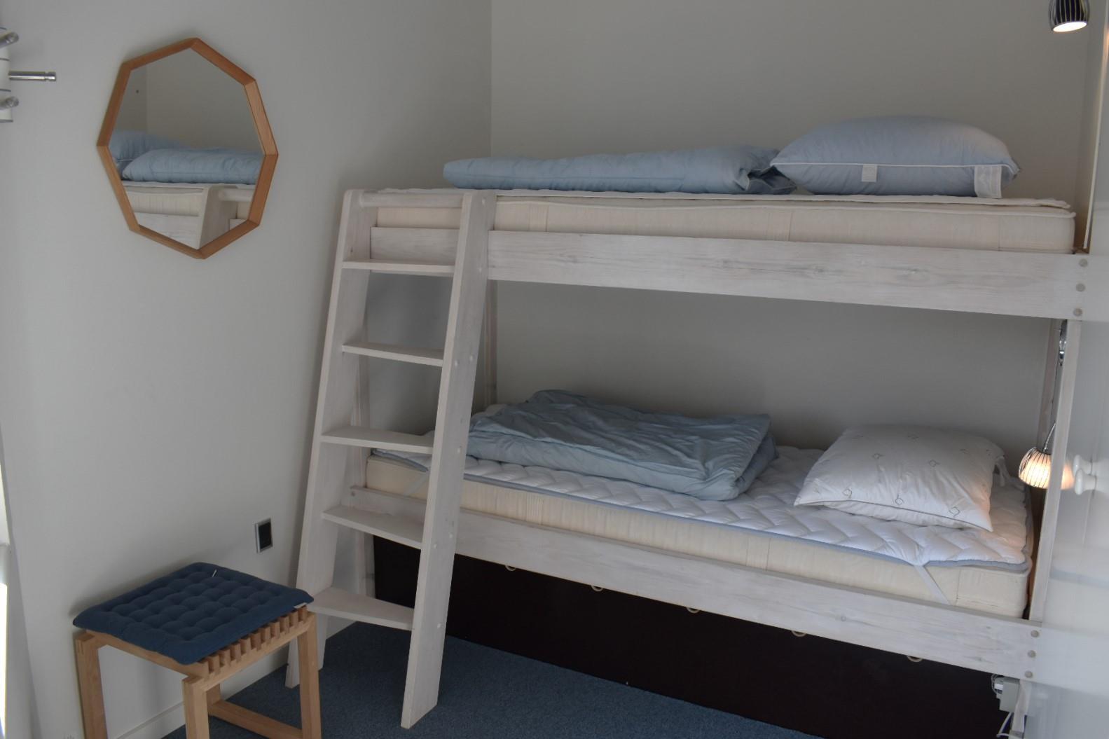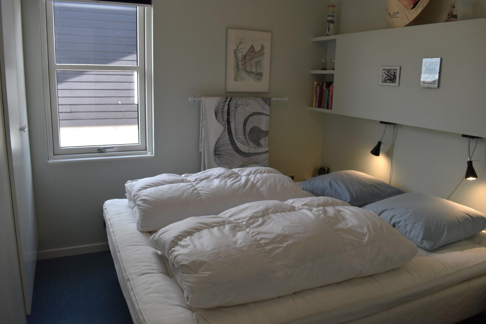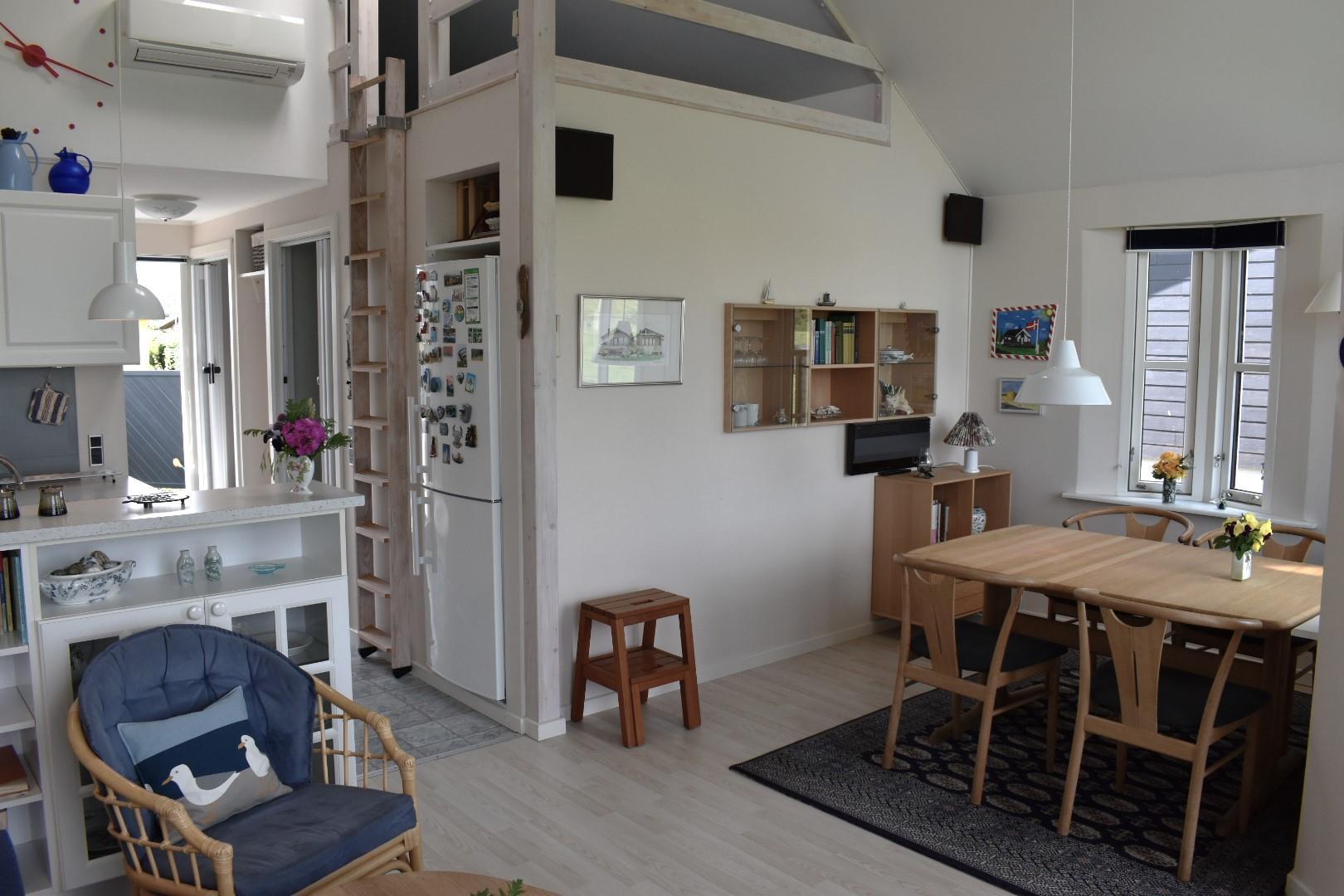 Sommerhuset er lyst og indbydende med en stue i åben forbindelse med det veludstyrede køkken. Der er plads til fire overnattende fordelt på et soverum med dobbeltseng (160 cm) og et værelse med to køjesenge – ideelt til både par og familier. Badeværelset er udstyret med gulvvarme for ekstra komfort.