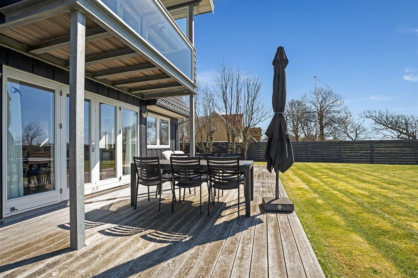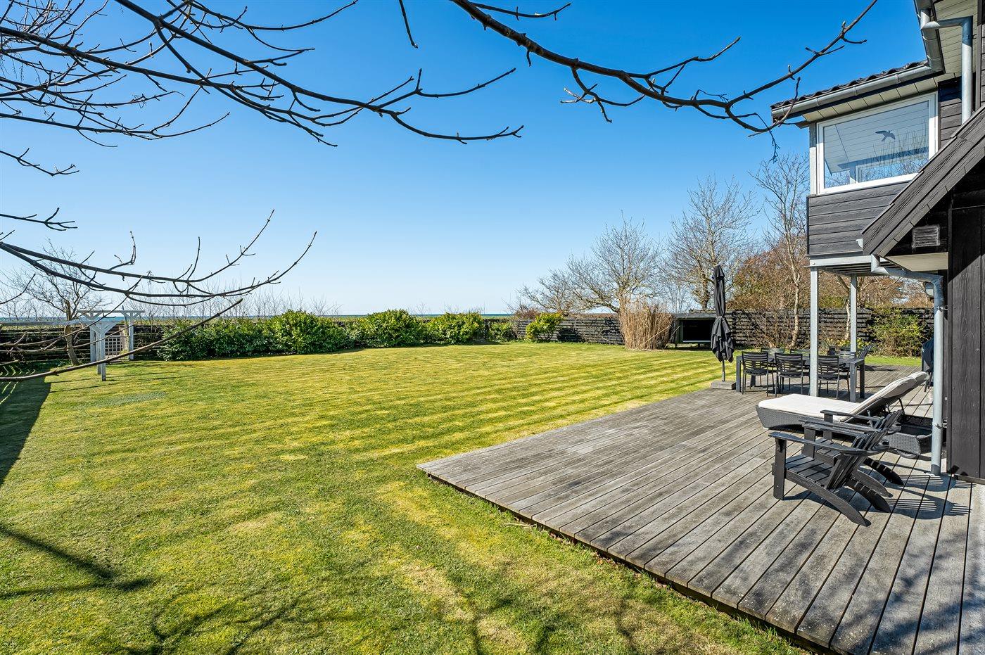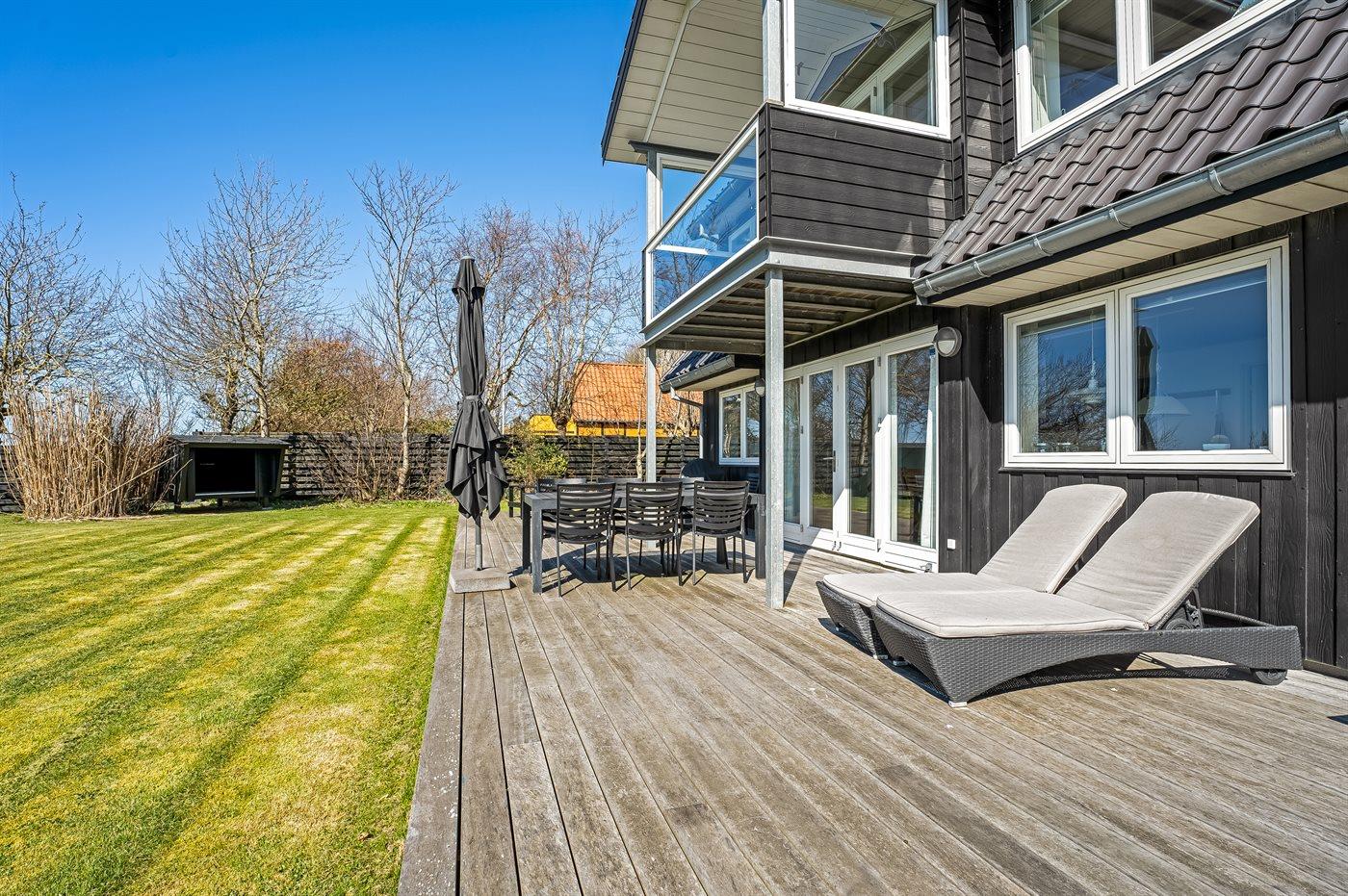 Husets dejlige, store græsplæne og det store terrasseområde indbyder til leg og hygge i det fri.