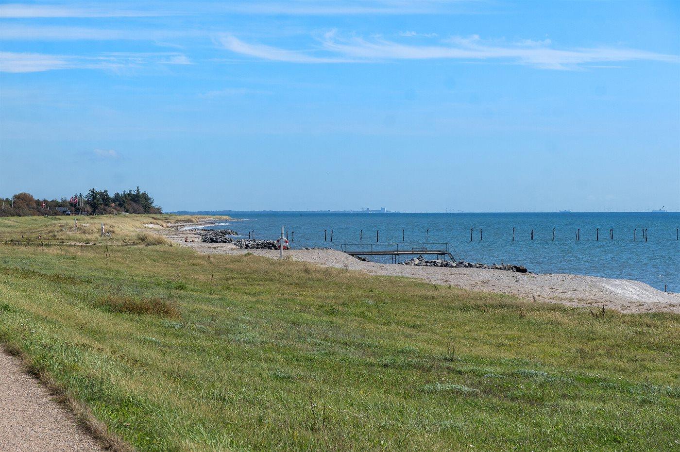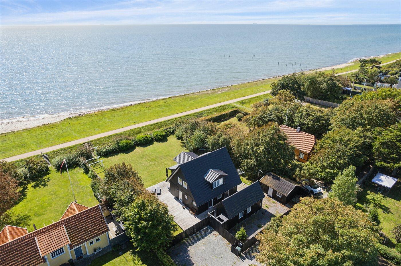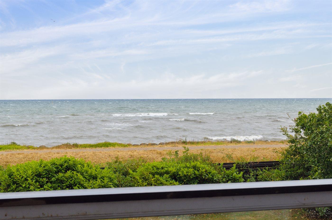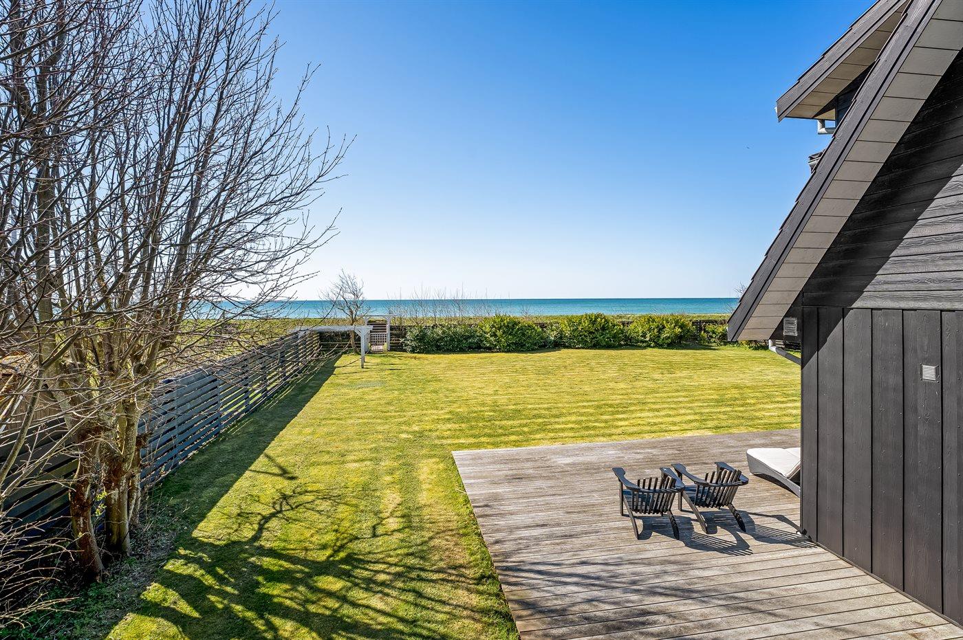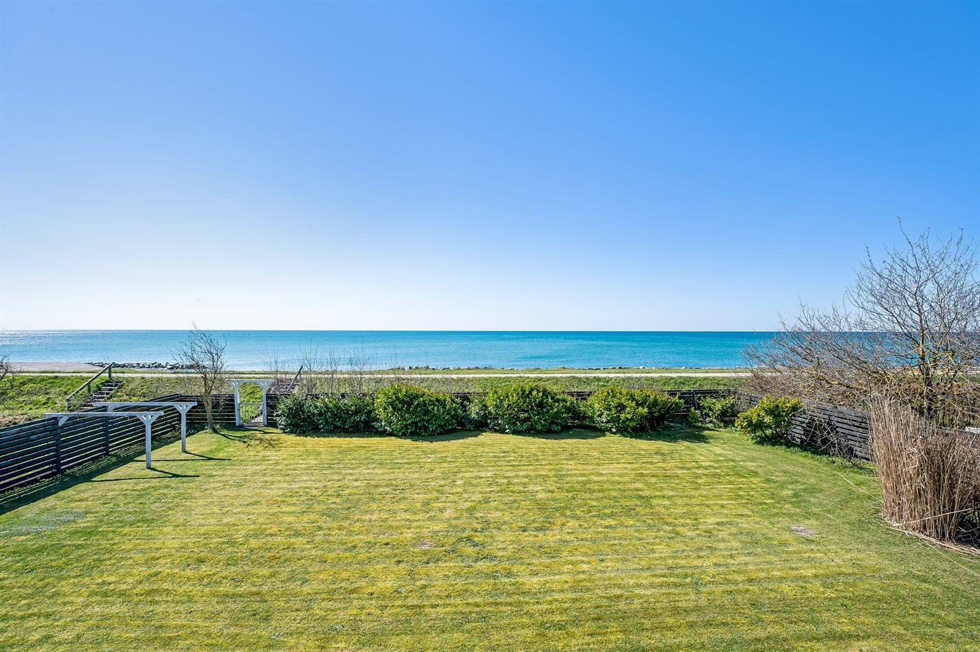 Huset ligger kun 30 m fra stranden, så man skal kun lige over diget og så er man ved vandet. Fra husets førstesal er der panoramaudsigt over havet.