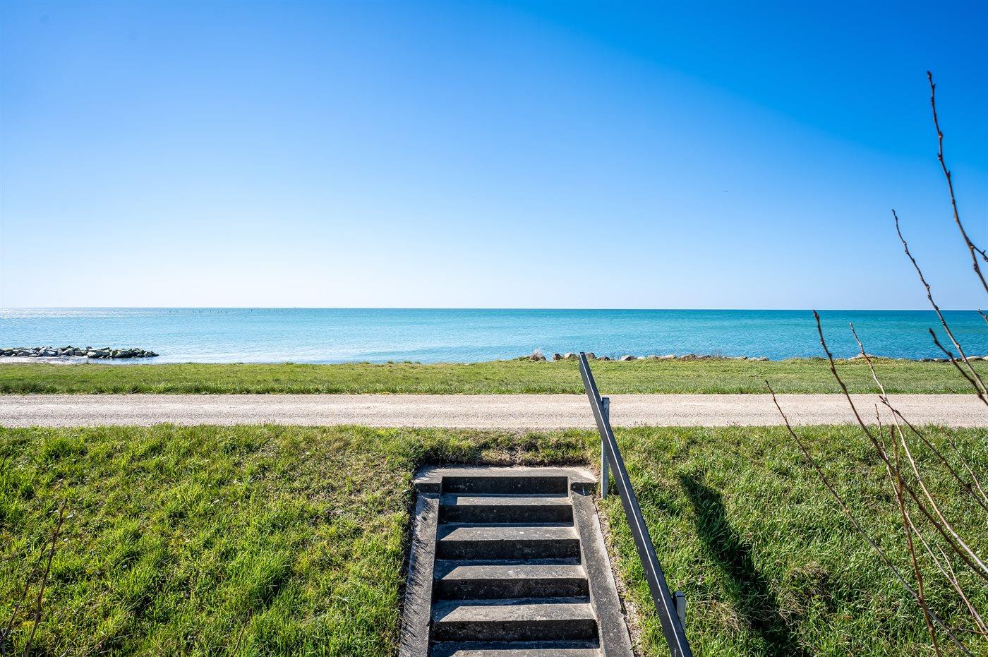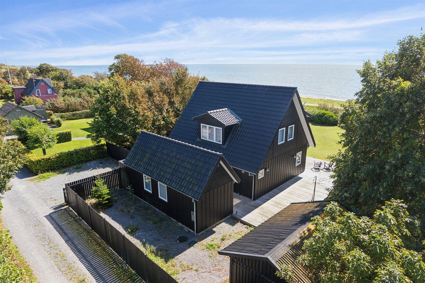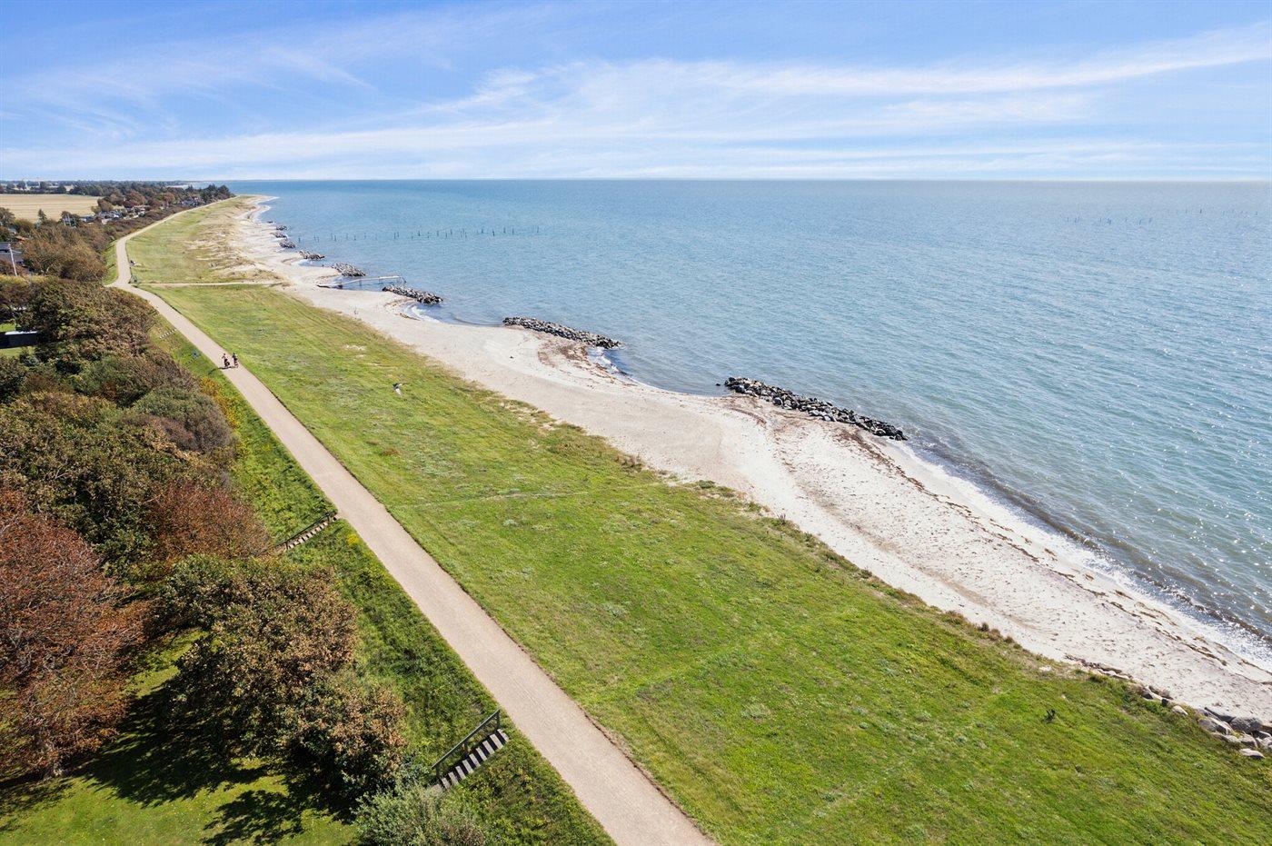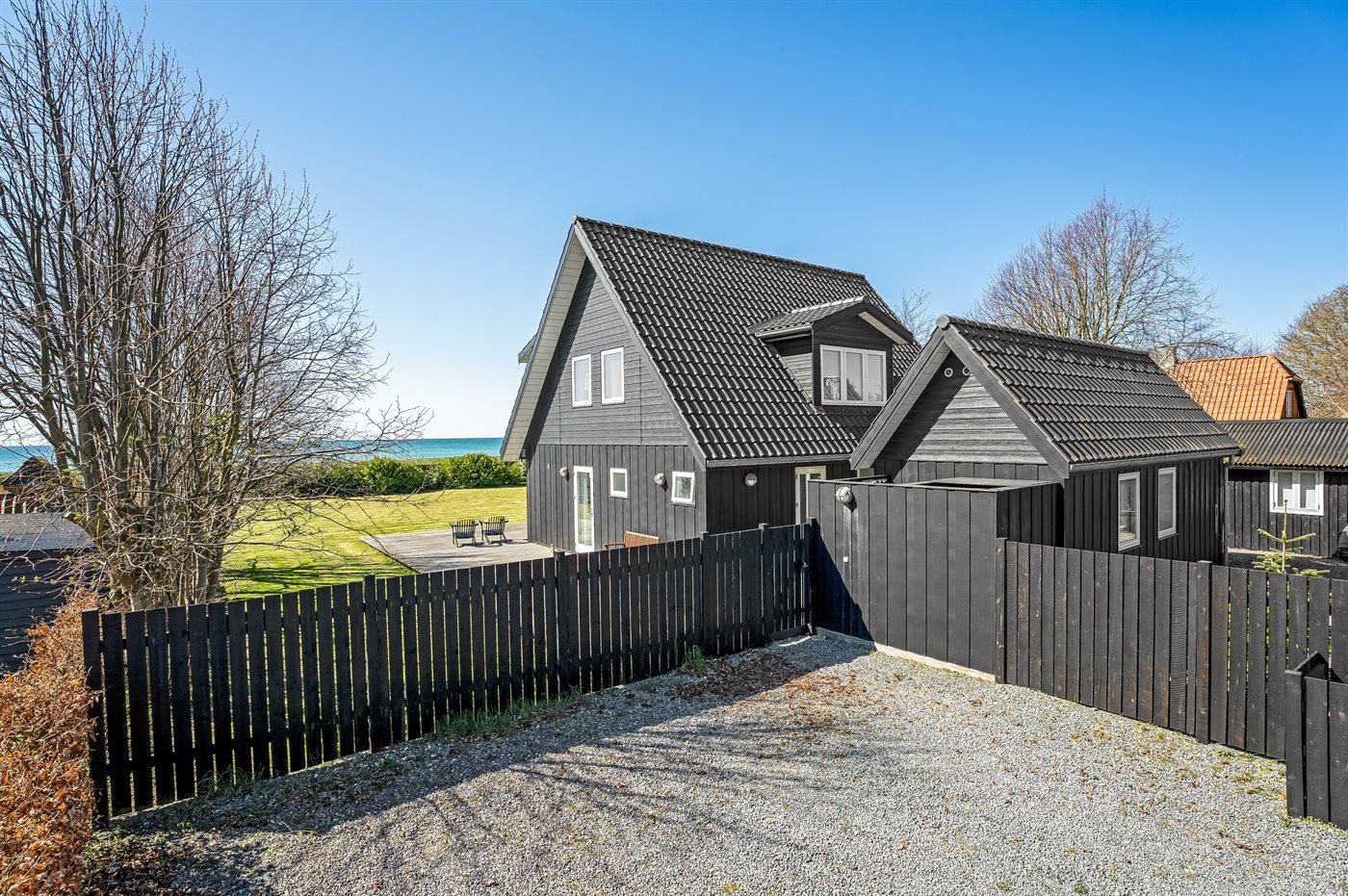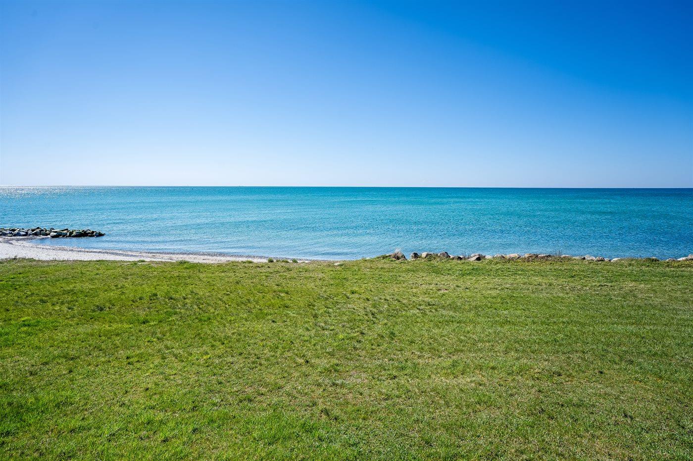 Huset ligger kun 30 m fra stranden, så man skal kun lige over diget og så er man ved vandet. Fra husets førstesal er der panoramaudsigt over havet.