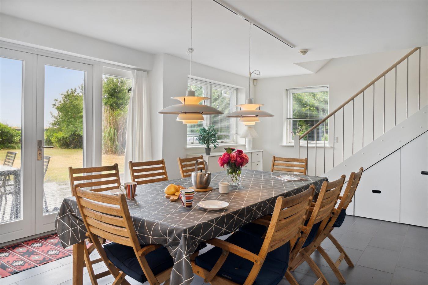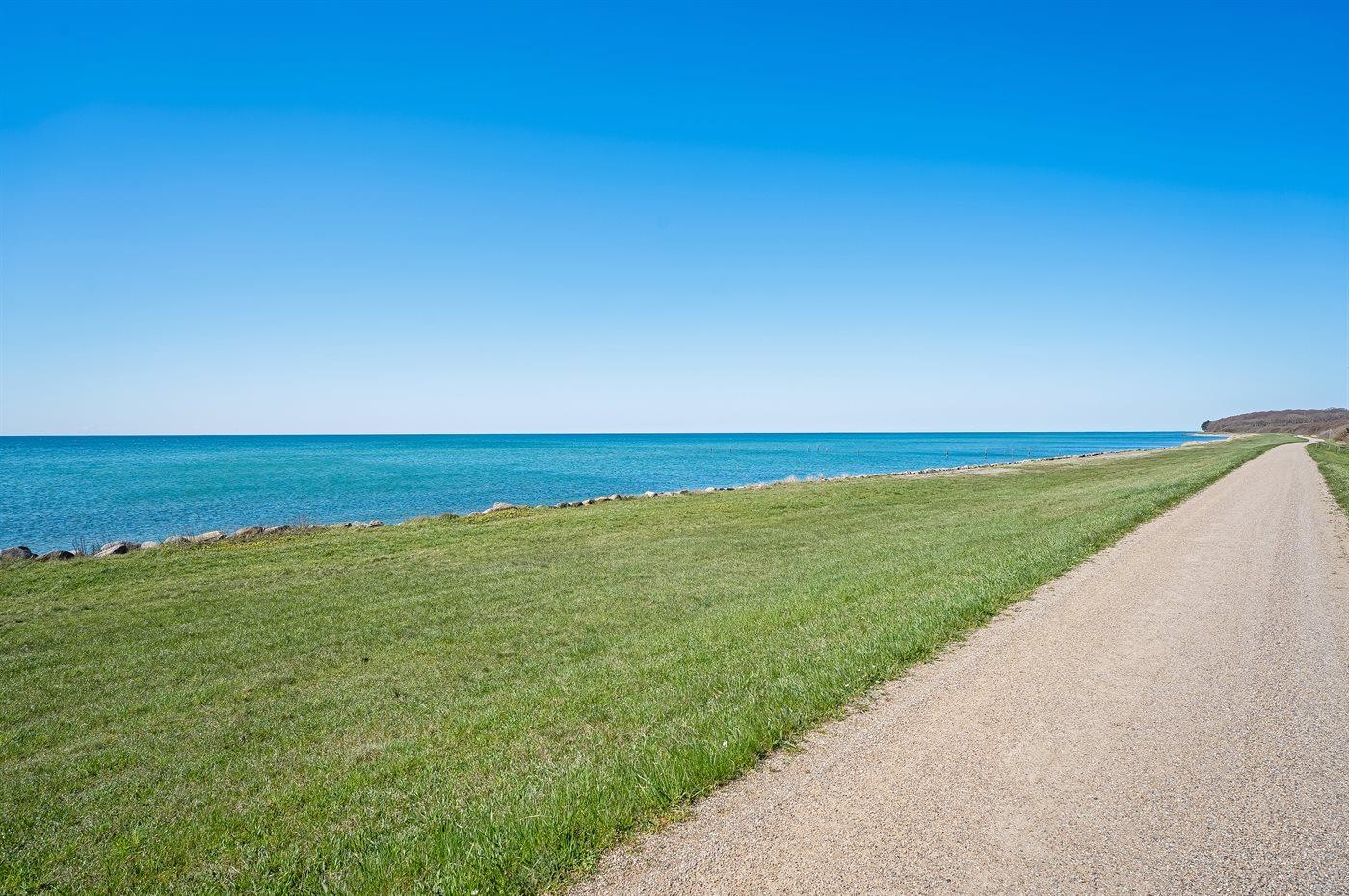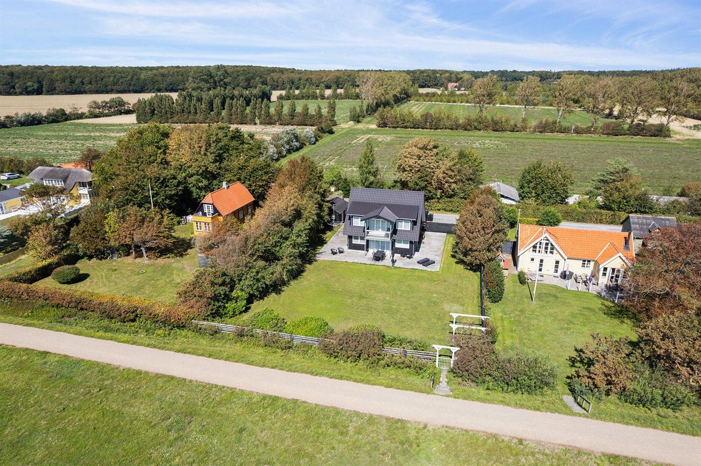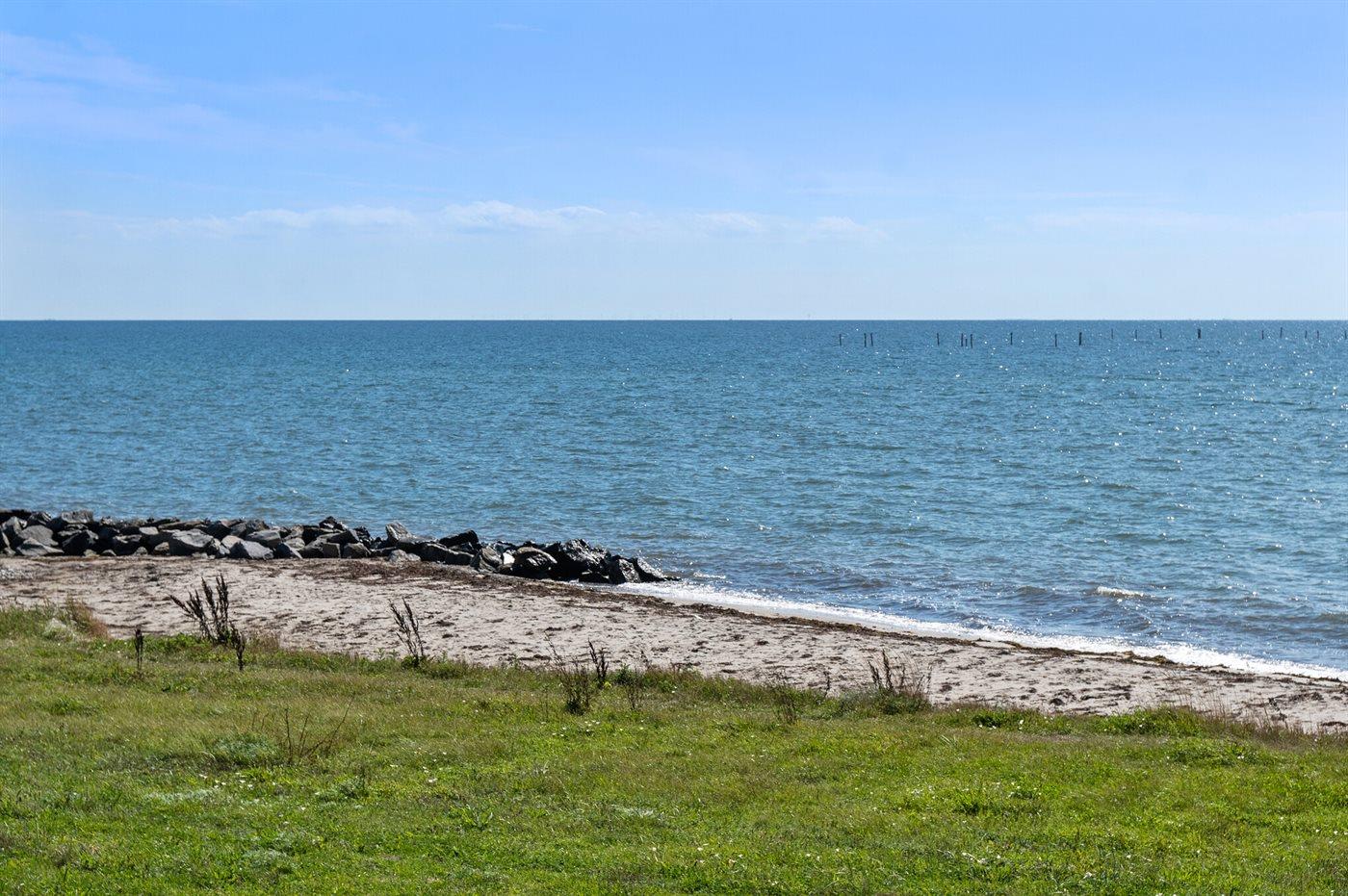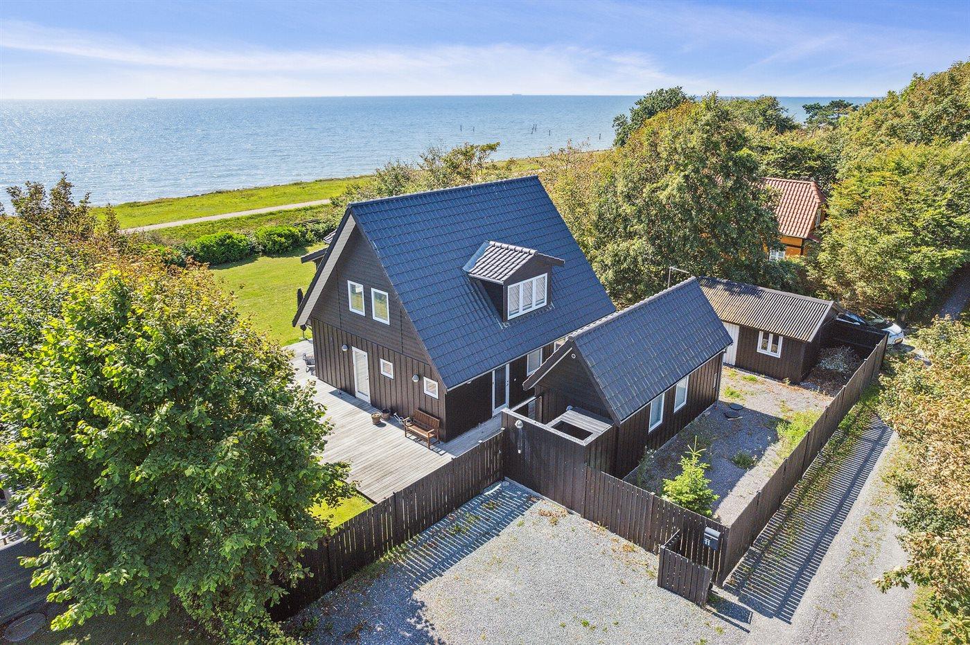 Huset ligger kun 30 m fra stranden, så man skal kun lige over diget og så er man ved vandet. Fra husets førstesal er der panoramaudsigt over havet.