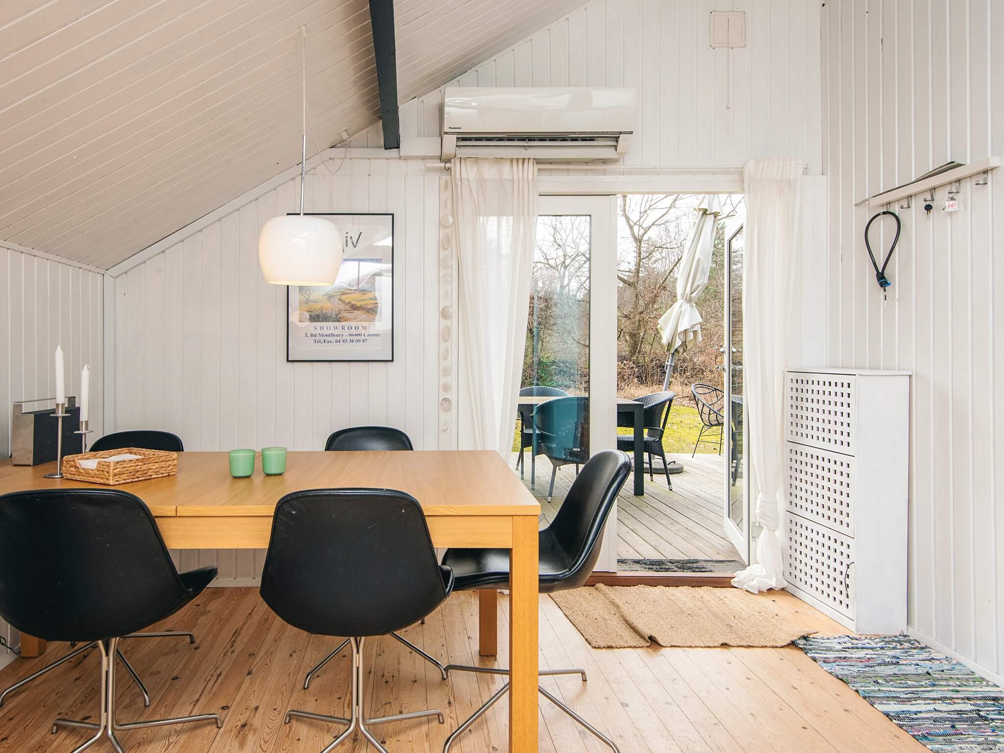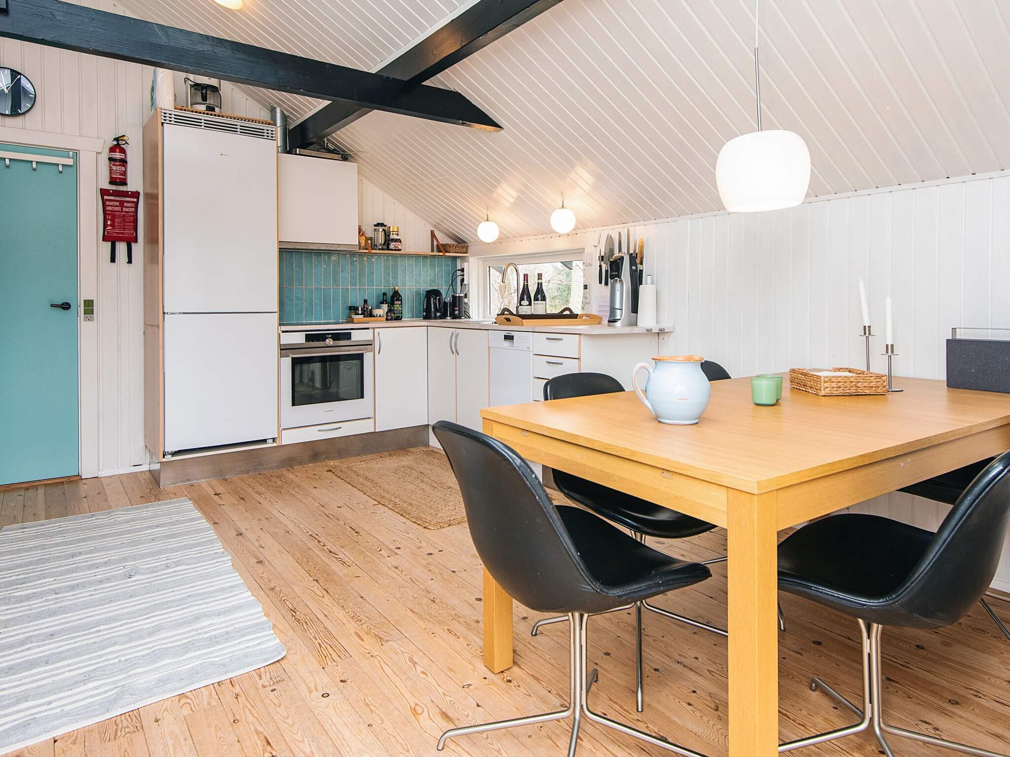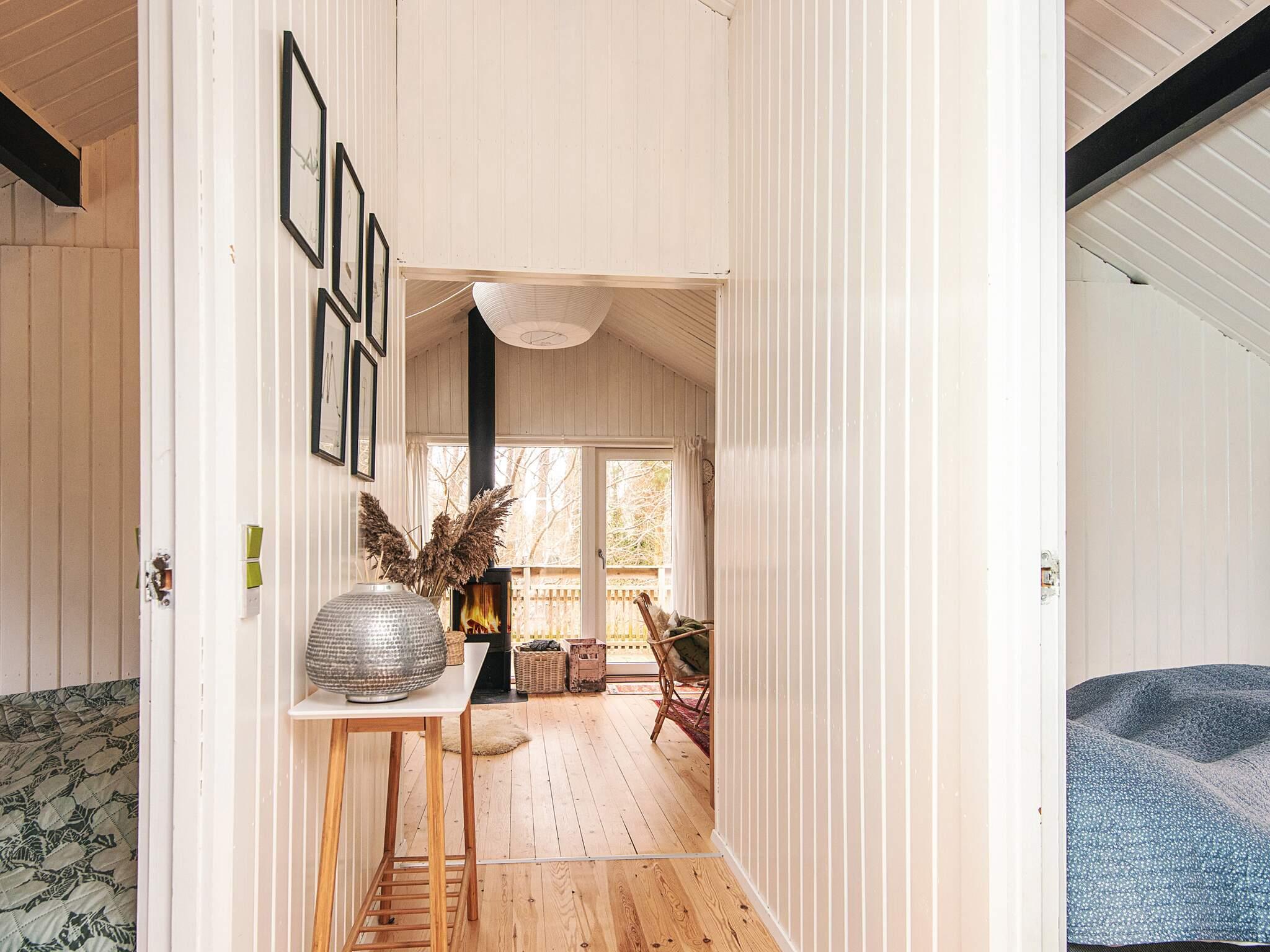 Indenfor er huset lyst og indbydende. Den hyggelige stue har en brændeovn, der skaber en varm og afslappende stemning, især på køligere dage. Store vinduespartier slipper masser af dagslys ind og åbner direkte ud til terrassen, hvilket gør det nemt at flytte mellem indendørs og udendørs. Det rummelige køkken er veludstyret og inkluderer en spiseplads, hvor alle kan samles til måltider sammen. Herfra er der også direkte udgang til terrassen, så udendørs spisning er altid en mulighed.