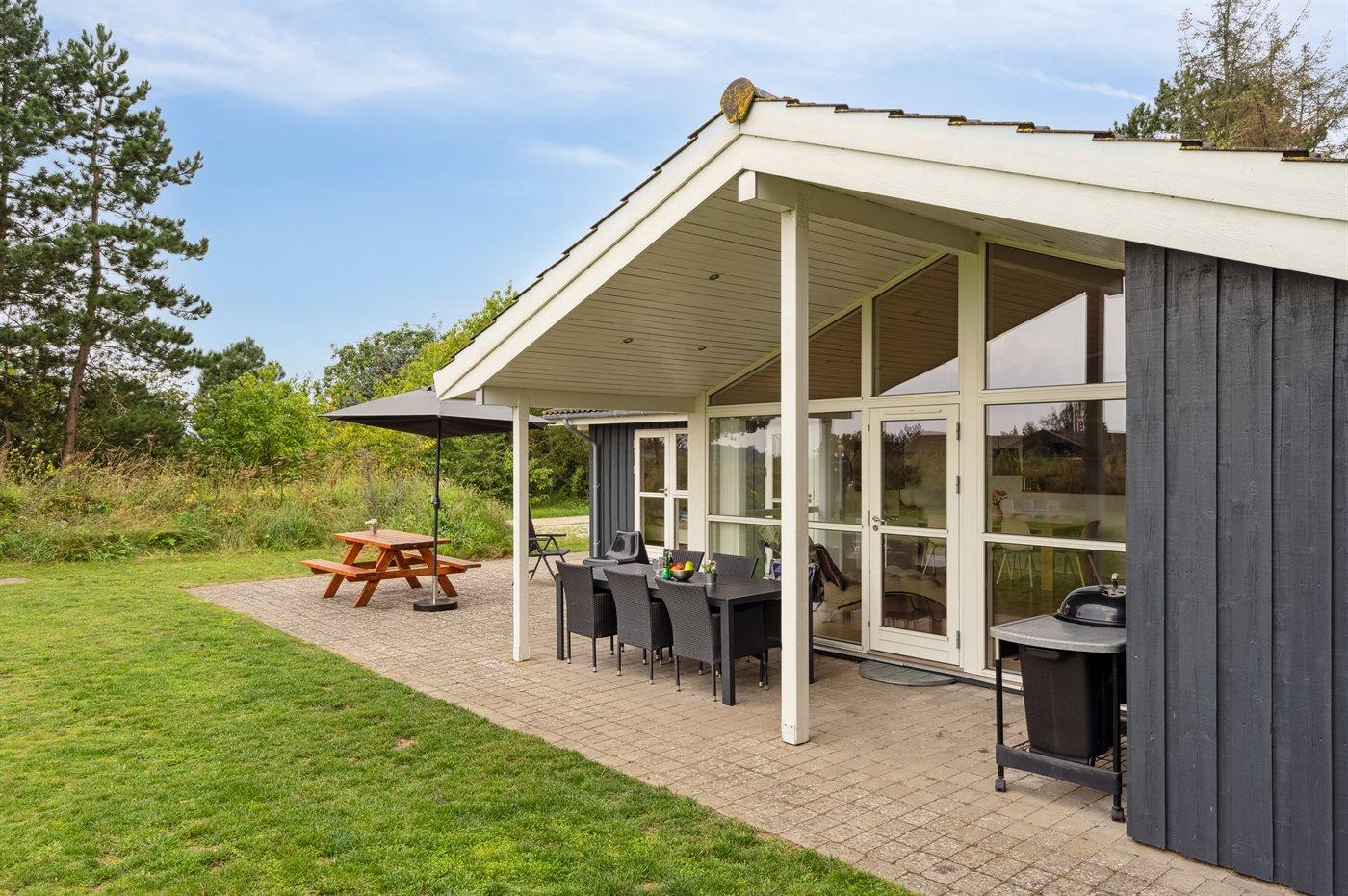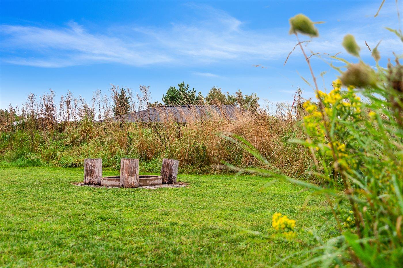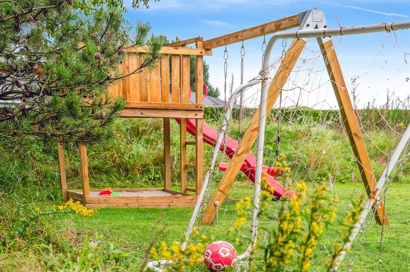 Udvendig findes en dejlig have med diverse legefaciliteter til børn samt en hyggelig bålplads. Huset har nogle skønne terrassearealer, som også er delvist overdækket, og herfra kan solen nydes dagen lang.
