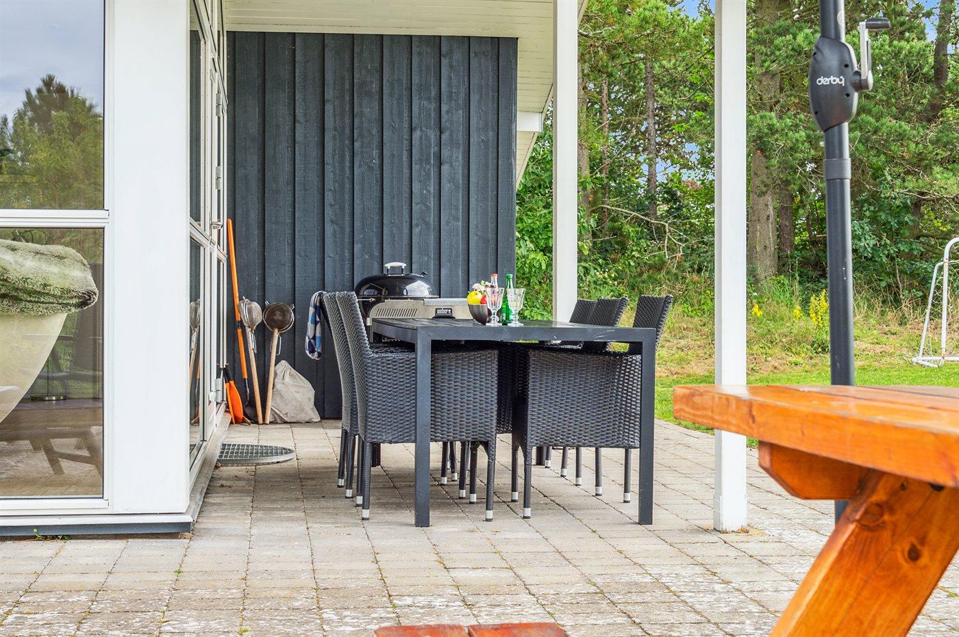 Ferieboligen er beliggende på en 1900 m² stor naturgrund. Der er 300 m til havet. Nærmeste forretning er beliggende i en afstand af 3000 m. Til ferieboligen hører åbent terrasseareal. Desuden er der overdækket terrasse. Gynge. Sandkasse. Legetårn. Rutchebane. Fodboldmål. Bålsted. Grill til rådighed. Parkering ved ferieboligen.