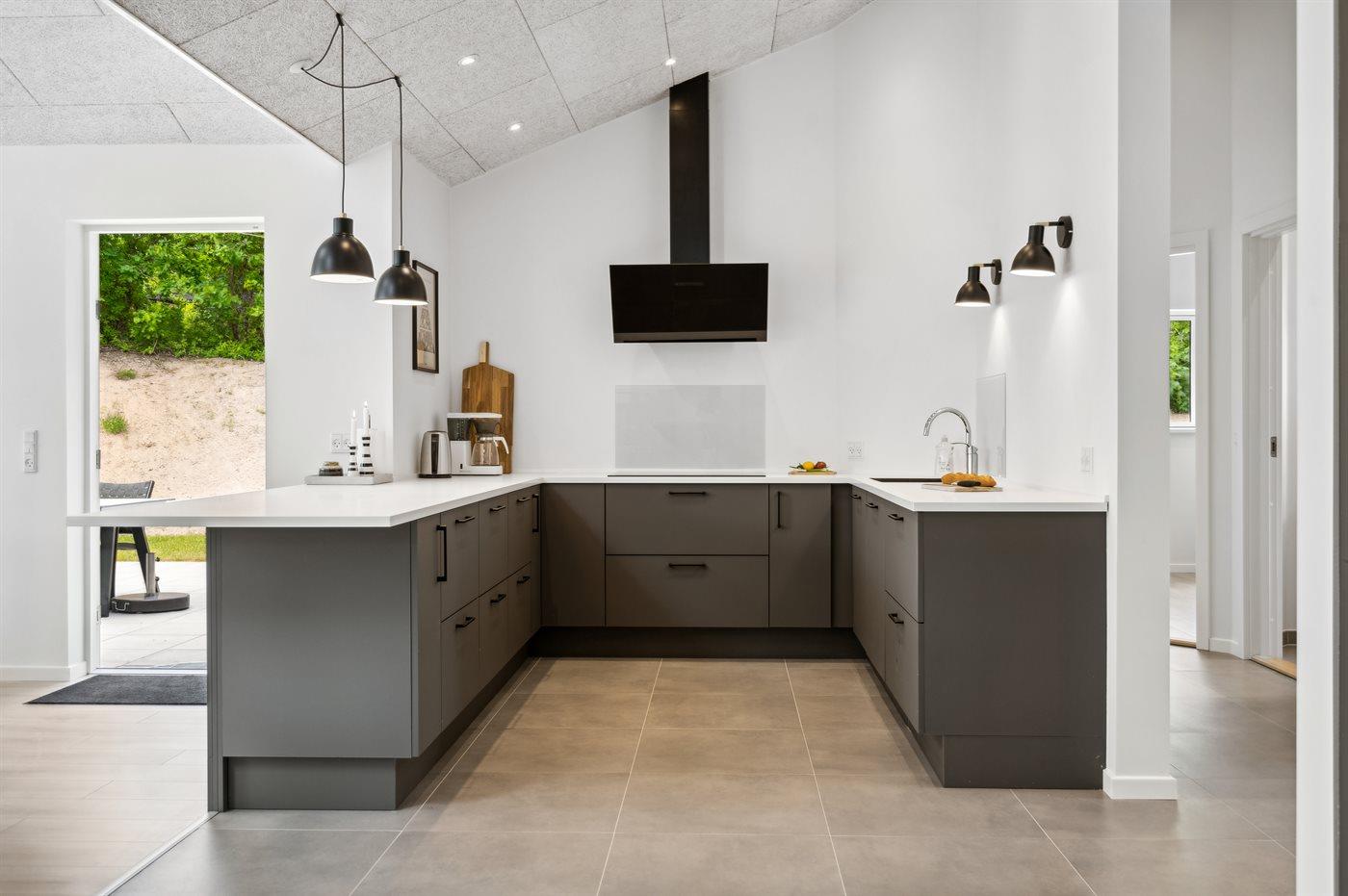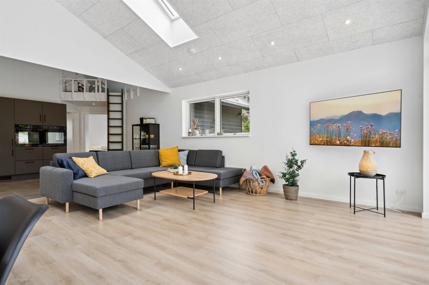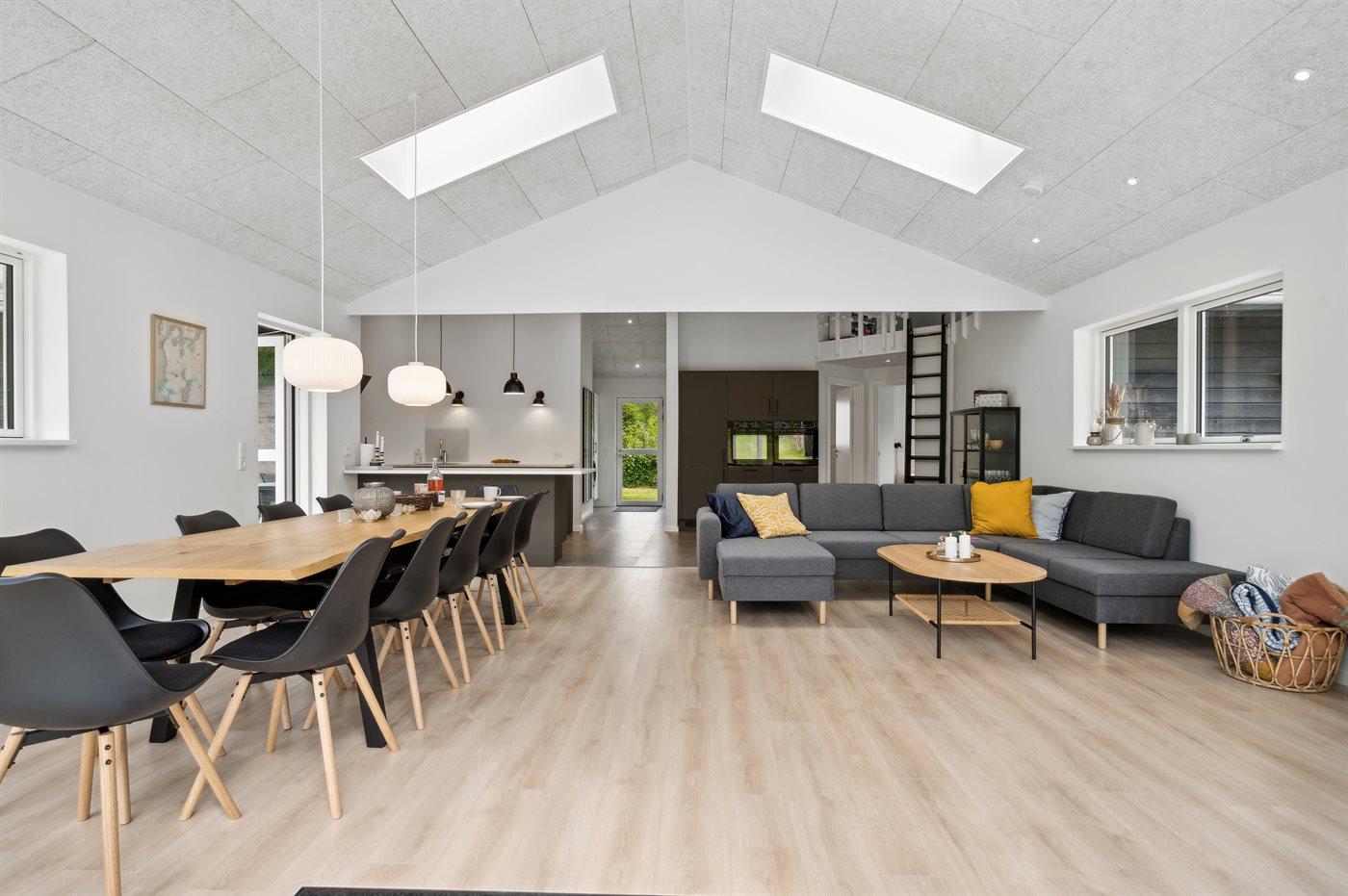 Sommerhuset fremstår yderst moderne med bl.a. et stort, flot køkken kombineret med stuen, som er husets samlingssted. Herfra er der via de store vinduer en skøn udsigt til den smukke og fredfyldte have.