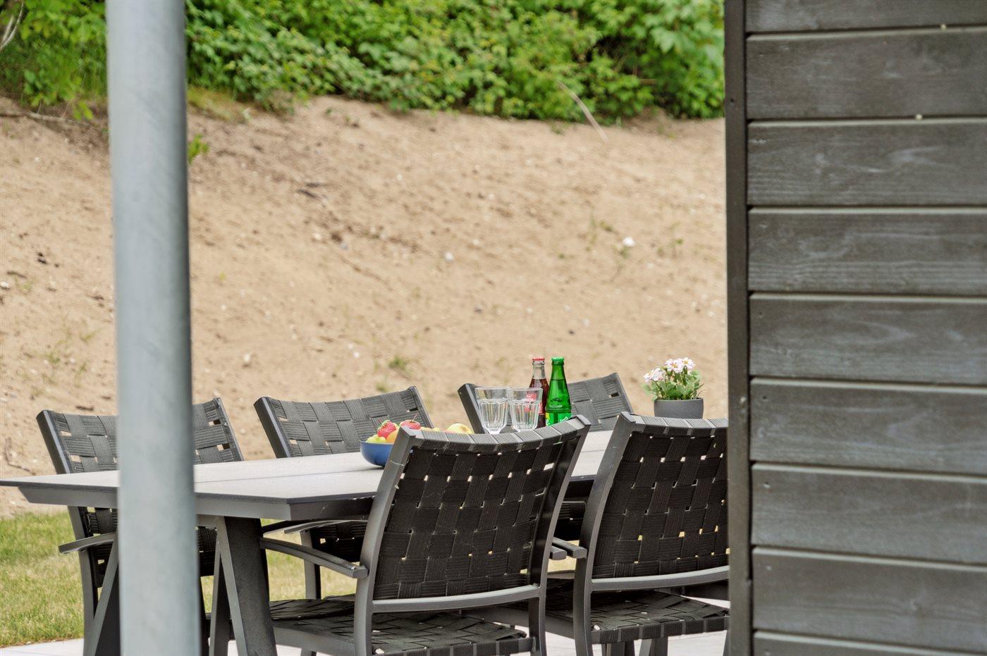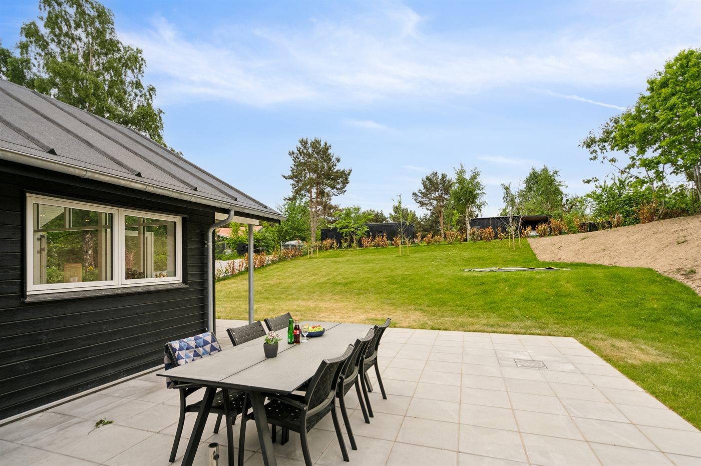 Sommerhuset har et fantastisk og delvist overdækket terrasseareal – her er det altid muligt at finde en krog med læ, hvor man kan sidde og nyde solen. Fra terrassen er der et rigtig godt udsyn over haven, hvor der bl.a. findes en stor trampolin, som børnene kan hygge sig på imens de voksne nyder en kop kaffe eller et glas vin på den dejlige terrasse.