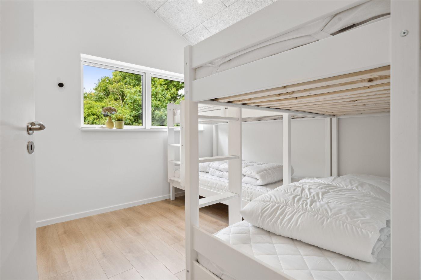 Der er i alt 4 soveværelser. Sovepladserne fordeler sig på: 6 sovepladser i dobbeltsenge. 4 sovepladser i køjesenge. 2 sovepladser på madrasser. 2 af disse sovepladser befinder sig på husets hems. Derudover er der 1 stk. barneseng.