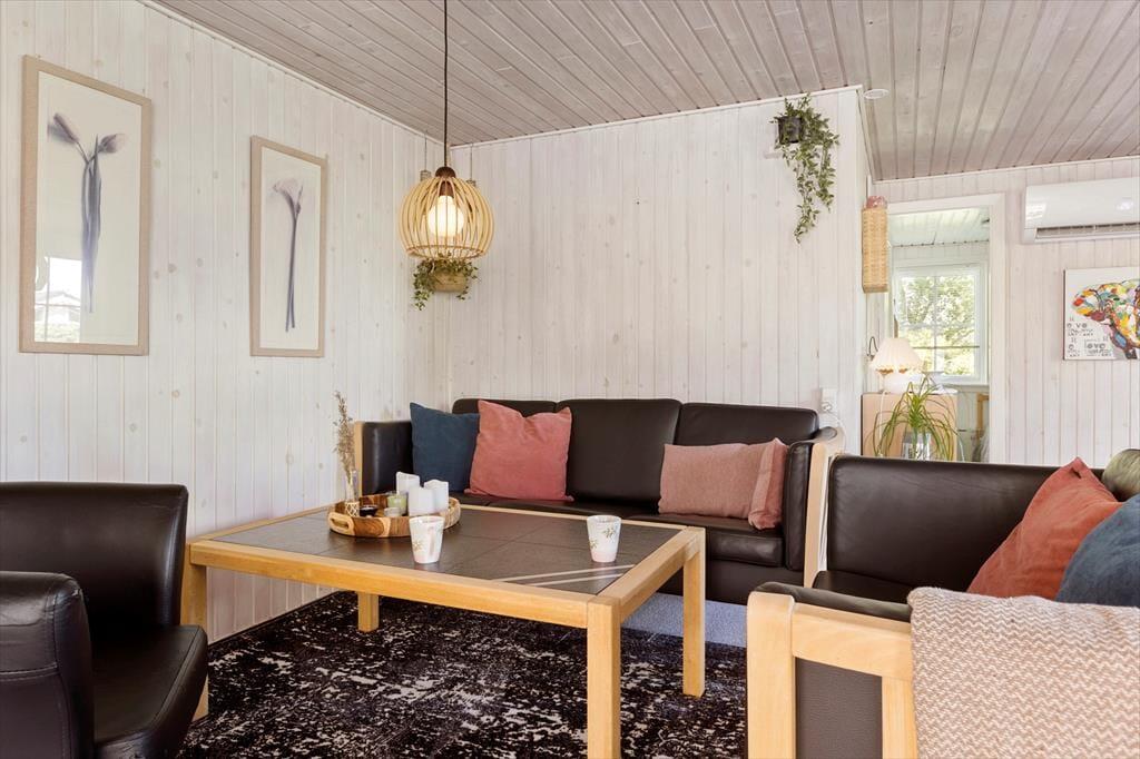 Når du træder ind i sommerhuset, bliver du mødt af en lys og imødekommende atmosfære. Den dejlige havestue er husets hjerte – her kan du sidde med en kop kaffe og nyde udsigten til den store have, mens solens stråler strømmer ind gennem de store vinduespartier. Huset er indrettet med et køkken for sig og en stue, hvor I kan samles om måltiderne, og huset byder på en varmepumpe, der skaber varme på kølige aftener. Efter en lang dag i det fri kan du forkæle dig selv med lidt ekstra velvære i husets sauna, som gør ferien endnu mere afslappende.