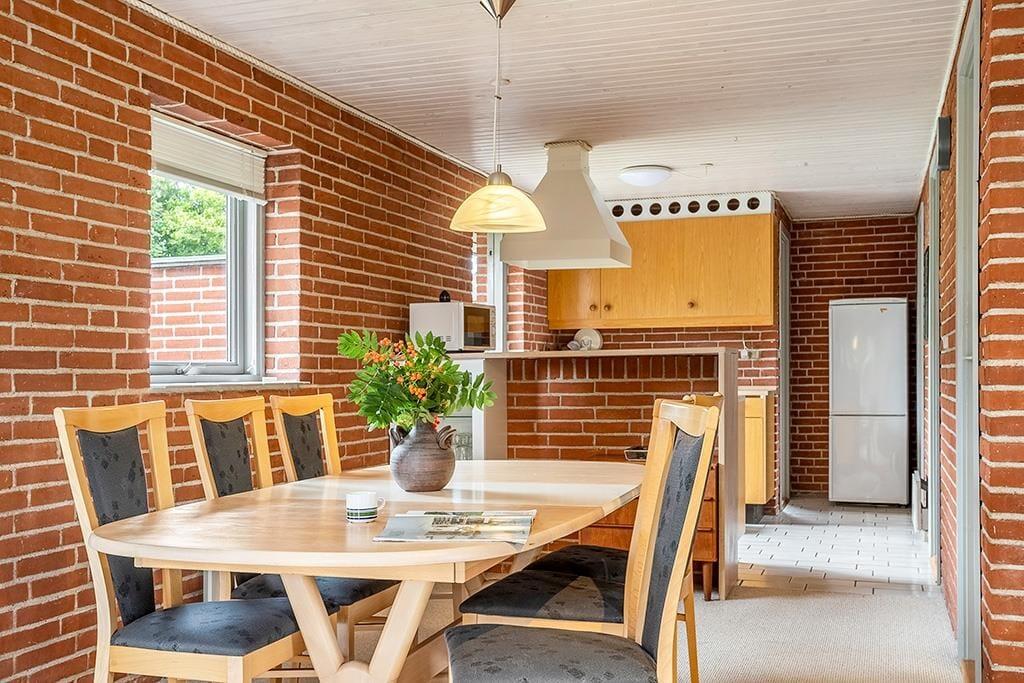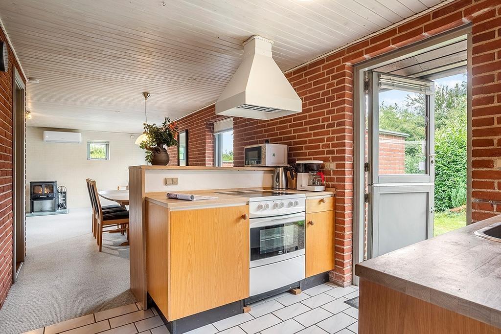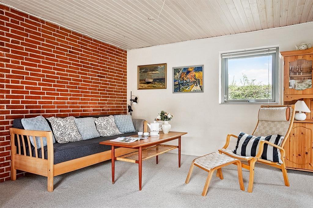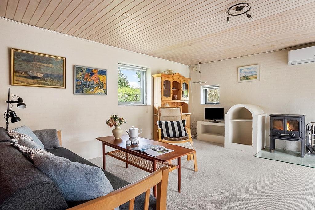 Den åbne planløsning skaber naturlige opholdsrum, hvor familien kan samles til afslapning, spil og hyggelige stunder. Køkkenet ligger i direkte forbindelse med spiseafdelingen, hvilket gør det nemt at lave mad sammen. Huset rummer to soveværelser – det ene med en dobbeltseng, det andet med en køjeseng – samt en sovesofa i stuen.