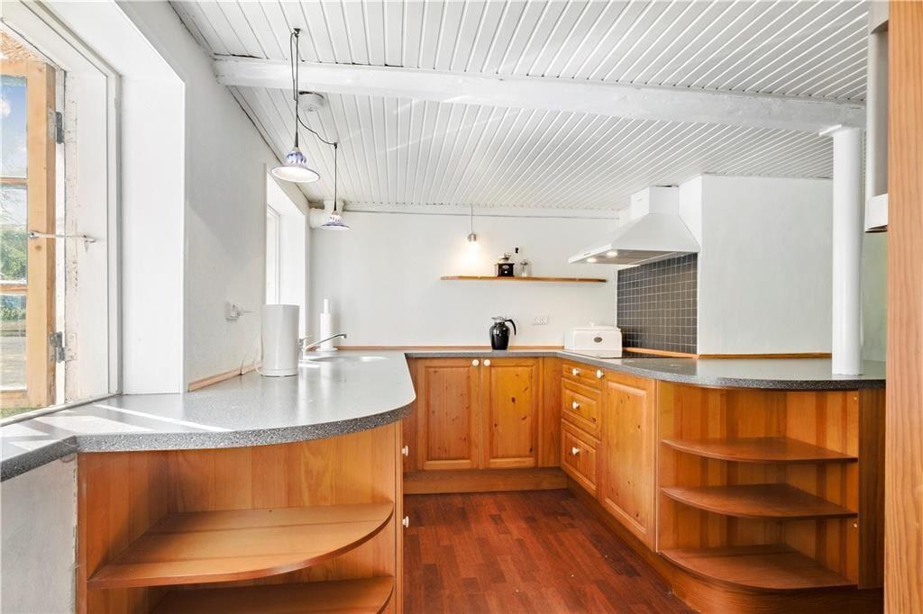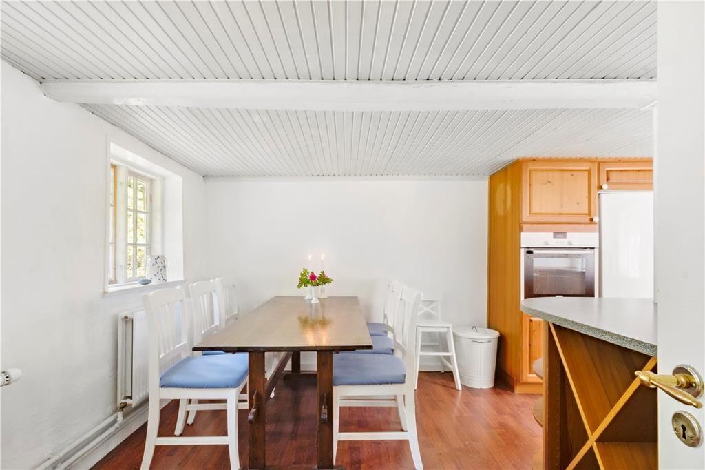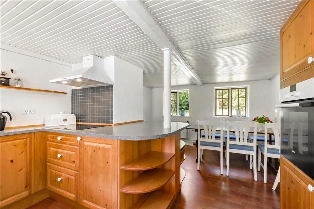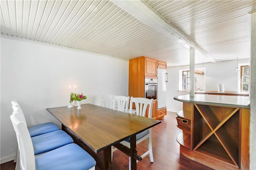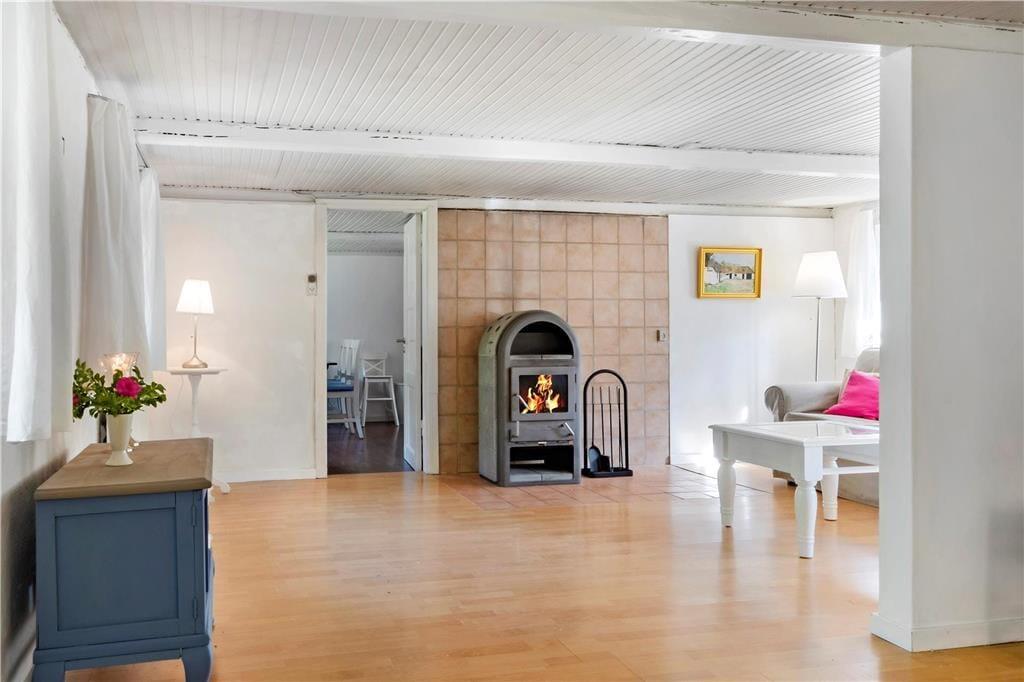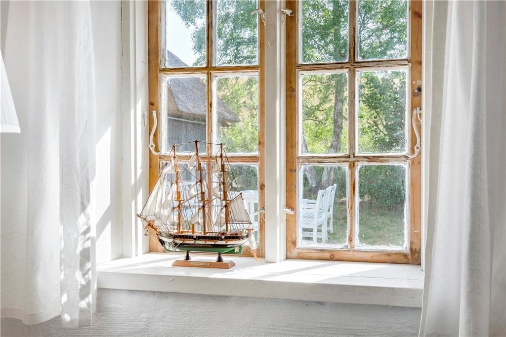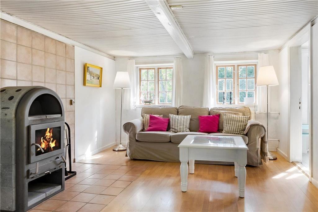 Mulbjerggaard, som den stråtækte ejendom passende hedder, har ligget her i det smukke kystlandskab siden 1870. Inden døre er rummene blevet moderniseret, hvilket blandt andet køkkenet og badeværelset vidner om, og det lyse møblement er udvalgt, så det passer godt til den klassiske bondehusstil. Opholdsafdelingen består af et rummeligt spisekøkken og en stor stue med brændeovn, mens to badeværelser ligger side om side ved entréen. Efter en lang dag med udflugter, afslapning i haven og hyggestunder inden døre kan I glæde jer til at sove længe på de fire soveværelser, hvoraf to er indrettet med en enkeltseng, det tredje med to enkeltsenge og det fjerde med en dobbeltseng. I stuen står der derudover en sovesofa, så i alt kan syv personer være her i huset – og op til to husdyr er for øvrigt også velkomne, hvis I gerne vil have hunden med på ferie.