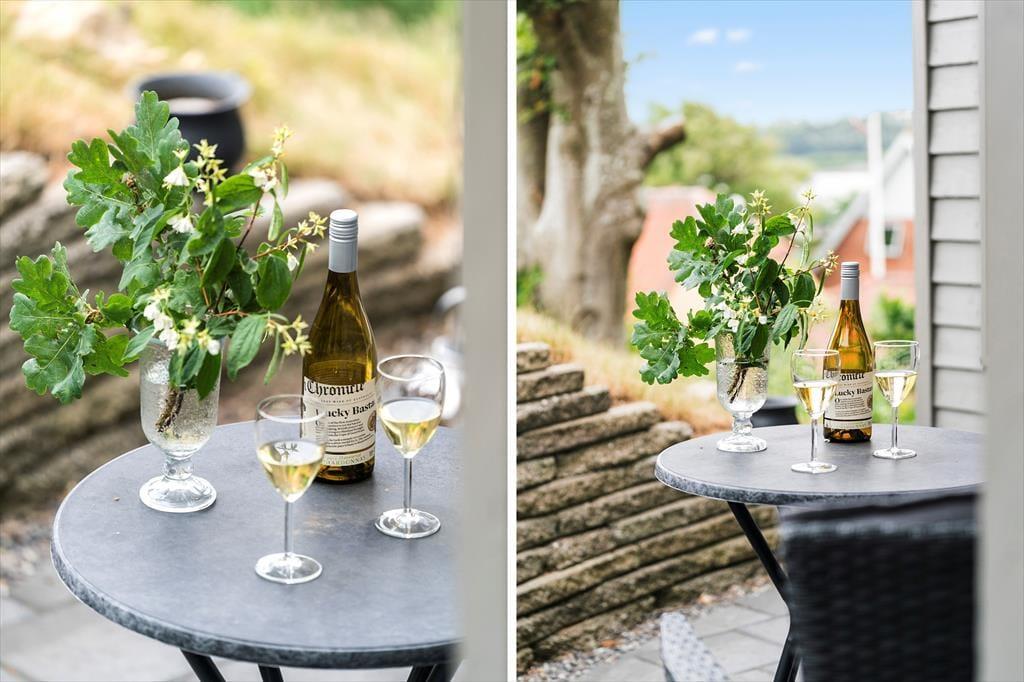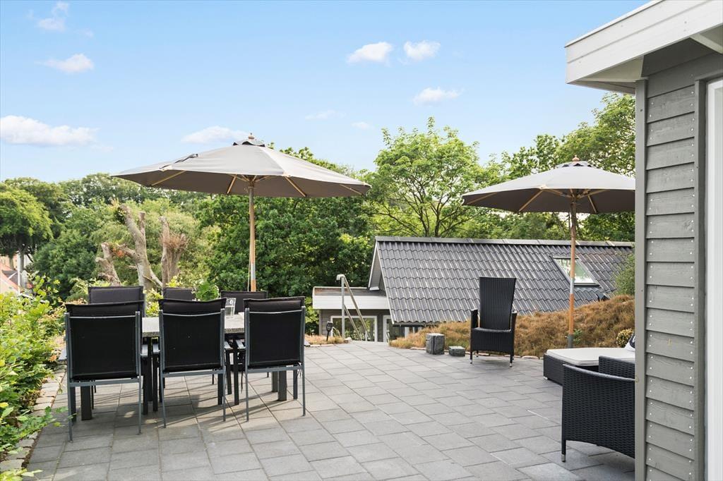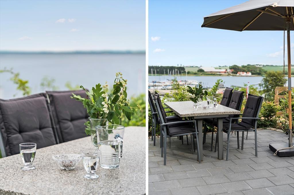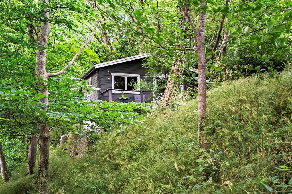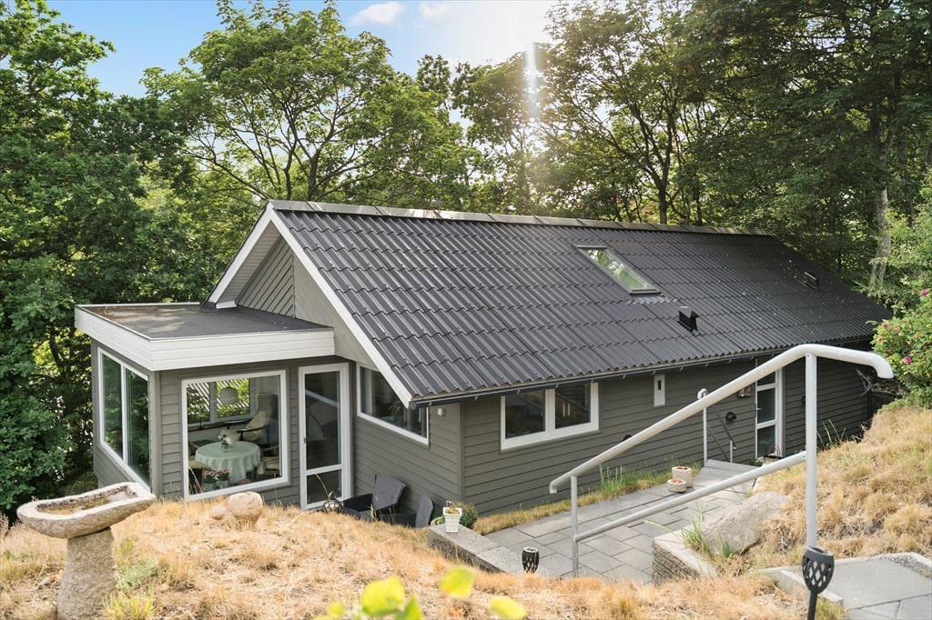 Når vejret er godt, kan I se frem til at dase og stort nyde ferielivet på den kuperede skovgrund. Sommerhuset er bygget ind i en skråning med omkringliggende trappearealer, og selvom der er mange træer, er der sørget for, at I får frit udsyn til fjorden og lystbådehavnen. På begge sider af sommerhuset har I hyggelige terrasseområder at opholde jer på, men det allerbedste terrasseareal er nu den store udsigtsterrasse, der ligger cirka fire meter længere oppe på naturgrunden. Her er panoramaudsigten virkelig storslået, og I får rig mulighed for at nyde solen og suge landskabet til jer.