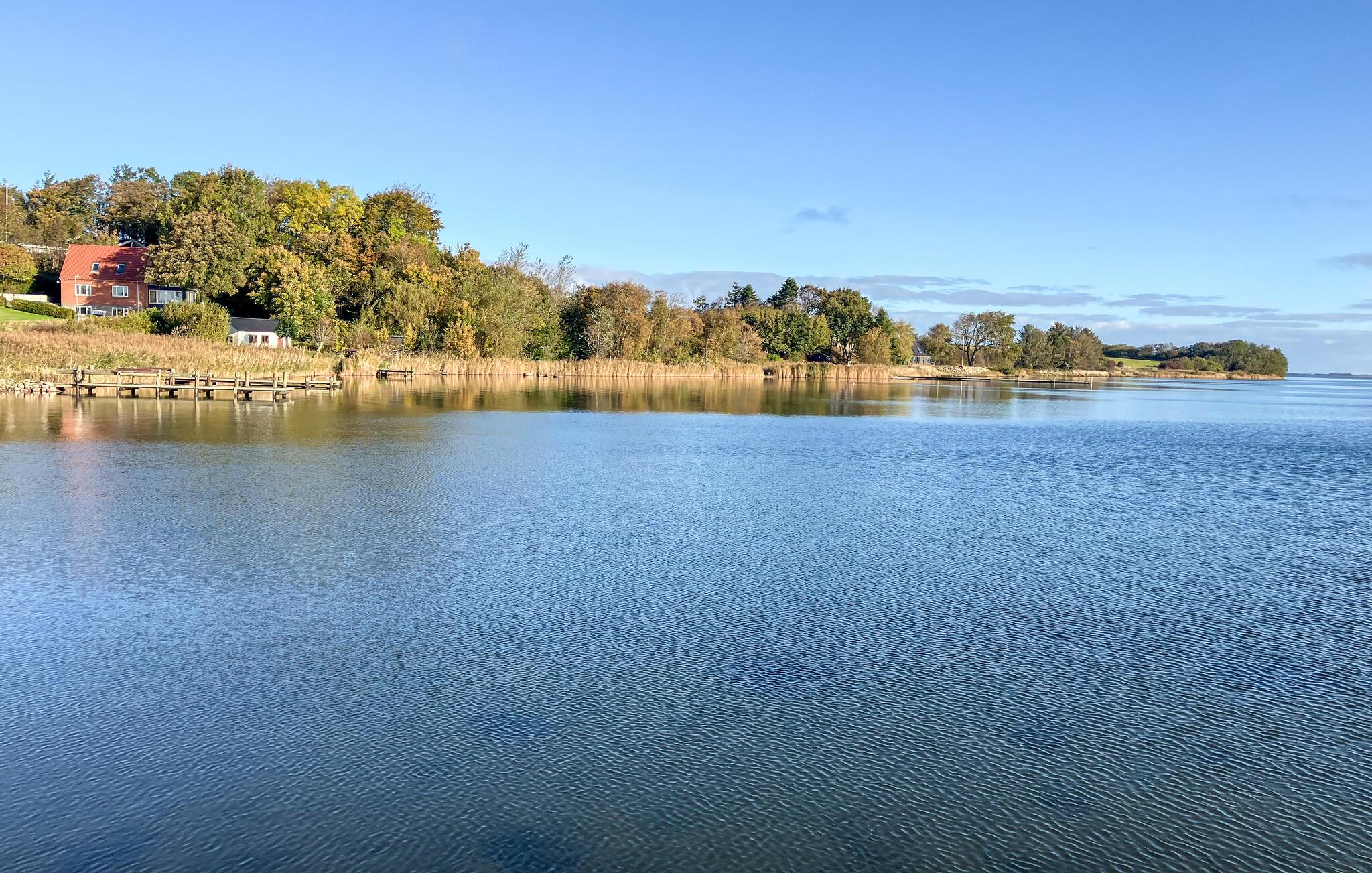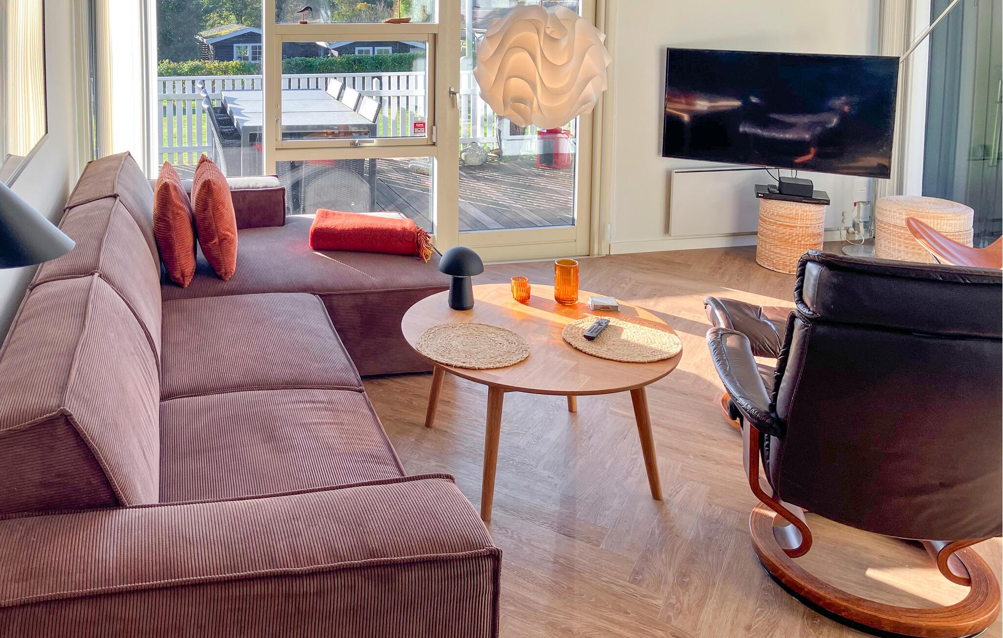 Oplev en rolig pause i et stilfuldt feriehus, der ligger i et fredeligt sommerhusområde blot en kort gåtur fra Limfjorden. Den åbne stue med store vinduer, lyst træ og harmoniske farver skaber en indbydende atmosfære. Sæt jer godt til rette i den hyggelige sofakrog, se en film, eller nyd blot udsigten over den velplejede have. I det veludstyrede køkken kan I tilberede jeres måltider og spise sammen ved spisebordet, mens sollyset falder ind gennem glasfacaden.