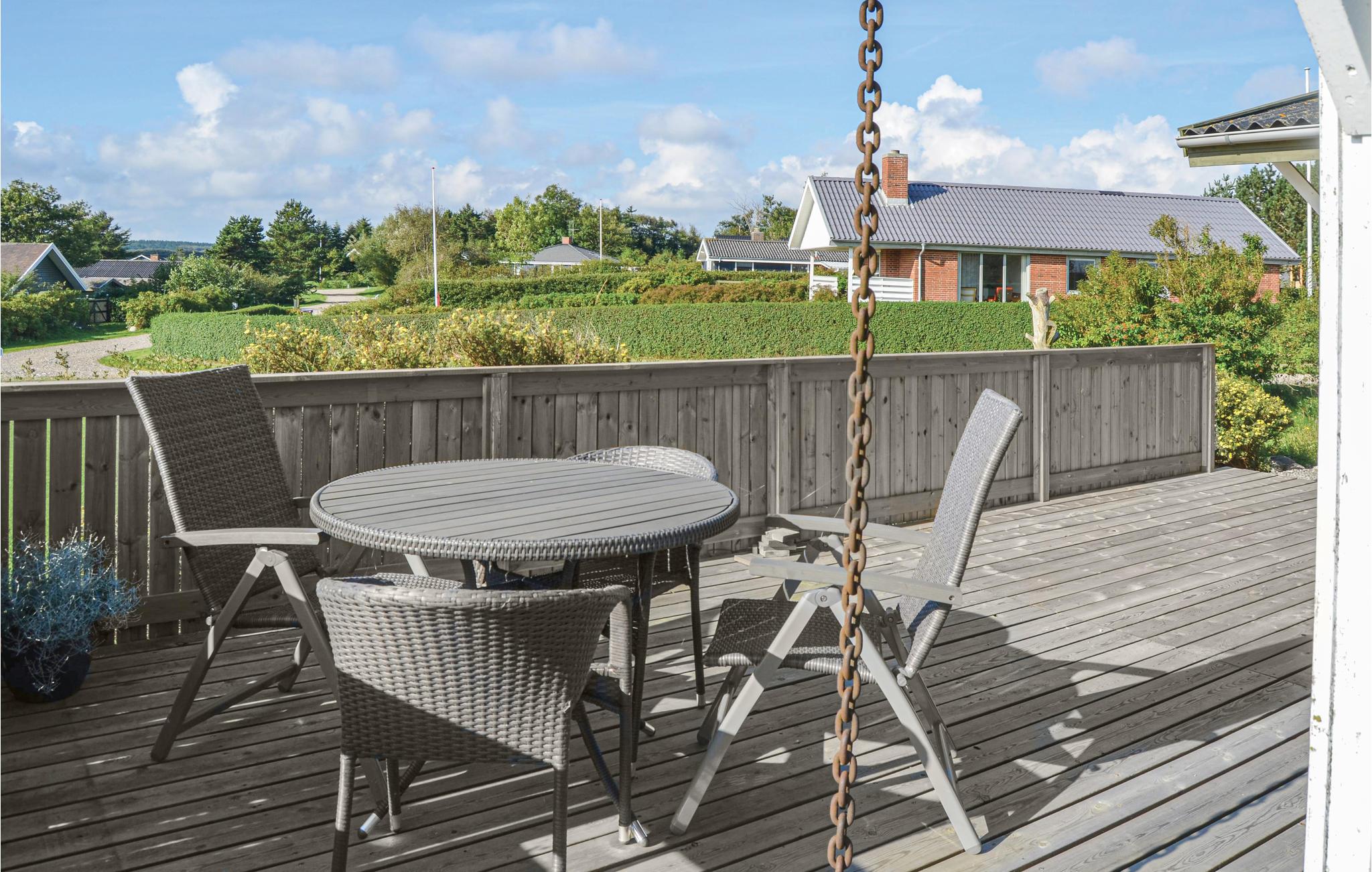 Udendørs finder I en stor græsplæne, som indbyder til mange timers leg og spil. I har også en dejlig træterrasse, som er delvist overdækket, så I kan nyde naturen og den friske luft i al slags vejr. På terrassen har I havemødbler og grill, så I kan samle familien til hyggelige grillaftener.