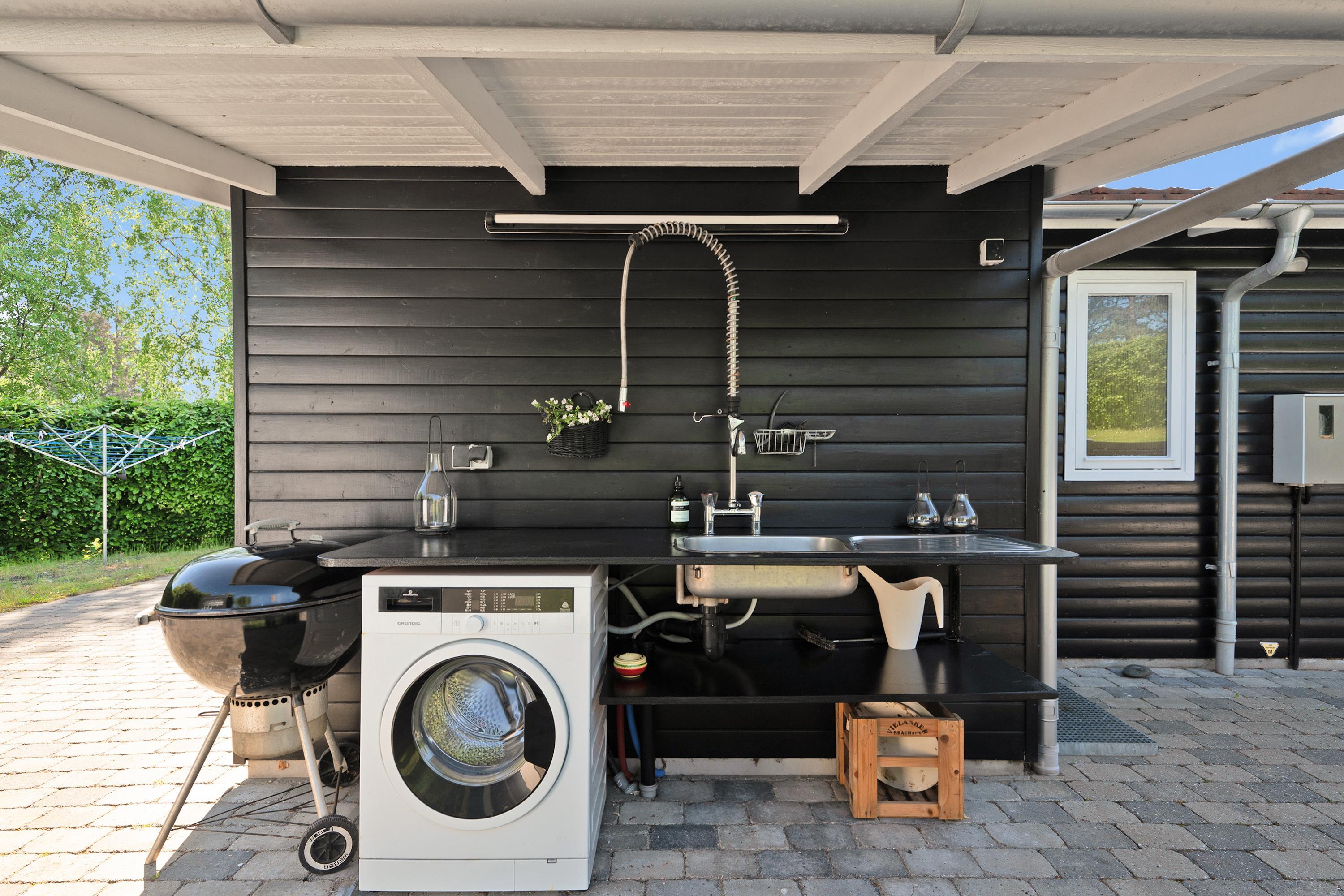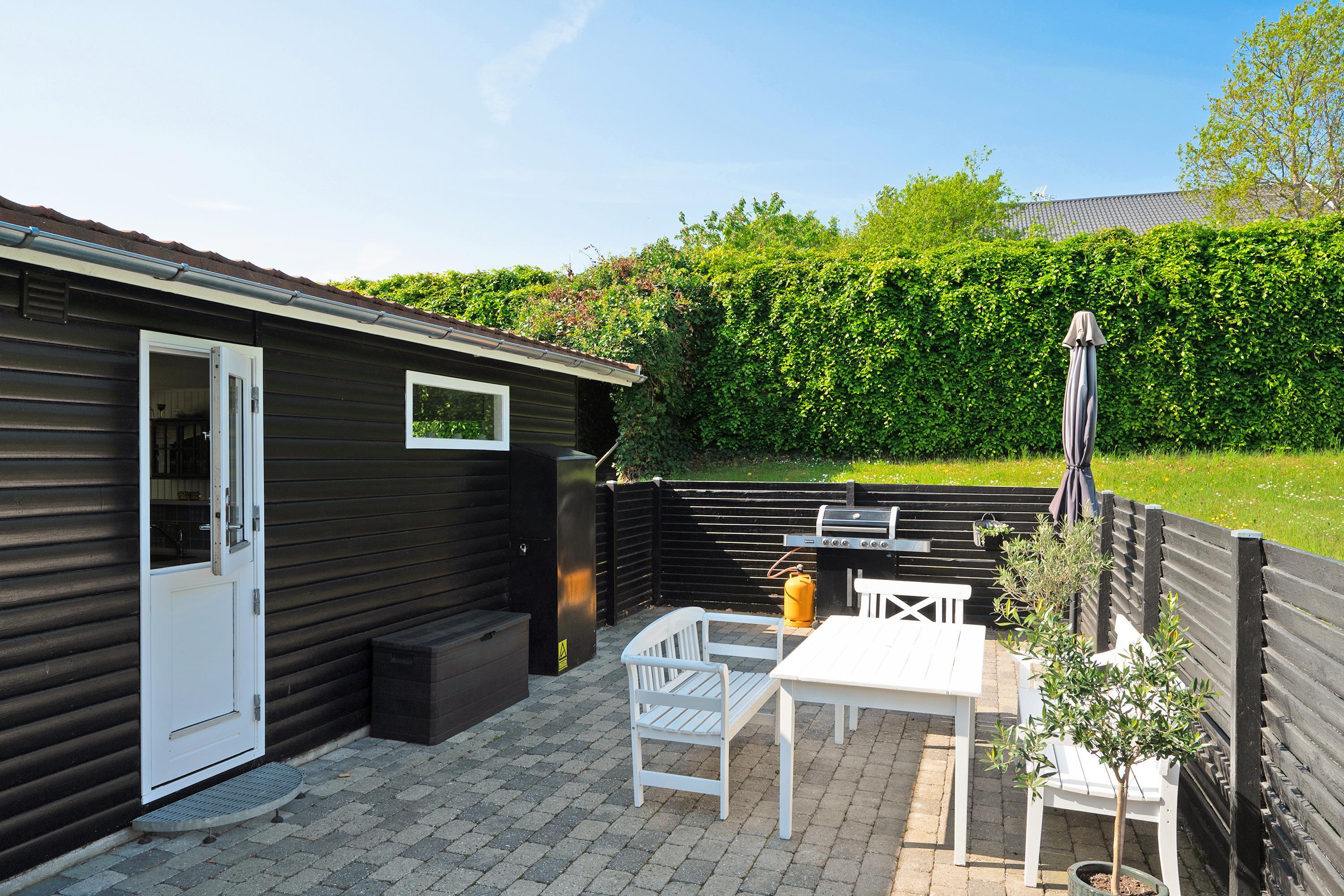Hyggeligt og renoveret feriehus nær Holme Strand med overdækket terrasse og naturgrund.