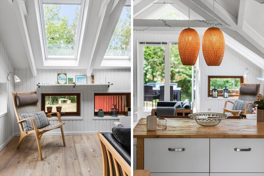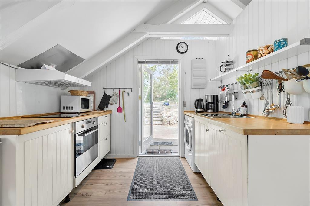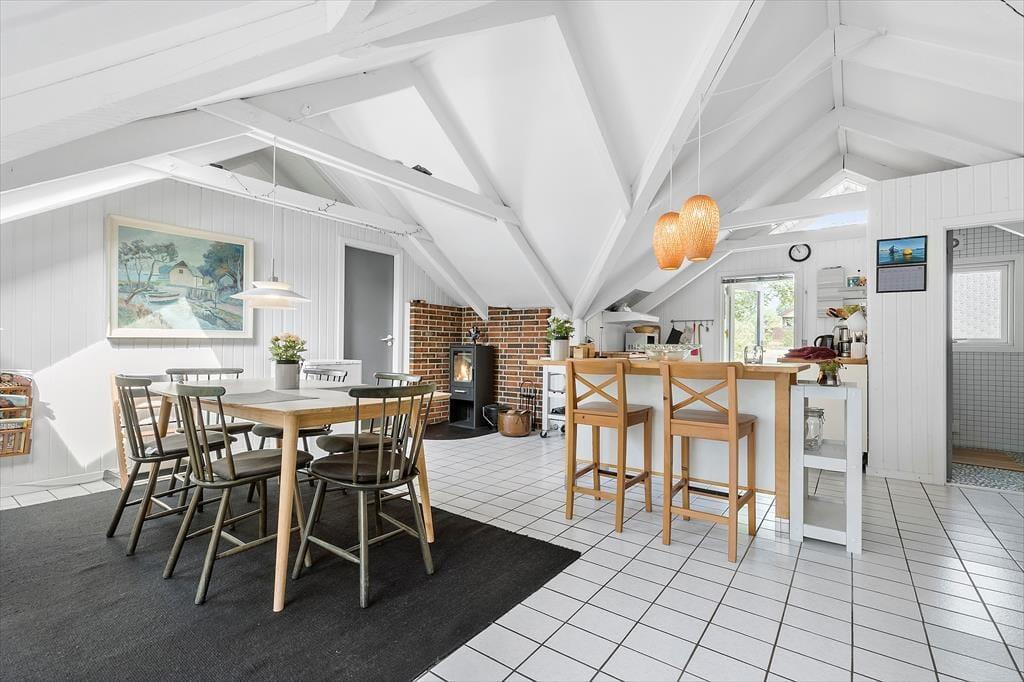 Lige uden for Ebeltoft venter et hyggeligt og velholdt feriehus, hvor feriefølelsen hurtigt falder på plads. Indenfor mødes du af en lys og rar stue, hvor brændeovnen knitrer på de kølige aftener, og varmepumpen sørger for et behageligt indeklima. Stuen ligger i åben forbindelse med det lille, men rigtig velfungerende køkken, hvor der både er opvaskemaskine og vaskemaskine – praktisk, når hverdagen gerne må glide let, selv på ferien. Her finder I også en spiseafdeling med klinkegulv, perfekt til langsomme morgenstunder og gode måltider.