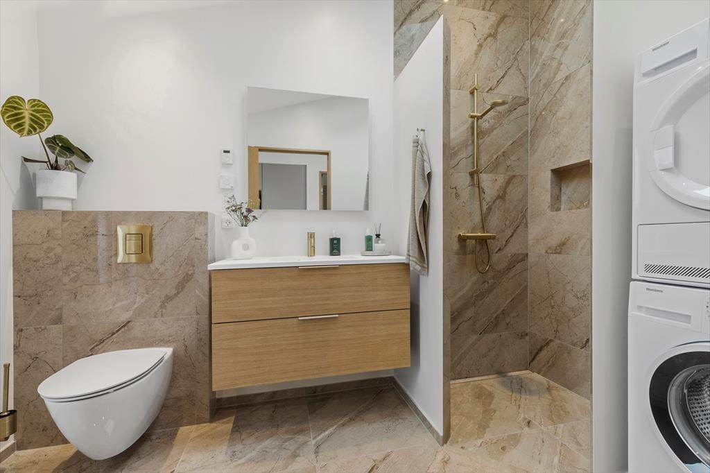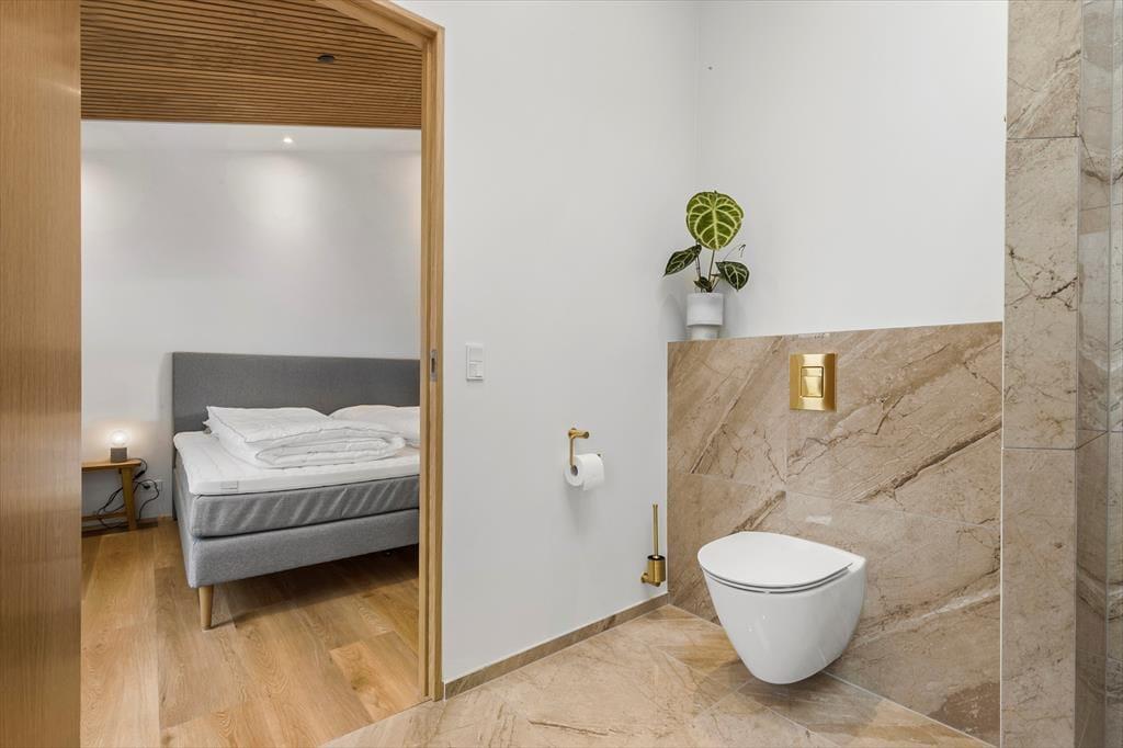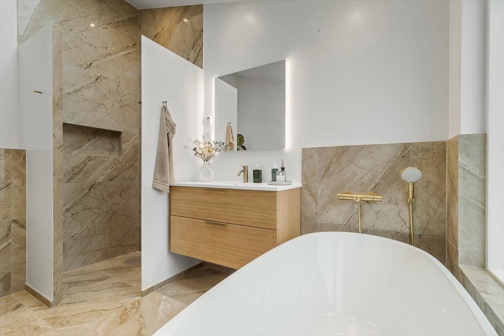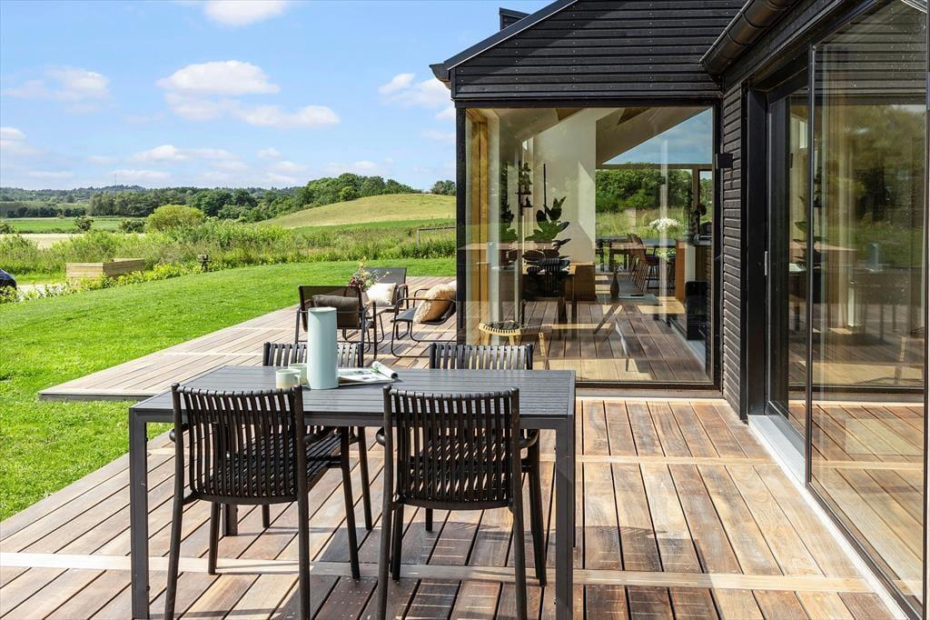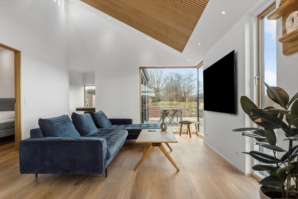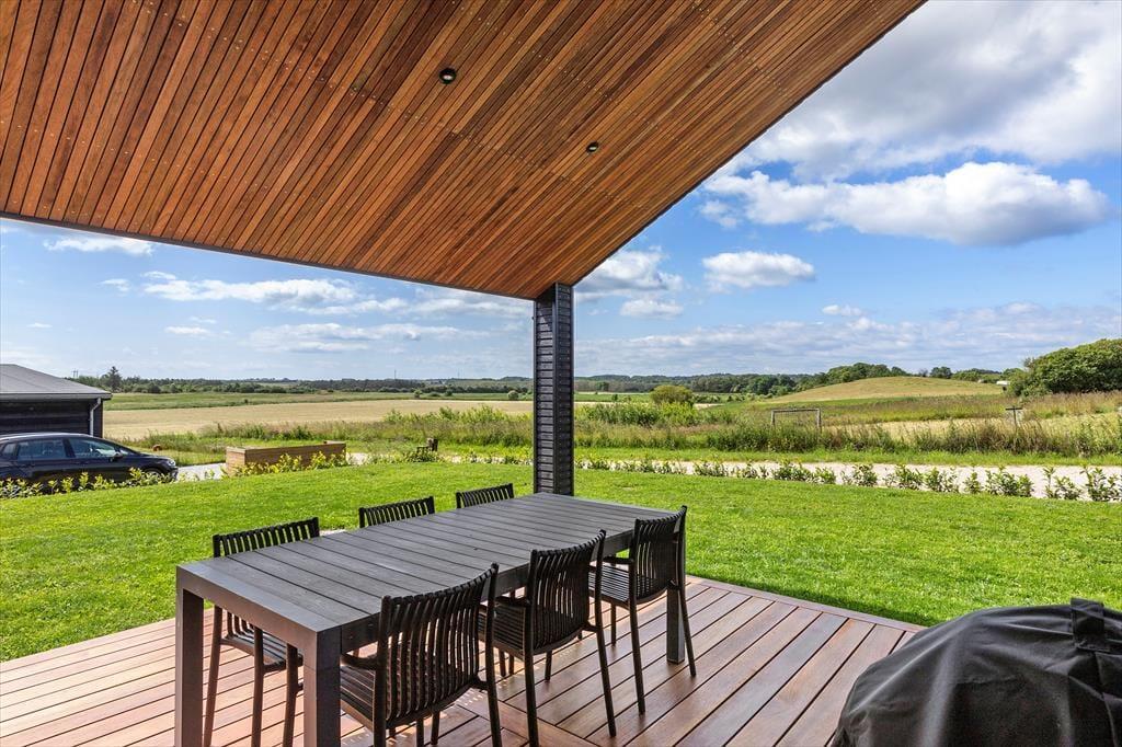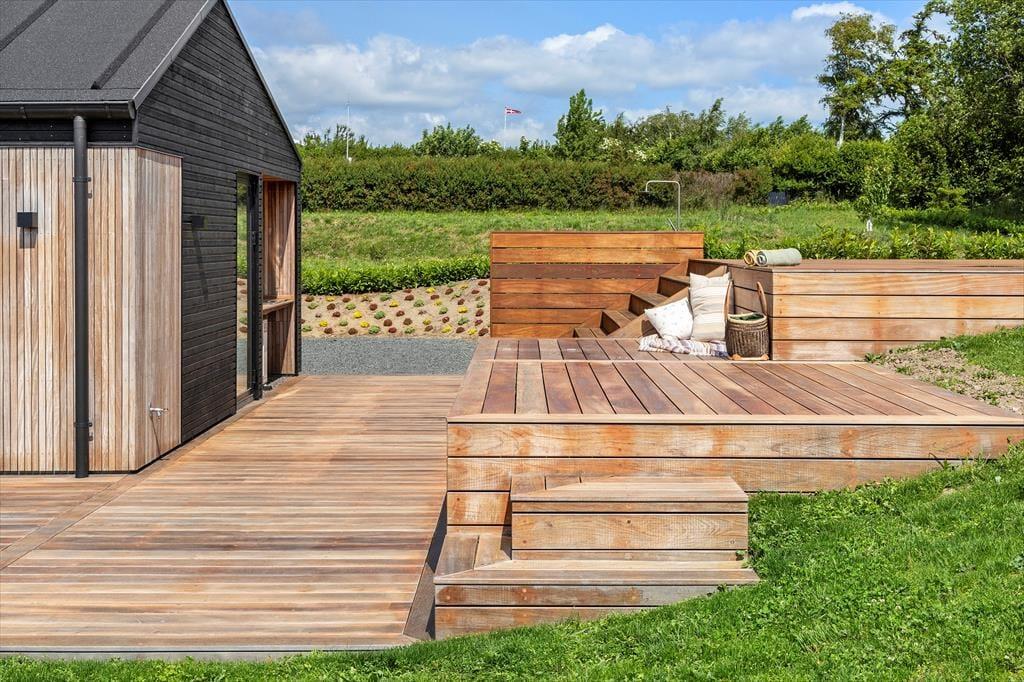 Fra spiseområdet kan du træde direkte ud på den store, overdækkede terrasse, hvor du kan nyde en rolig morgen med en kop kaffe eller samle familien til en hyggelig grillaften. Haven er ideel til både leg og afslapning – måske en fodboldkamp med børnene, mens du tænder op i grillen? På husets bagside finder du et skønt terrasseområde i flere niveauer, hvor du kan solbade, nyde din yndlingsmusik eller tage en forfriskende dukkert i den udendørs badekar. Fyld det med koldt vand og prøv et opkvikkende isbad – en skøn måde at starte dagen på!