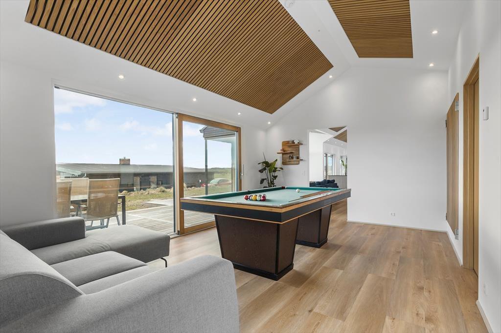 Træd indenfor i en lys og hyggelig oase, hvor feriestemningen straks indfinder sig. Husets hjerte er det store, åbne opholdsrum med en dejlig spiseplads og en blød sofa, hvor du kan smide benene op efter en dag fuld af oplevelser. Køkkenet er fuldt udstyret med alt, hvad du behøver – opvaskemaskine, ovn, kogeplader og en rummelig køle-fryseskab, så du nemt kan trylle lækre feriemåltider frem. Huset har tre skønne soveværelser: et med to enkeltsenge, et med dobbeltseng og en hyggelig læsekrog ved vinduet samt et master bedroom med dobbeltseng og eget badeværelse med badekar – perfekt til en rolig stund efter en dag i det fri. Derudover er der endnu et badeværelse med bruser, vaskemaskine og tørretumbler. Som prikken over i’et byder huset på et aktivitetsrum med billardbord og sofa – oplagt til en hyggelig aften med sjove dueller og grin.