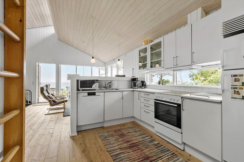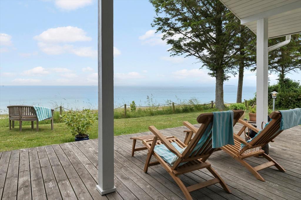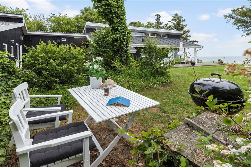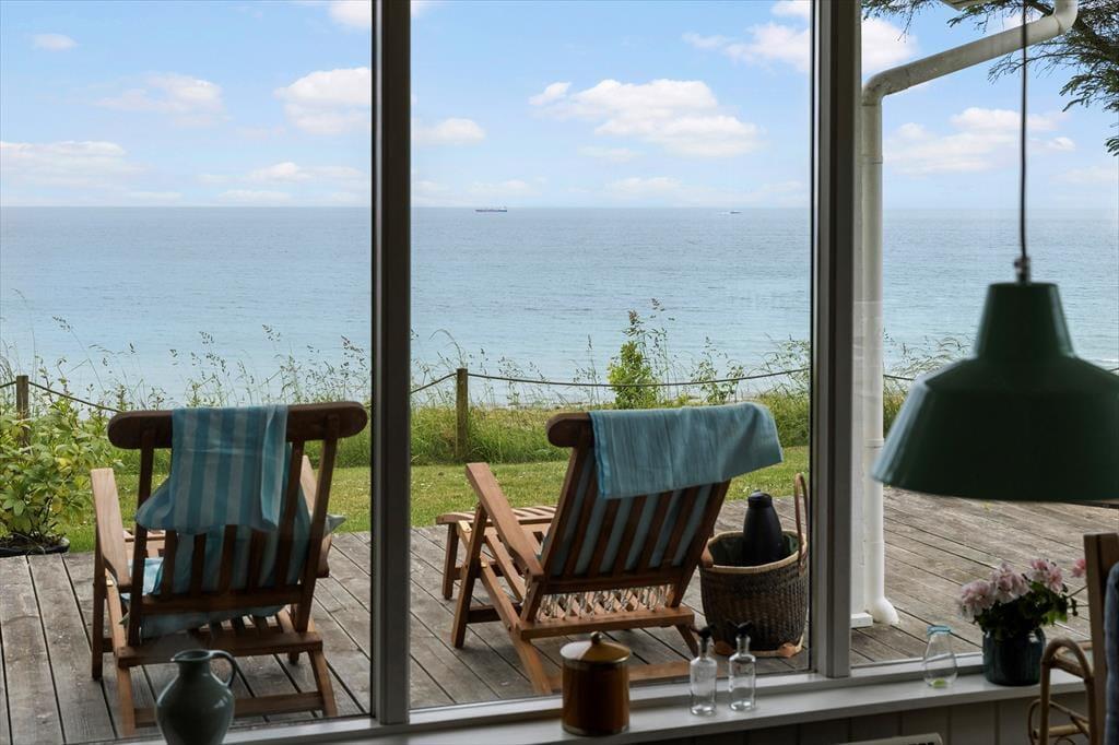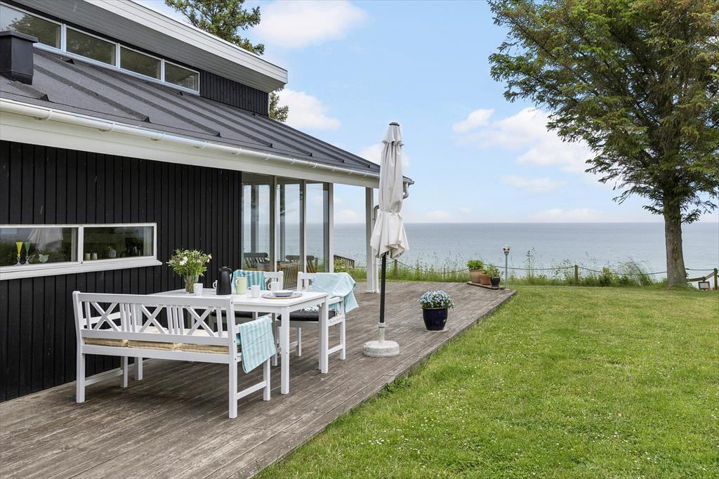 Huset er smukt beliggende højt og med en flot udsigt bl.a. til øen Hjelm. Du har fra grunden en privat trappe-nedgang til havet. En del af terrassen er overdækket så her kan du sidde og hygge dig også når vejret ikke er helt godt. Grillen gør at der kan laves god mad udendørs og hele familien kan sidde og spise den lærke mad, både inde og ude.