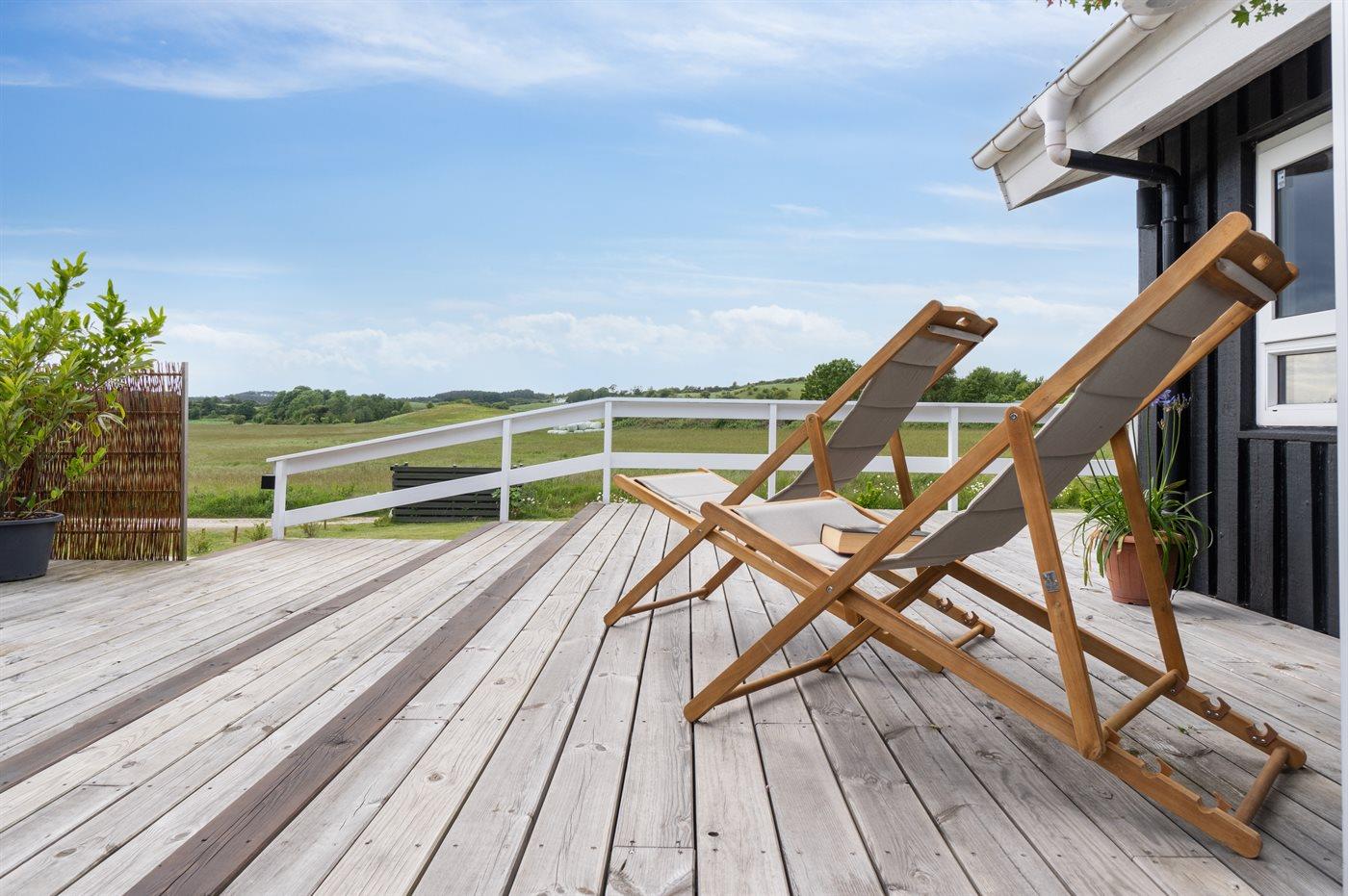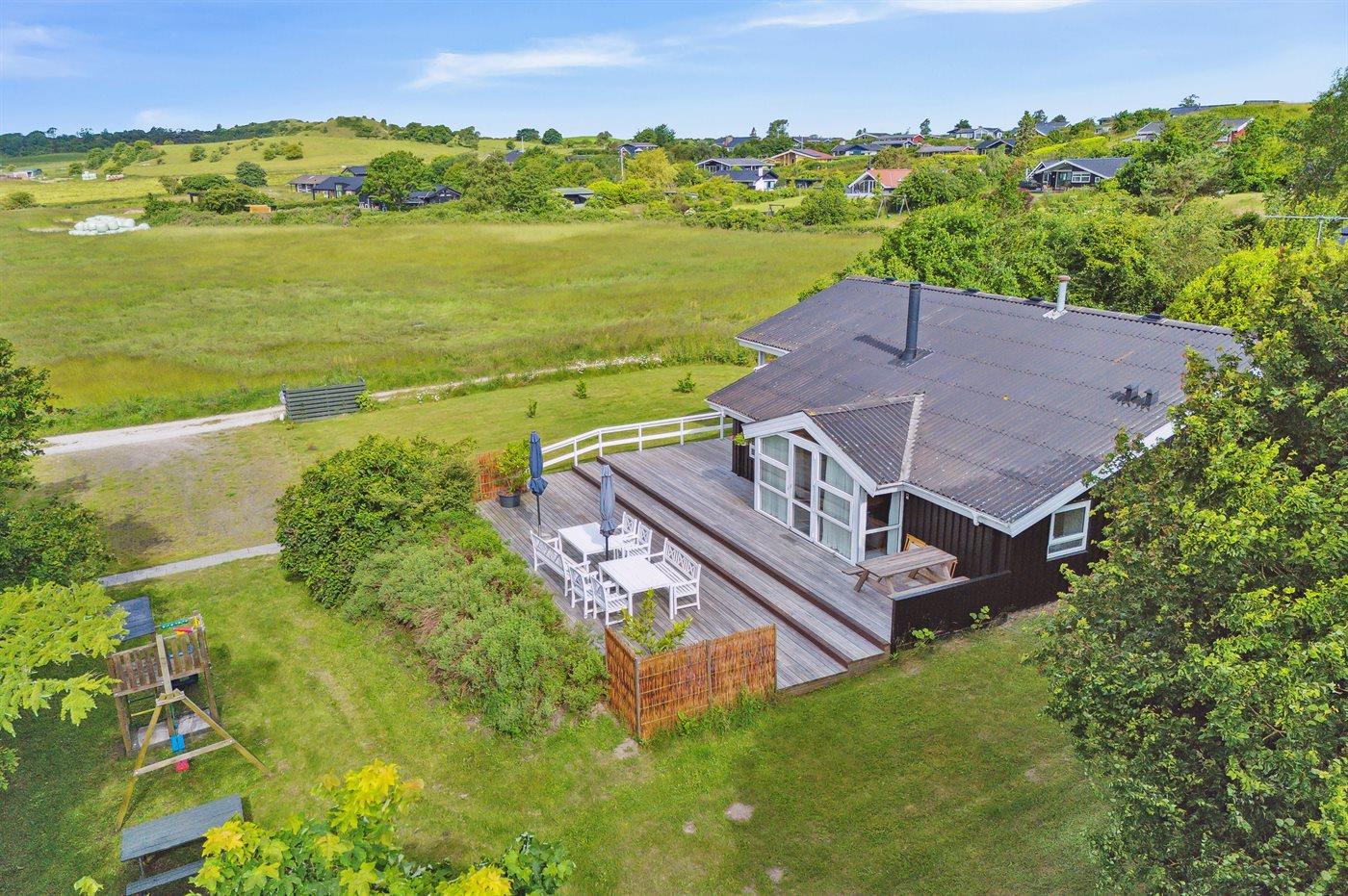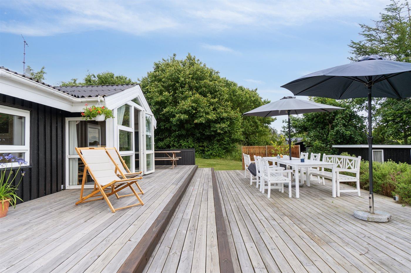 Ferieboligen er beliggende på en 1499 m² stor havegrund. Der er 175 m til havet. Nærmeste forretning er beliggende i en afstand af 4000 m. Til ferieboligen hører åbent terrasseareal. Desuden er der overdækket terrasse. Gynge. Sandkasse. Legetårn. Rutchebane. Grill til rådighed. Parkering ved ferieboligen.