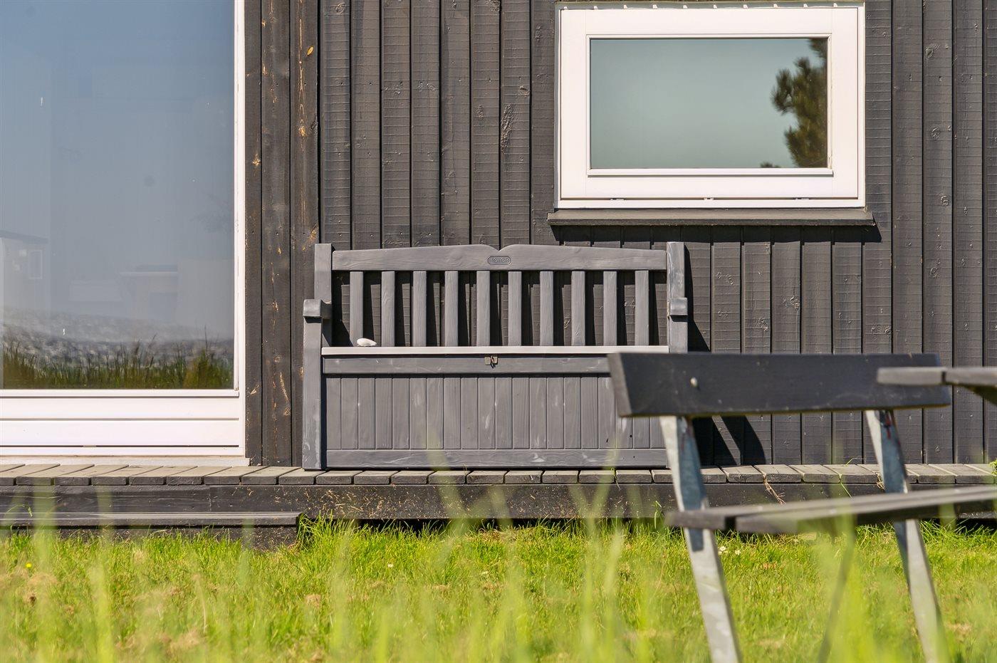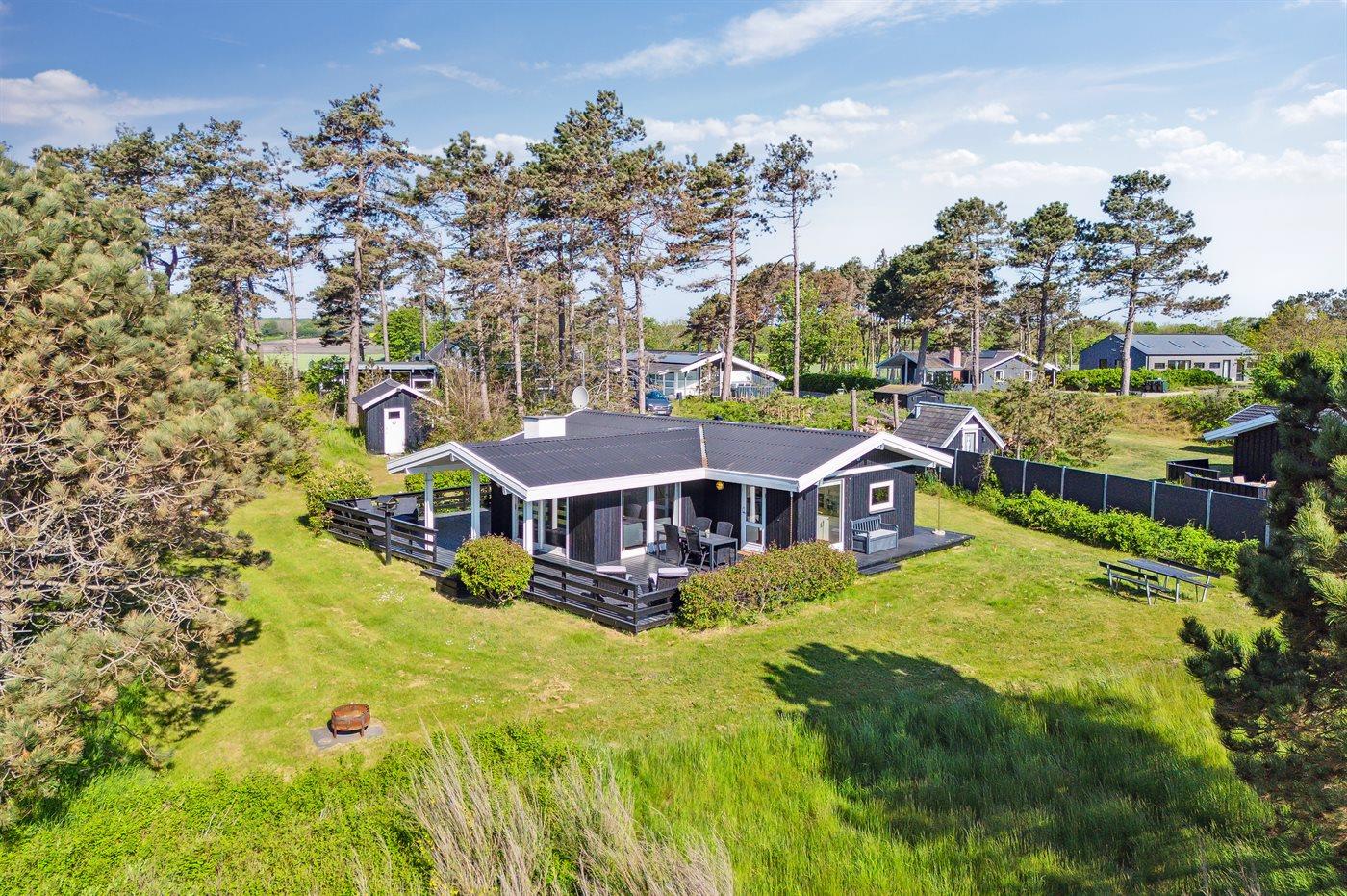 Ferieboligen er beliggende på en 1350 m² stor naturgrund. Der er 150 m til havet. Nærmeste forretning er beliggende i en afstand af 6000 m. Til ferieboligen hører åbent terrasseareal. Desuden er der overdækket terrasse. Der er redskabsrum. Grill til rådighed. Der er installeret stik til opladning af elbil. Type 2 stik. Med 11 kW ladeeffekt. Parkering ved ferieboligen.