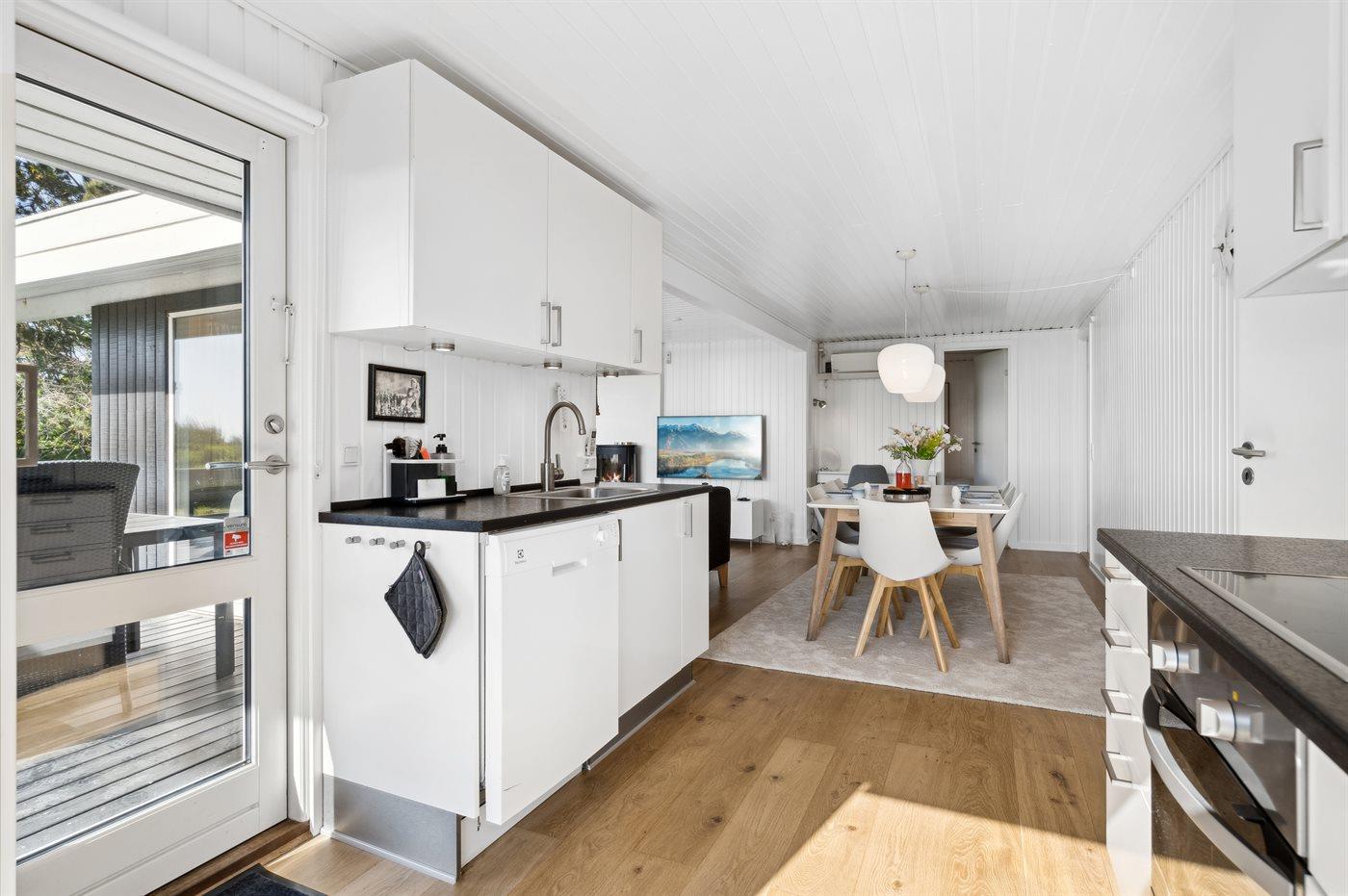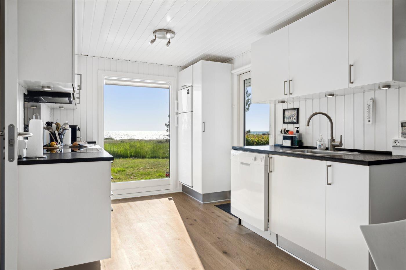 Køkkenet er udstyret med 1 køleskab. Der er 4 induktionskogeplader, varmluftovn, mikrobølgeovn samt opvaskemaskine.