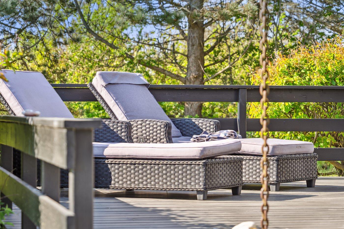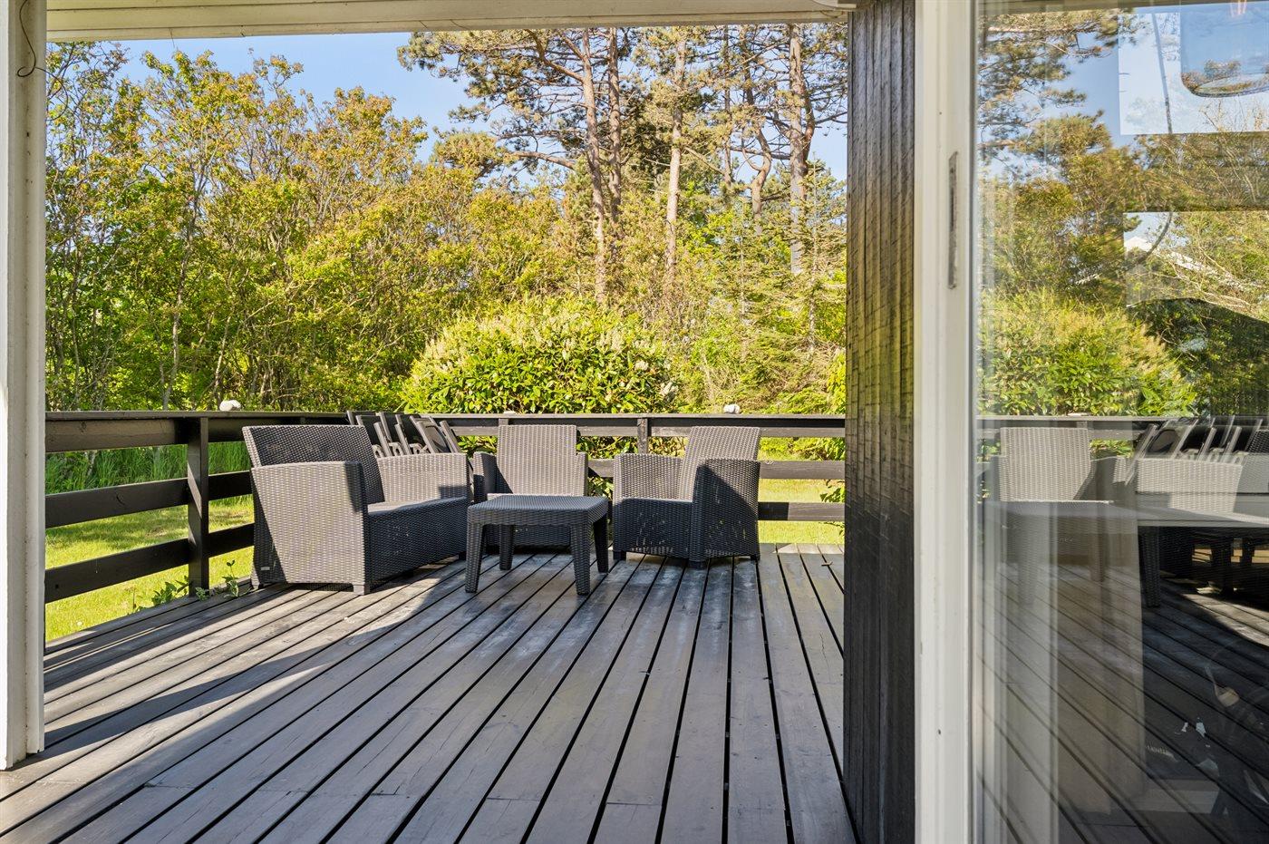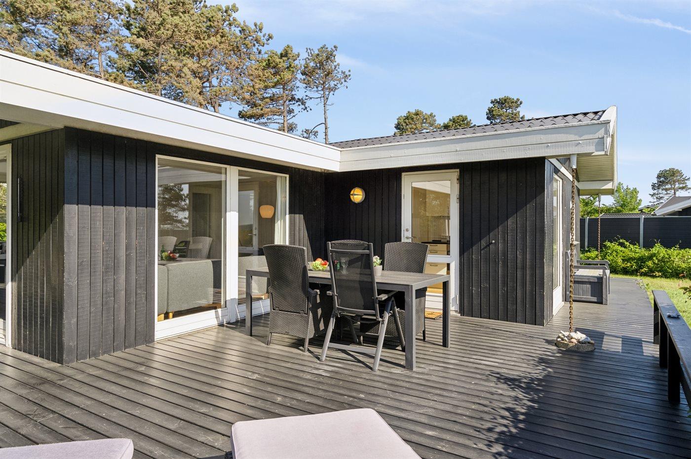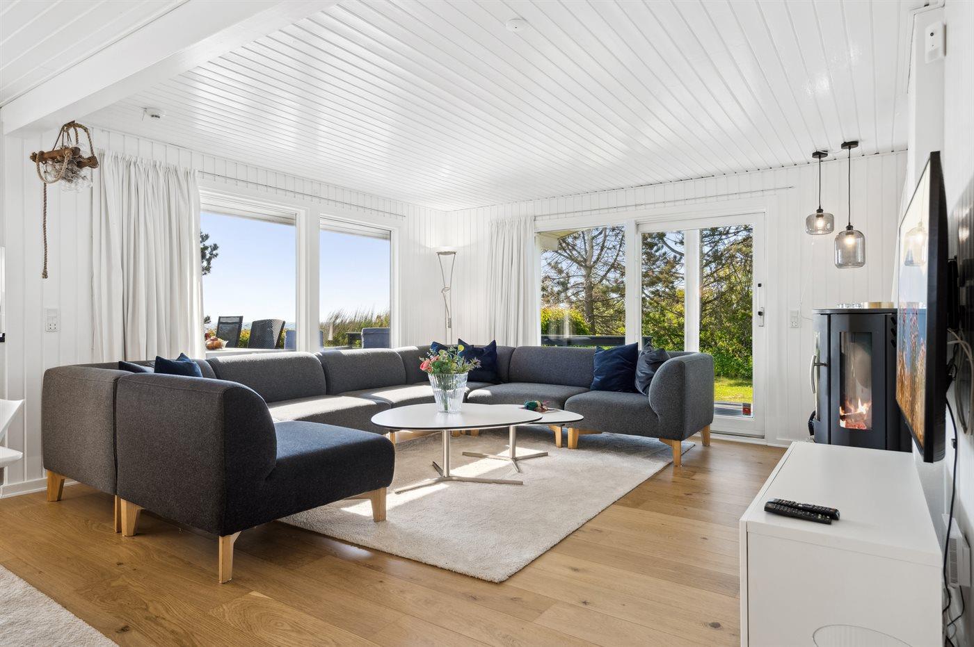 Læn dig tilbage i husets store sofa foran brændeovnen og det store fladskærms tv eller begiv dig ud på husets store terrasse, som former sig om det meste af huset, så der altid kan findes læ, skygge eller sol alt efter, hvad man trænger til.