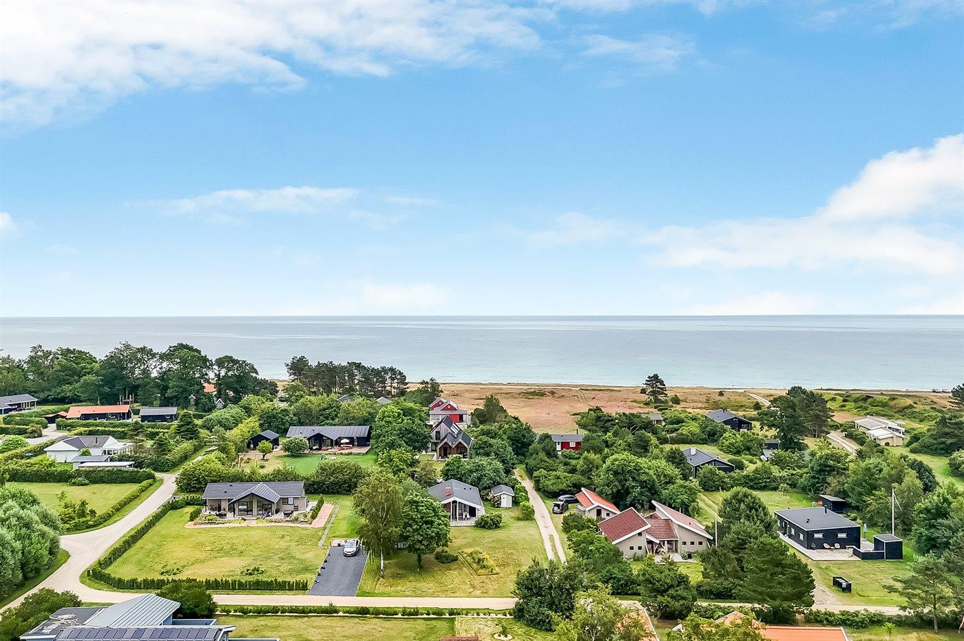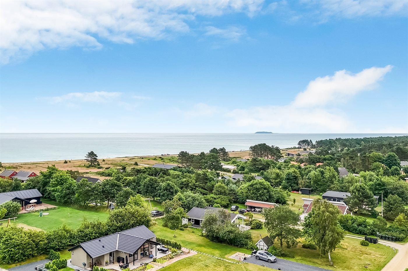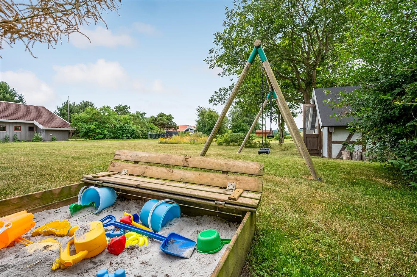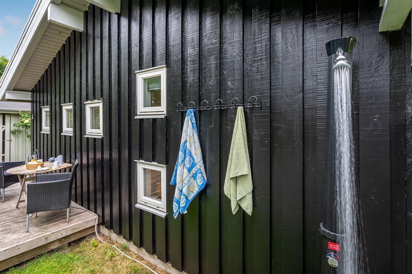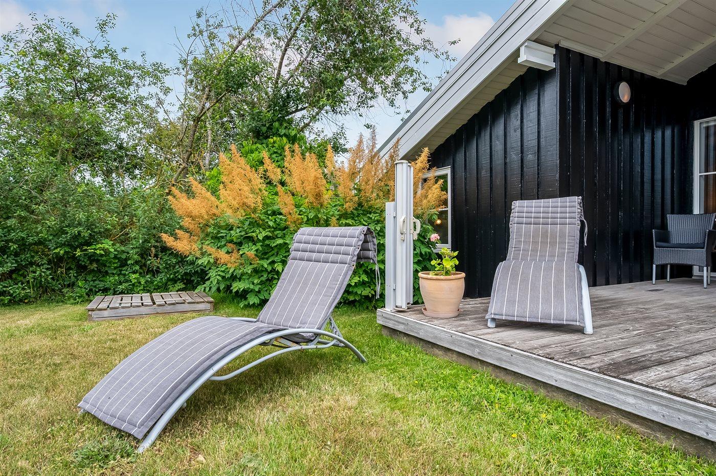 Ferieboligen er beliggende på en 1200 m² stor naturgrund. Der er 250 m til havet. Nærmeste forretning er beliggende i en afstand af 3500 m. Til ferieboligen hører åbent terrasseareal. Desuden er der overdækket terrasse. Gynge. Sandkasse. Legehus. Bålsted. Udendørs bruser. Der er en kuglegrill og en gasgrill til rådighed. Der er installeret stik til opladning af elbil. Type 2 stik. Med 11 kW ladeeffekt. Parkering ved ferieboligen.