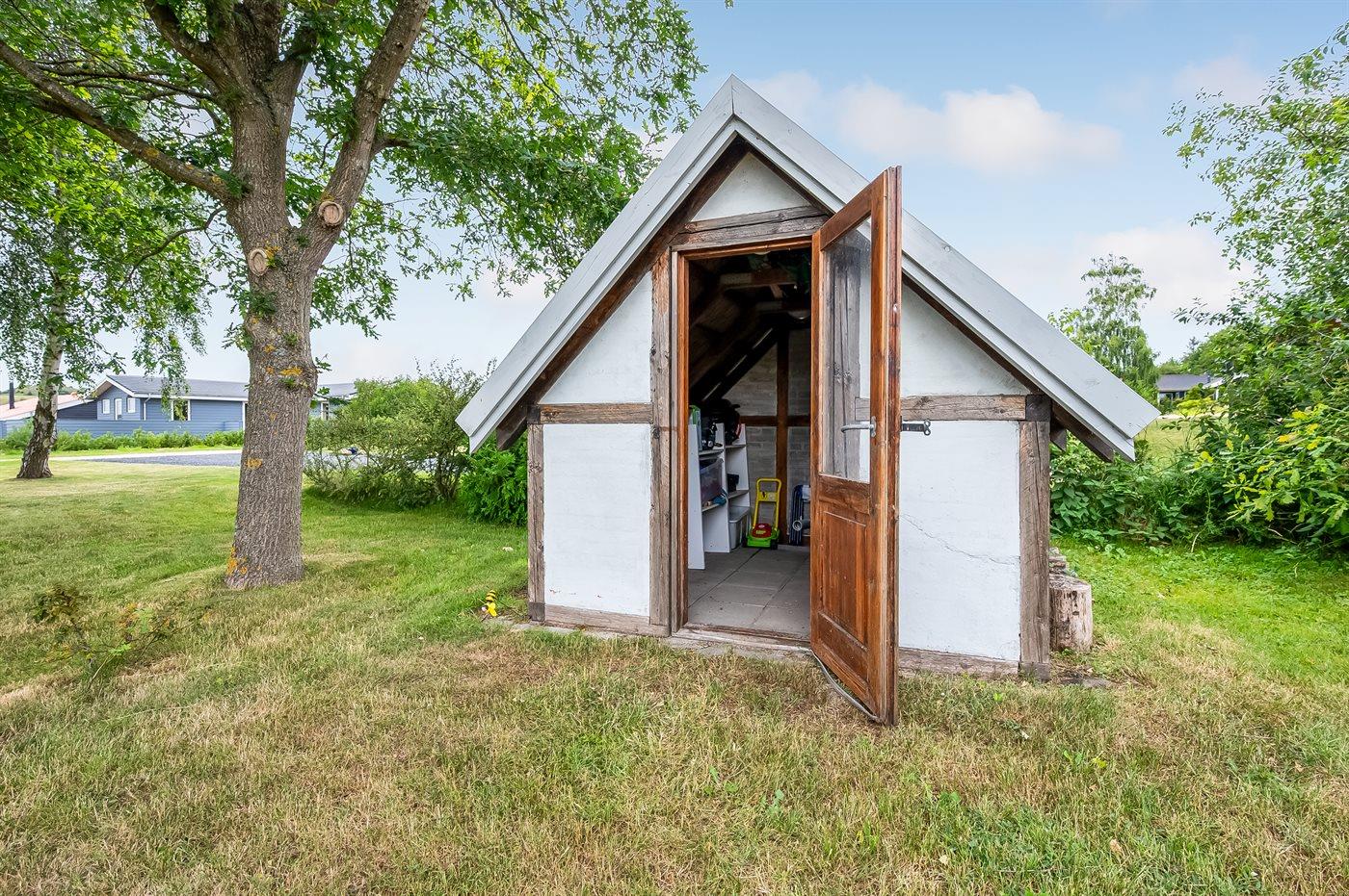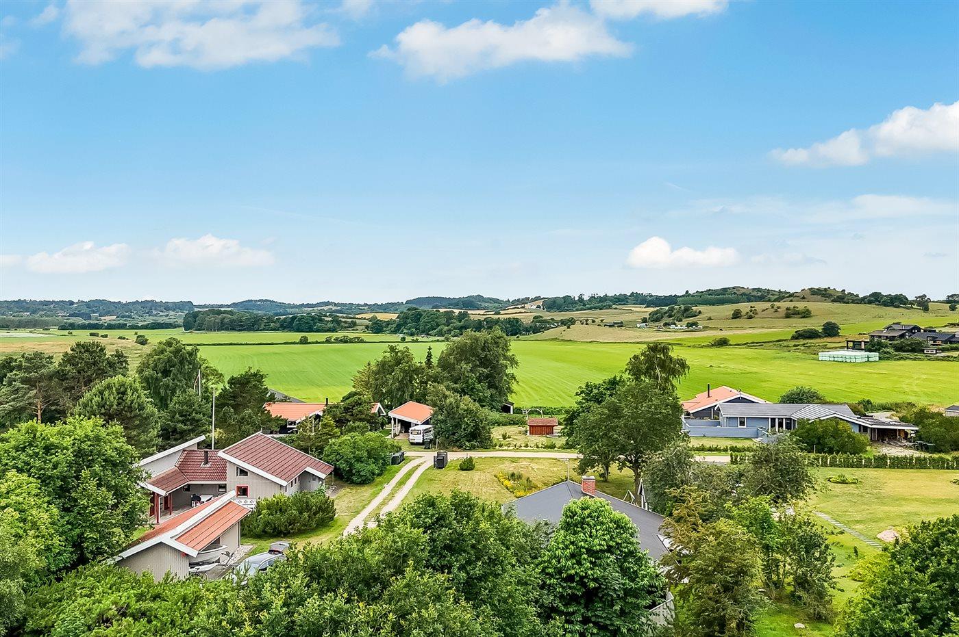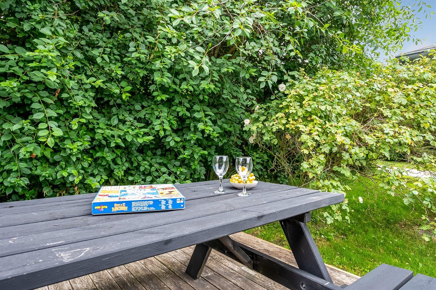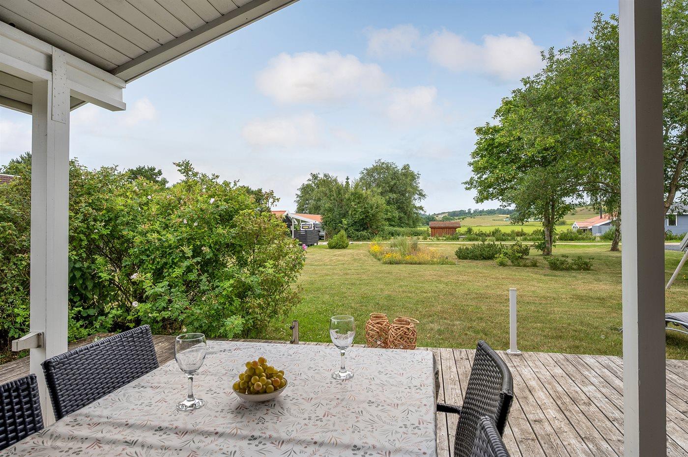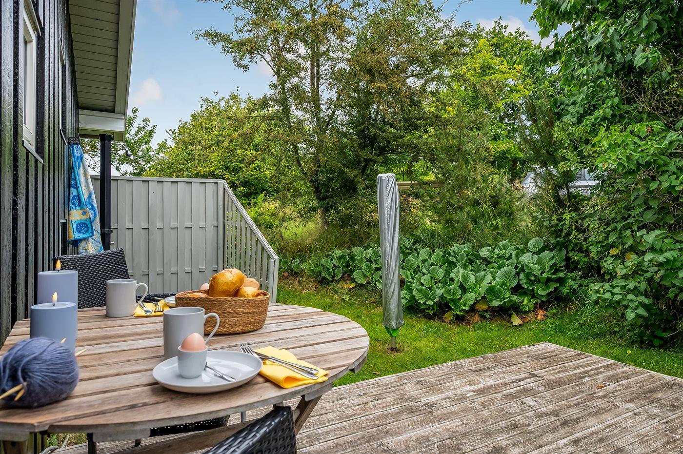 Ferieboligen er beliggende på en 1200 m² stor naturgrund. Der er 250 m til havet. Nærmeste forretning er beliggende i en afstand af 3500 m. Til ferieboligen hører åbent terrasseareal. Desuden er der overdækket terrasse. Gynge. Sandkasse. Legehus. Bålsted. Udendørs bruser. Der er en kuglegrill og en gasgrill til rådighed. Der er installeret stik til opladning af elbil. Type 2 stik. Med 11 kW ladeeffekt. Parkering ved ferieboligen.