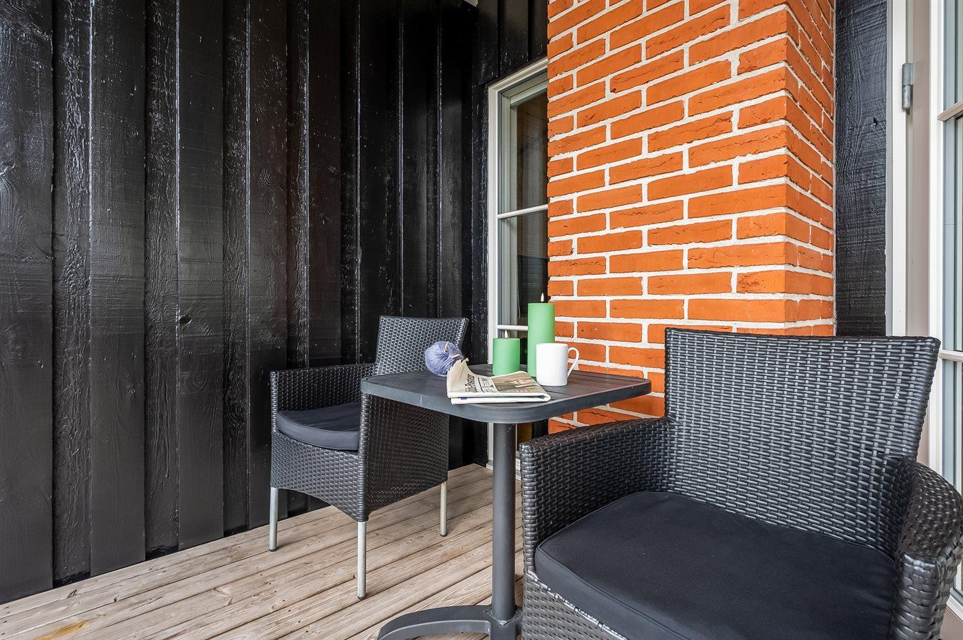 Udenfor venter en stor naturgrund med masser af luft og plads til leg. Børnene kan boltre sig på græsplænen eller udforske det tilhørende legetøj og udstyr til boldspil – og de voksne kan trække sig tilbage på terrassen med en kop kaffe og udsigt til de grønne omgivelser.