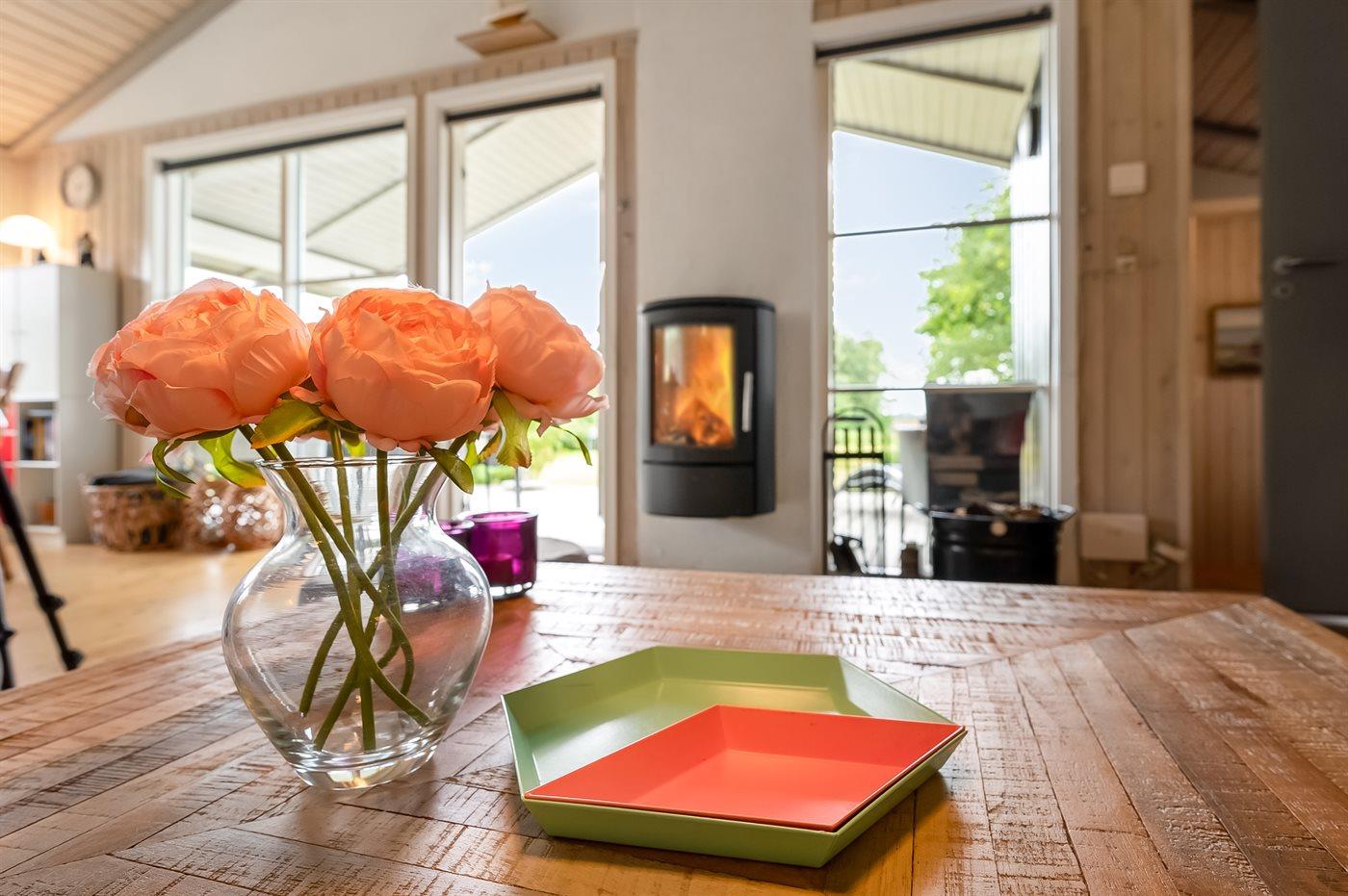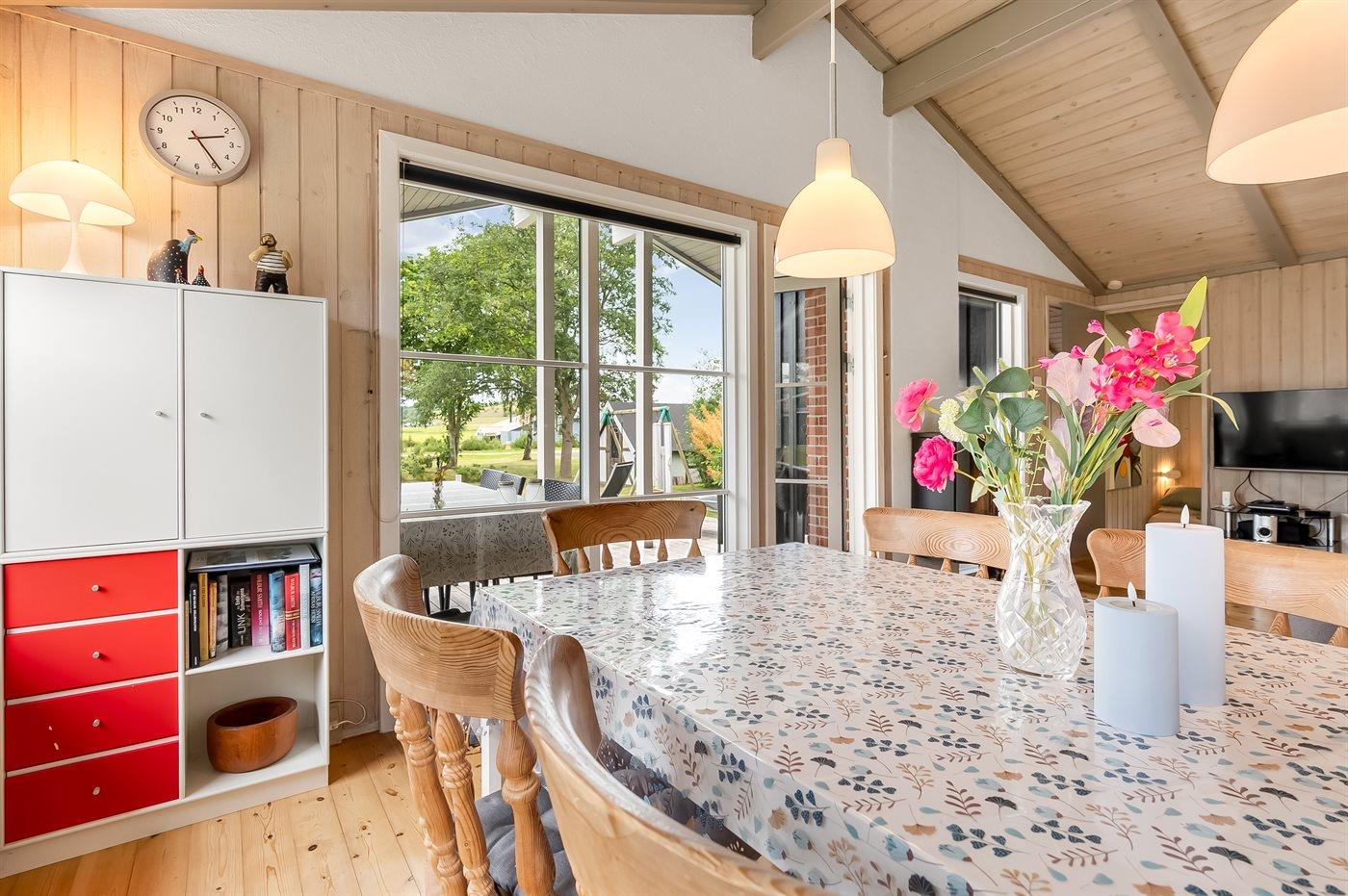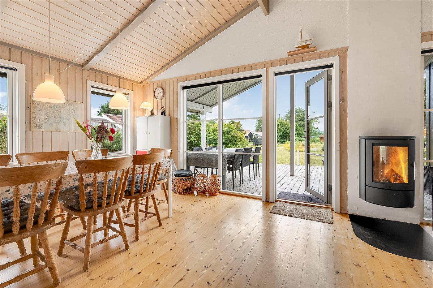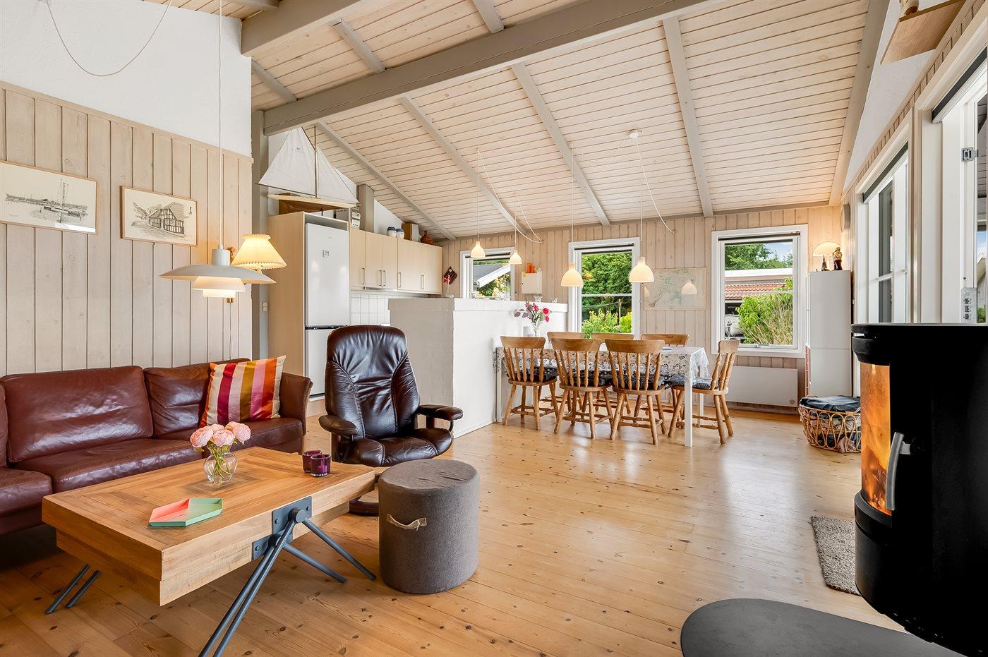 Huset er hyggeligt og funktionelt indrettet med et lyst opholdsrum med køkken, spiseplads og sofaområde samlet i ét. Her er god plads til både madlavning, brætspil og afslapning foran brændeovnen, når dagen går på hæld.
