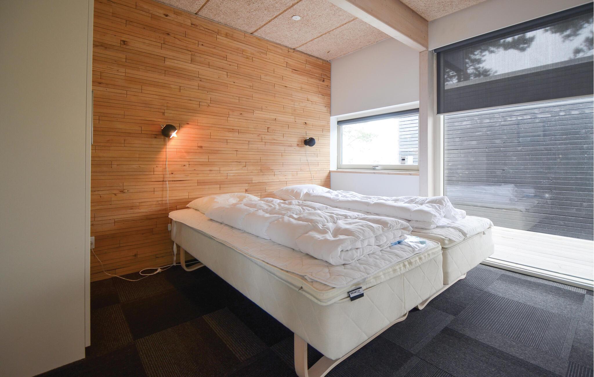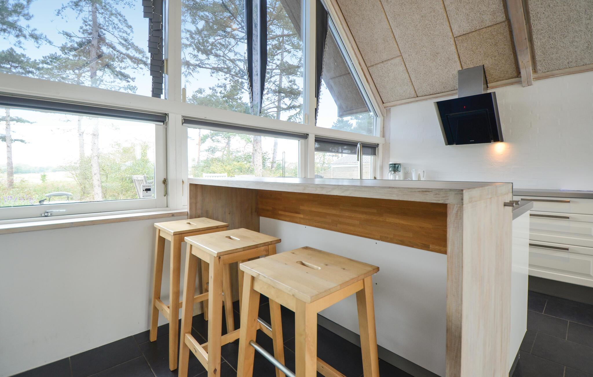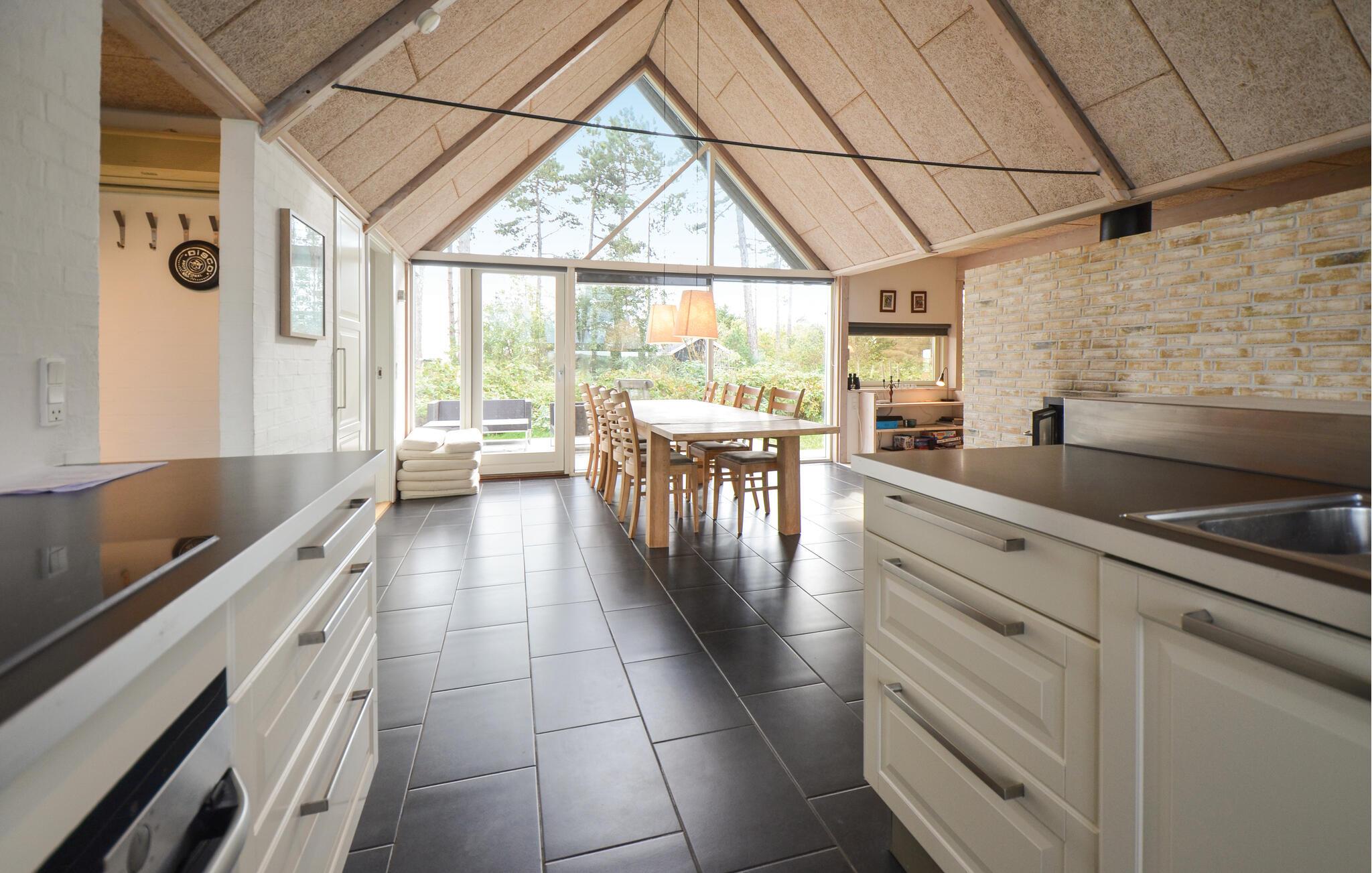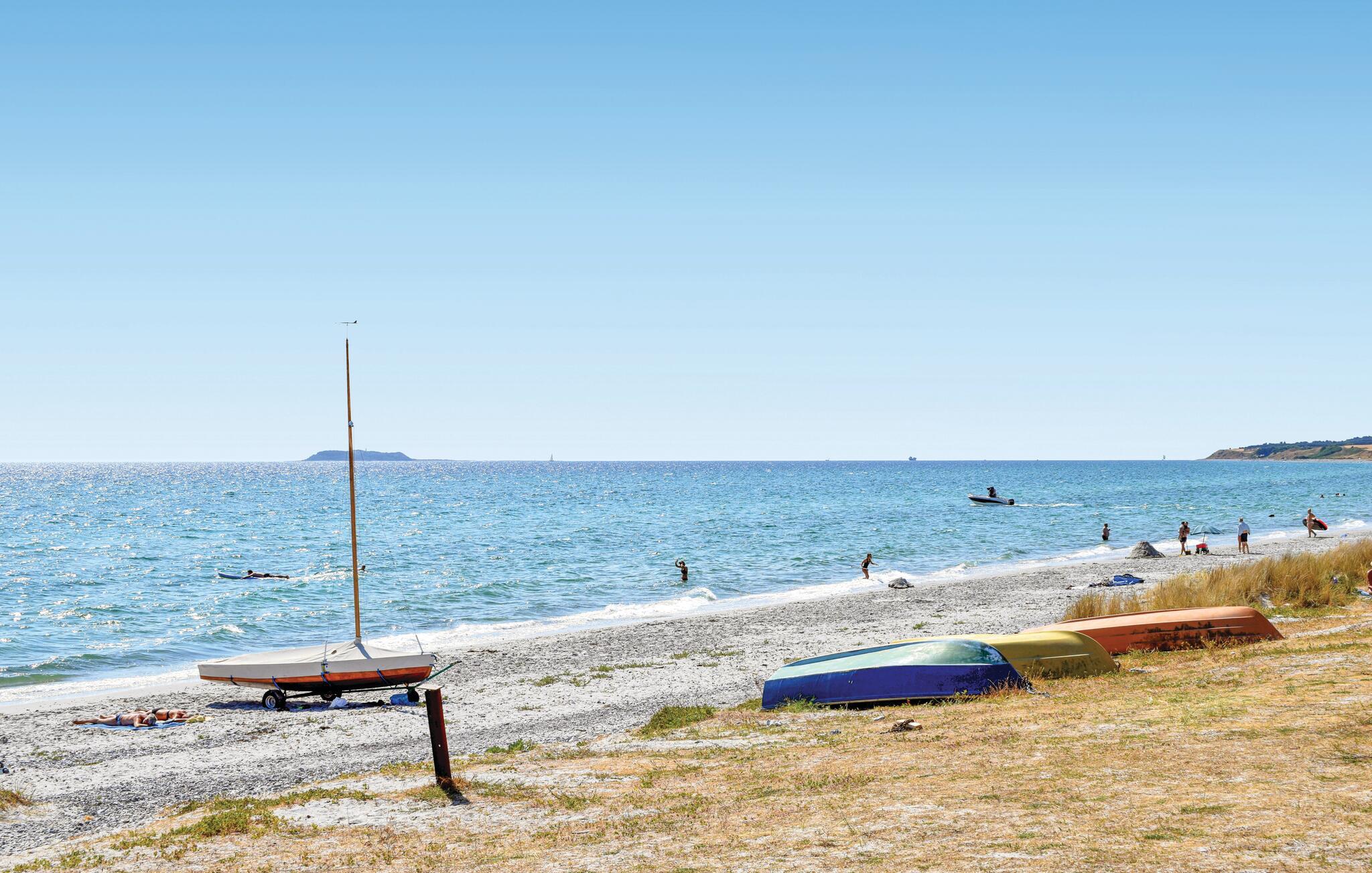 I anden række til stranden - ved den populære Dråby strand - ligger dette pragtfulde hus med havudsigt. Huset er et spændende og anderledes byggeri med et åbent køkken/spise område, som er placeret centralt i huset med masse af lysindfald og loft op til kip. To adskilte værelses-afdelinger med hver to værelser gør huset velegnet til såvel en stor eller to familier. Der ligger gode terrasser på begge sider af huset. I en separat sidebygning finder I et aktivitetsrum med forskellige spillemuligheder som sammen med Trampolinen er tilgængelig i perioden fra påske til medio oktober.