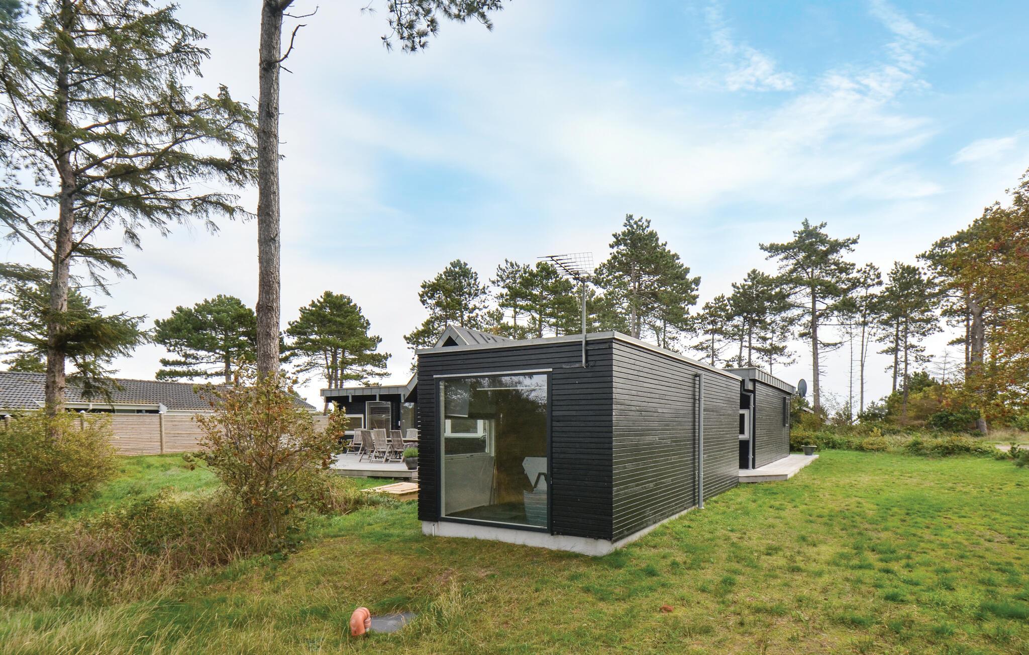 Smukt træhus med havudsigt nær Dråby Strand, perfekt til familieferie med aktivitetsrum og trampolin.