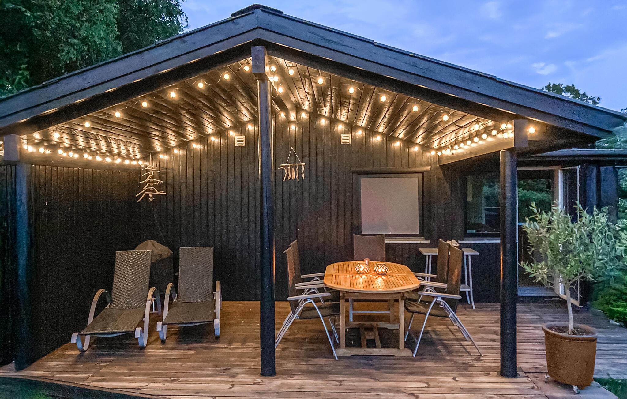 Der er masser af plads på de store træterrasser omkring huset, hvor der bl.a. kan slappes af i hængekøjen. På den vestvendte, overdækkede terrasse nydes de lange sommeraftener ved grillen.