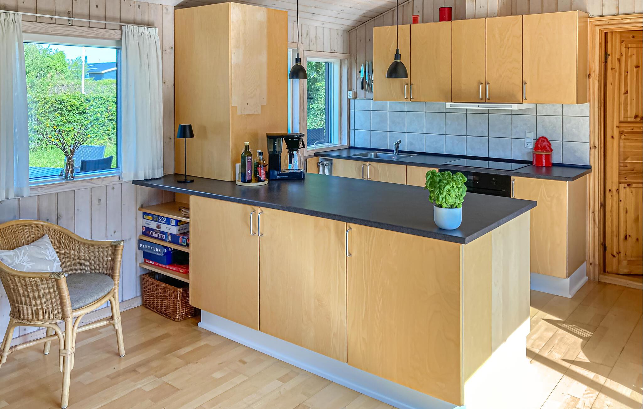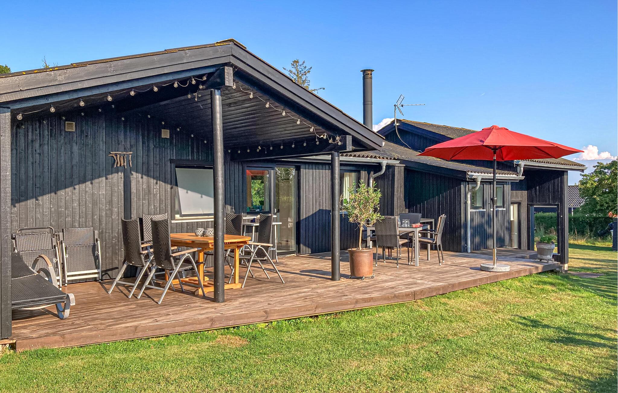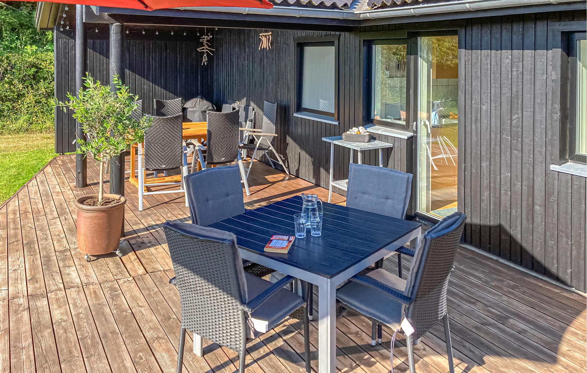 Gennemrenoveret feriehus på en stor grund med udsigt til øen Hjelm. Feriehuset ligger i et dejligt område kun 350 m fra skøn badestrand, hvorfra der også er gode fiskemuligheder. Fra stranden er der mulighed for at sætte egen båd i vandet fra en veletableret ophalerplads. Har der været held med fiskeriet, renses fiskene på den separate fiskerenseplads ved feriehuset.