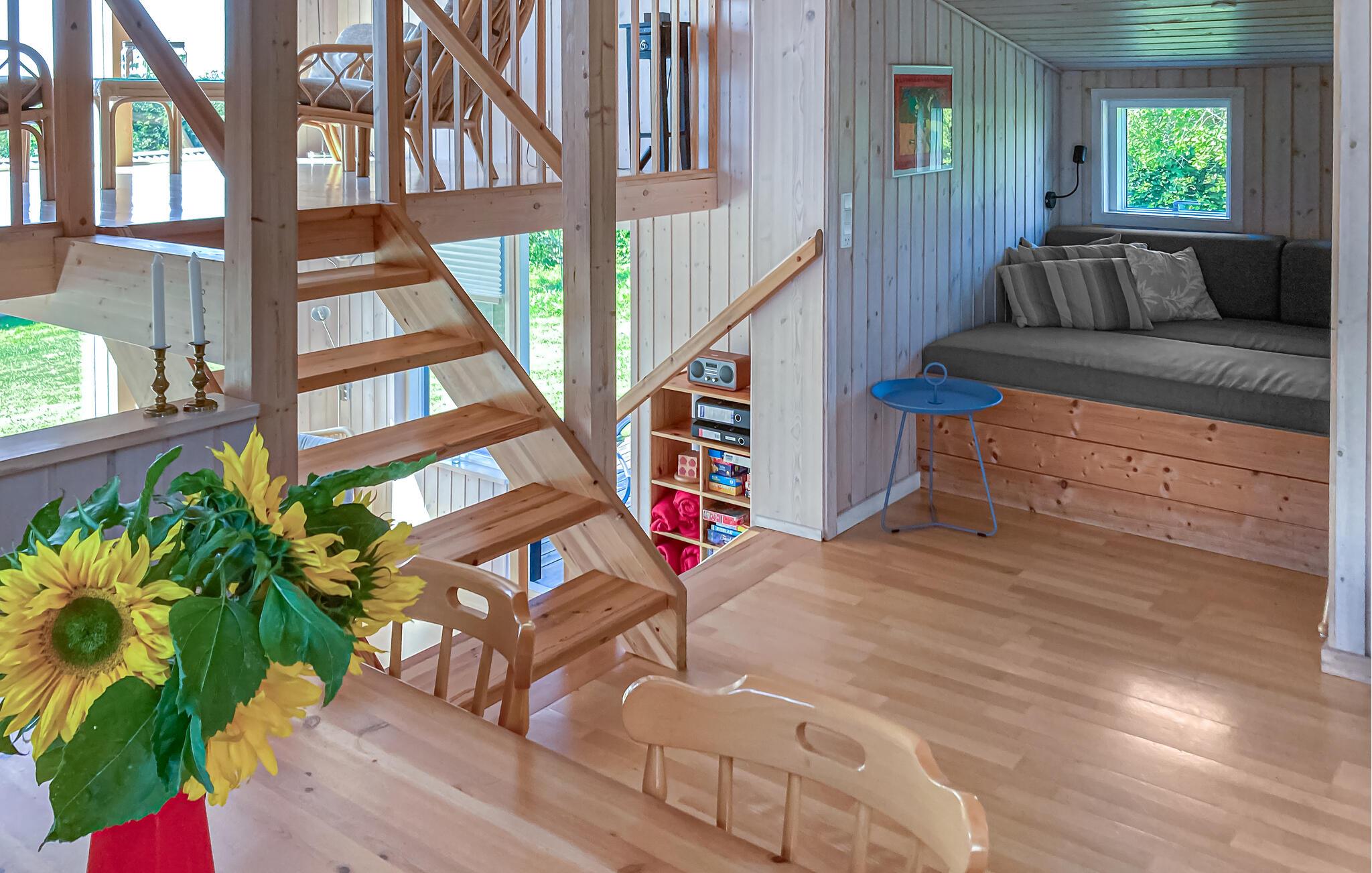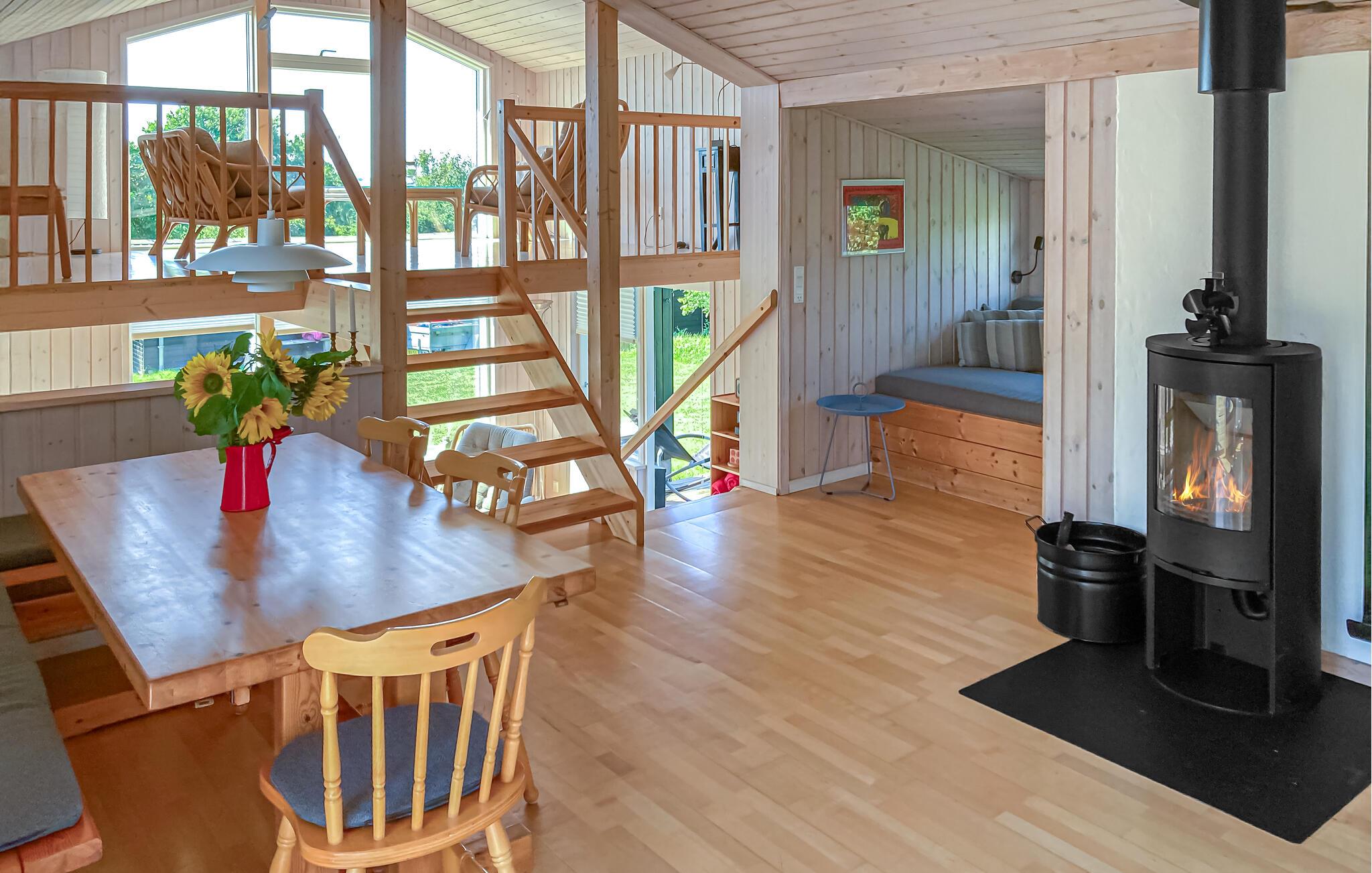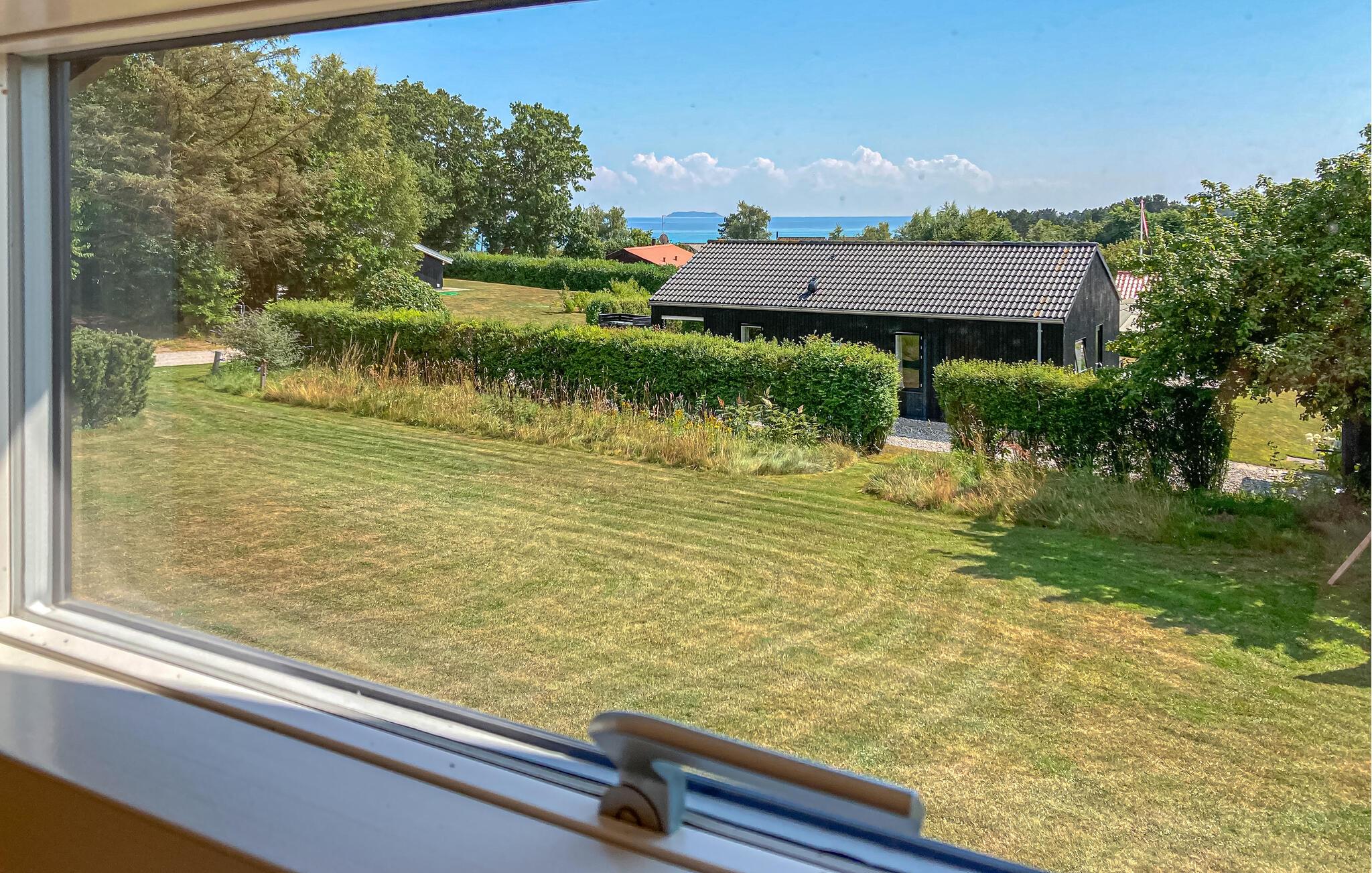 Gennemrenoveret feriehus på en stor grund med udsigt til øen Hjelm. Feriehuset ligger i et dejligt område kun 350 m fra skøn badestrand, hvorfra der også er gode fiskemuligheder. Fra stranden er der mulighed for at sætte egen båd i vandet fra en veletableret ophalerplads. Har der været held med fiskeriet, renses fiskene på den separate fiskerenseplads ved feriehuset.
