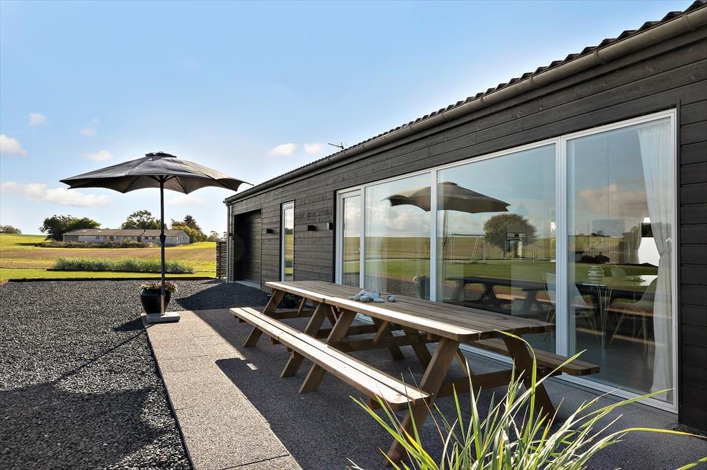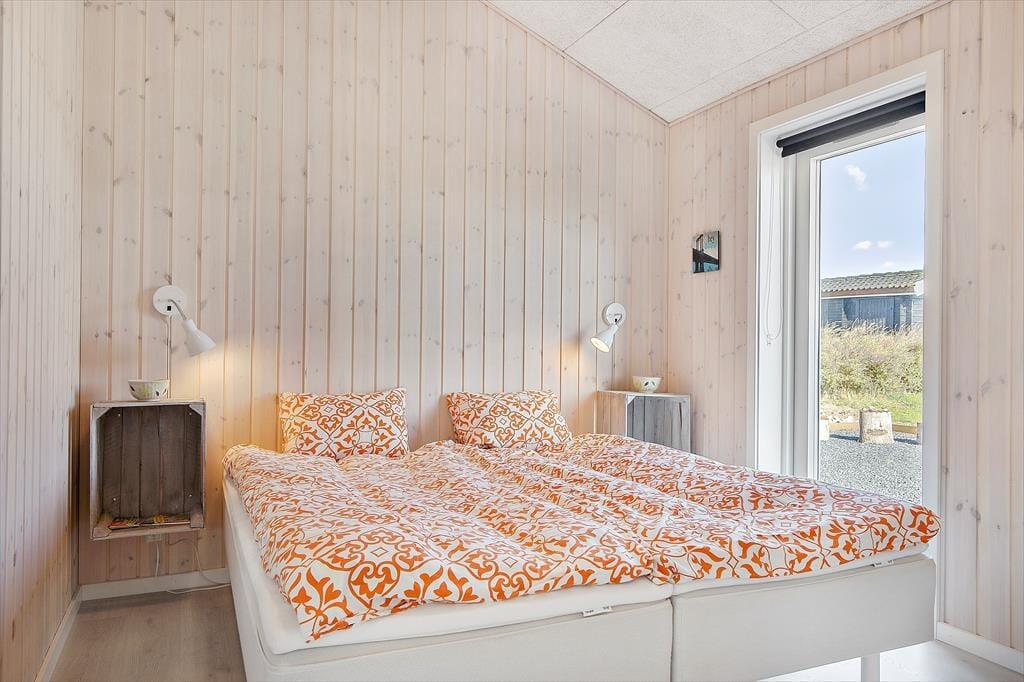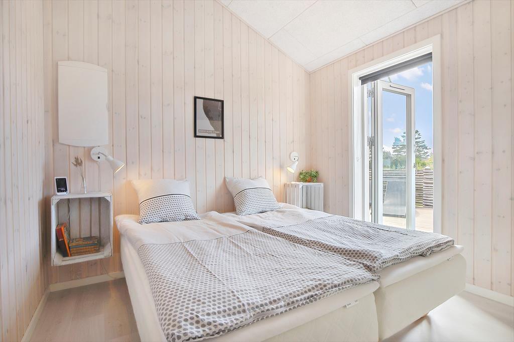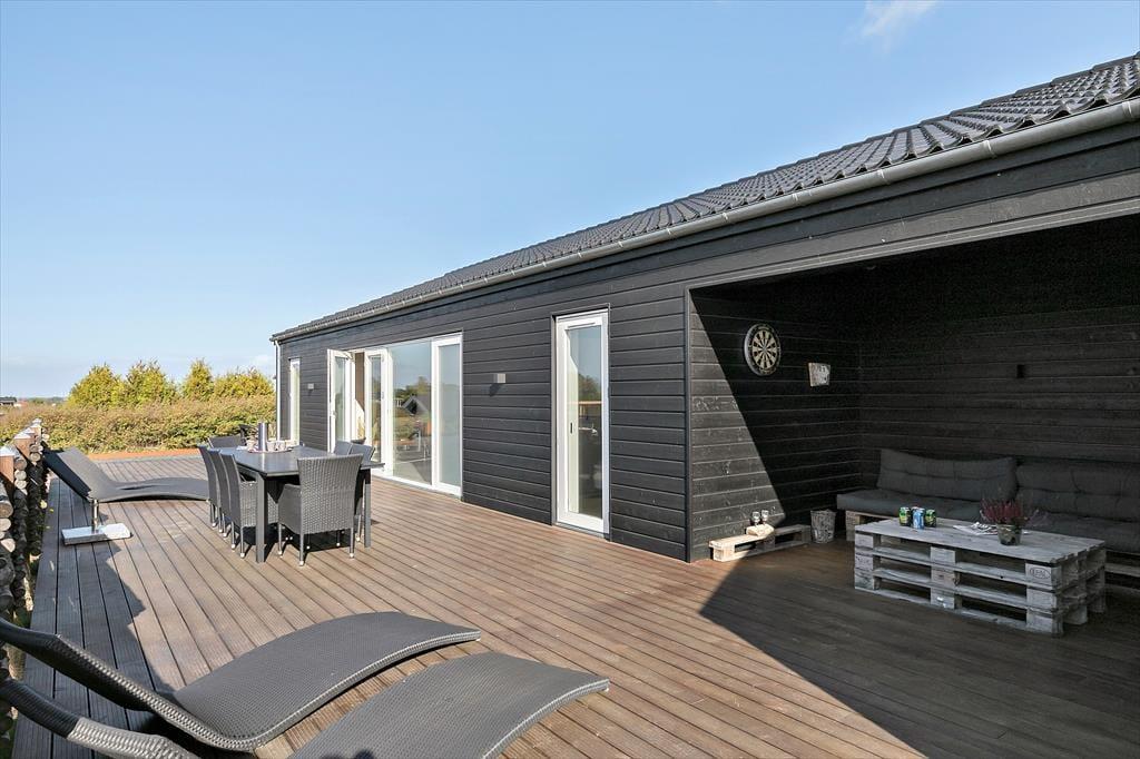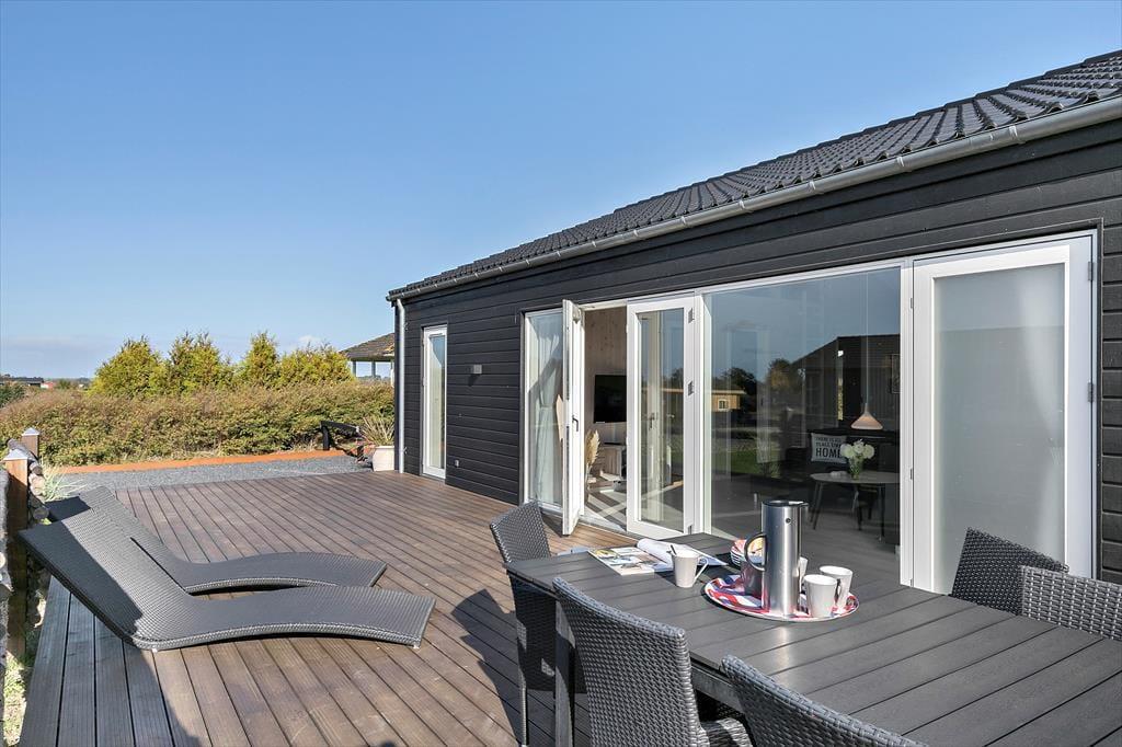 Nyt flot helårsisoleret sommerhus fra 2021 opført i en moderne arkitektur med en intim og hyggelig sommerhusatmosfære og en gennemtænkt indretning. Huset fremstår således med et elegant og gennemtænkt designtwist. Stor stue med loft til kip og store vinduespartier, som er opdelt i spiseafdeling samt opholdsstue, hvorfra der er udgang til delvis overdækket træterrasse. Lækkert og funktionelt køkken med god plads som er integreret med den store stue. Køkkenet indeholder kogeplader med induktion, indbygget ovn, mikroovn, opvaskemaskine og køleskab med fryser. Opholdsstue med chaiselong sofa, god spiseplads, Smart TV med danske DR kanaler samt mulighed for Streaming til TV2 Play, Netflix og Viaplay (kræver eget abonnement) og parabol med tyske kanaler. To badeværelser, et med bruseniche, vaskemaskiner og tørretumbler og et med bruseniche og badekar. Fire soveværelser, alle med dobbeltsenge (2 enkeltsenge som er sat sammen). Herudover er der en hems med stort vinduesparti med to ekstra sovepladser på madrasser.