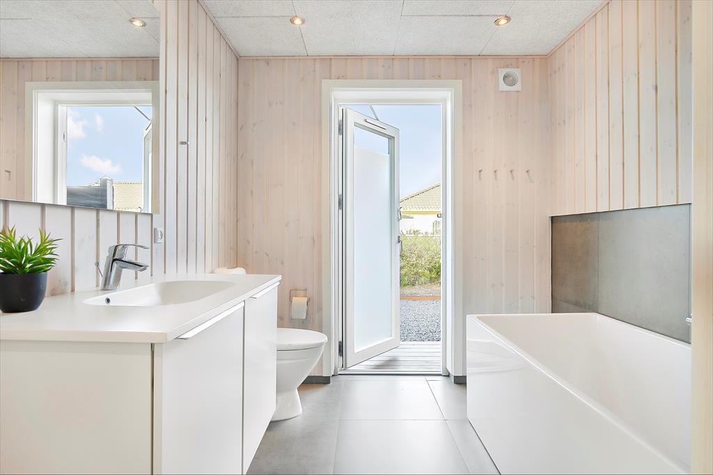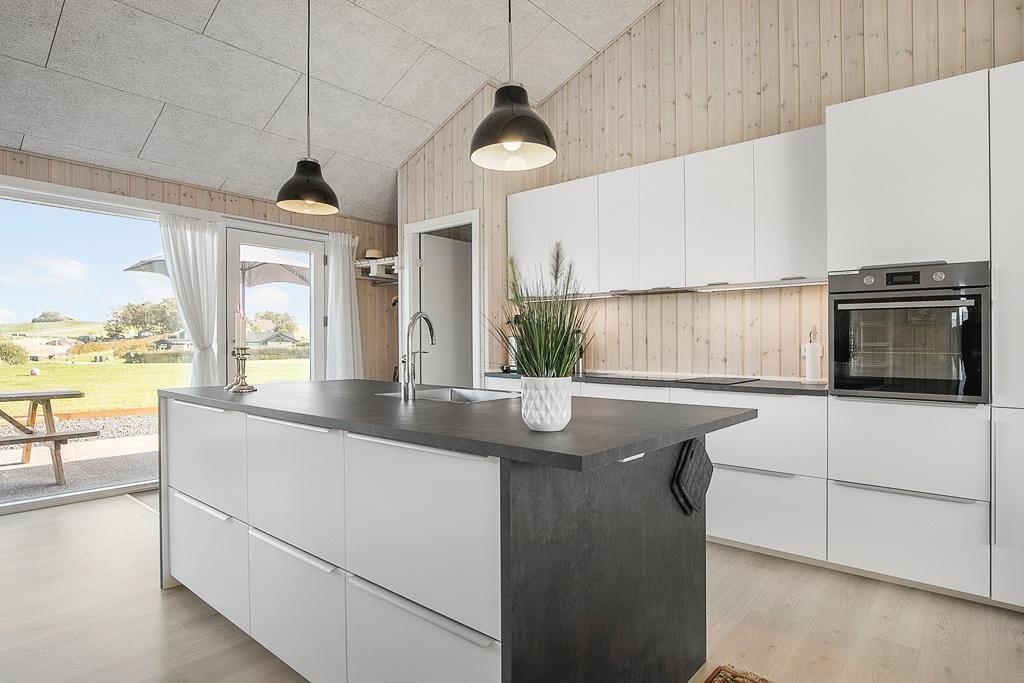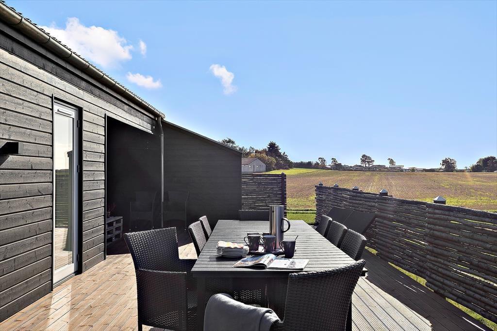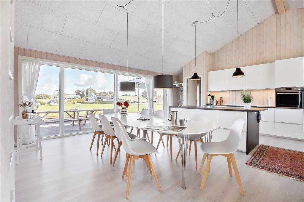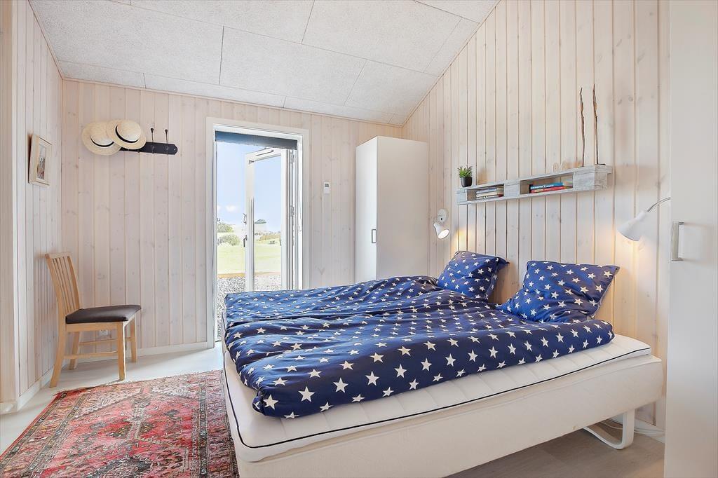 Nyt flot helårsisoleret sommerhus fra 2021 opført i en moderne arkitektur med en intim og hyggelig sommerhusatmosfære og en gennemtænkt indretning. Huset fremstår således med et elegant og gennemtænkt designtwist. Stor stue med loft til kip og store vinduespartier, som er opdelt i spiseafdeling samt opholdsstue, hvorfra der er udgang til delvis overdækket træterrasse. Lækkert og funktionelt køkken med god plads som er integreret med den store stue. Køkkenet indeholder kogeplader med induktion, indbygget ovn, mikroovn, opvaskemaskine og køleskab med fryser. Opholdsstue med chaiselong sofa, god spiseplads, Smart TV med danske DR kanaler samt mulighed for Streaming til TV2 Play, Netflix og Viaplay (kræver eget abonnement) og parabol med tyske kanaler. To badeværelser, et med bruseniche, vaskemaskiner og tørretumbler og et med bruseniche og badekar. Fire soveværelser, alle med dobbeltsenge (2 enkeltsenge som er sat sammen). Herudover er der en hems med stort vinduesparti med to ekstra sovepladser på madrasser.