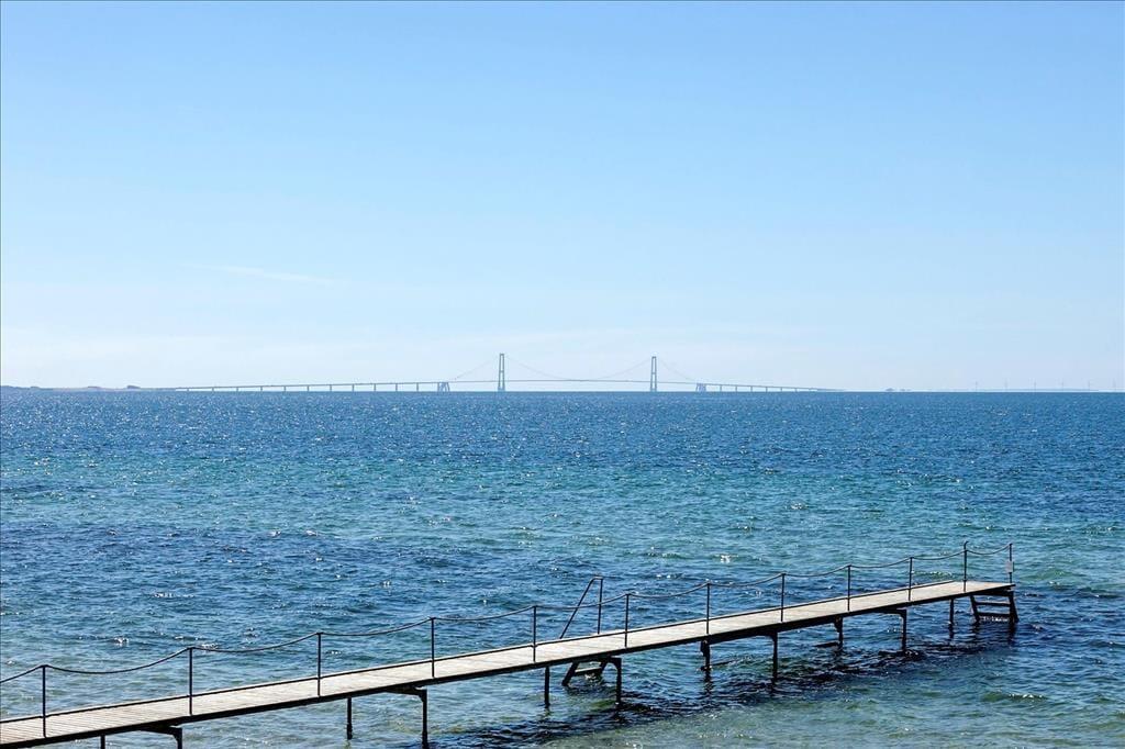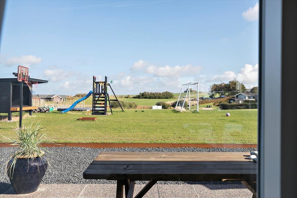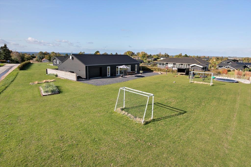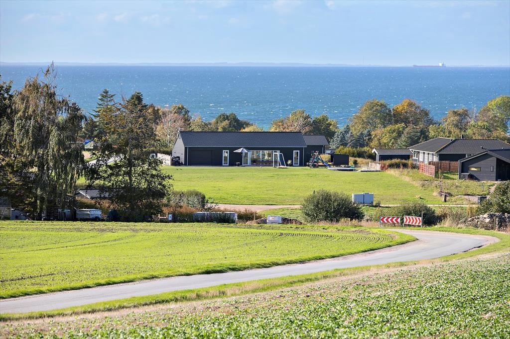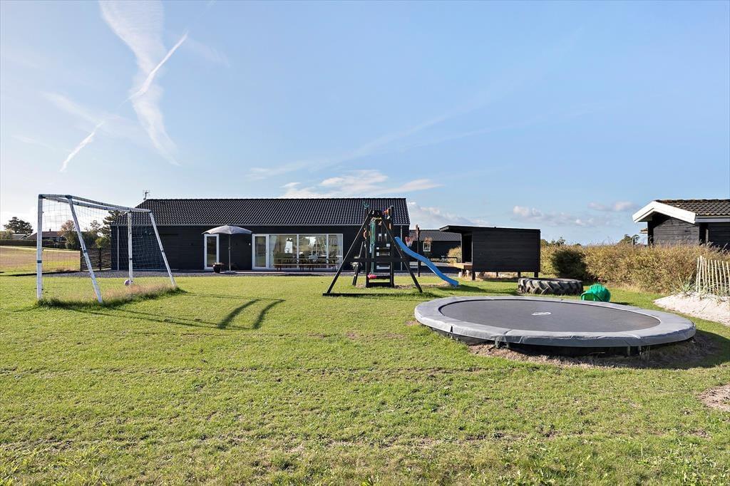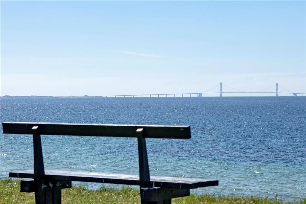 Huset er beliggende på en 1883 m2 åben grund. Fra grunden er der en flot udsigt ud over området og havudsigt til Storebælt. Der er to terrasser, en afskærmet træterrasse med en delvis overdækning foran huset og en fliseterrasse bagved huset. Ved feriehuset er der havemøbler, liggestole, parasol, grill, trampolin, shelter, fodboldbane, bålplads, gyngestativ, sandkasse og udendørs bruser.