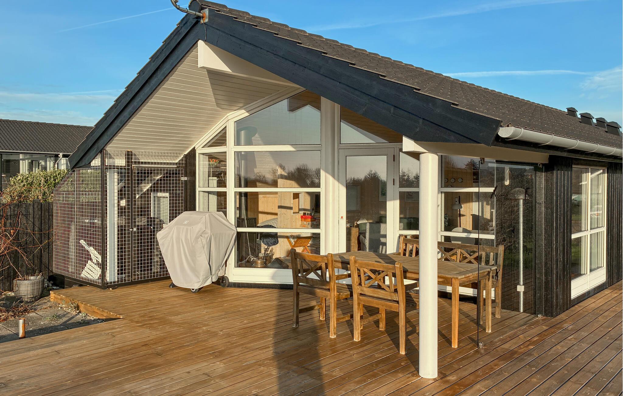På solrige dage kan I servere morgenmaden udendørs, mens børnene hopper på trampolinen eller løber på den store græsplæne. Efter dagens eventyr kan I tilberede lækre måltider på grillen.