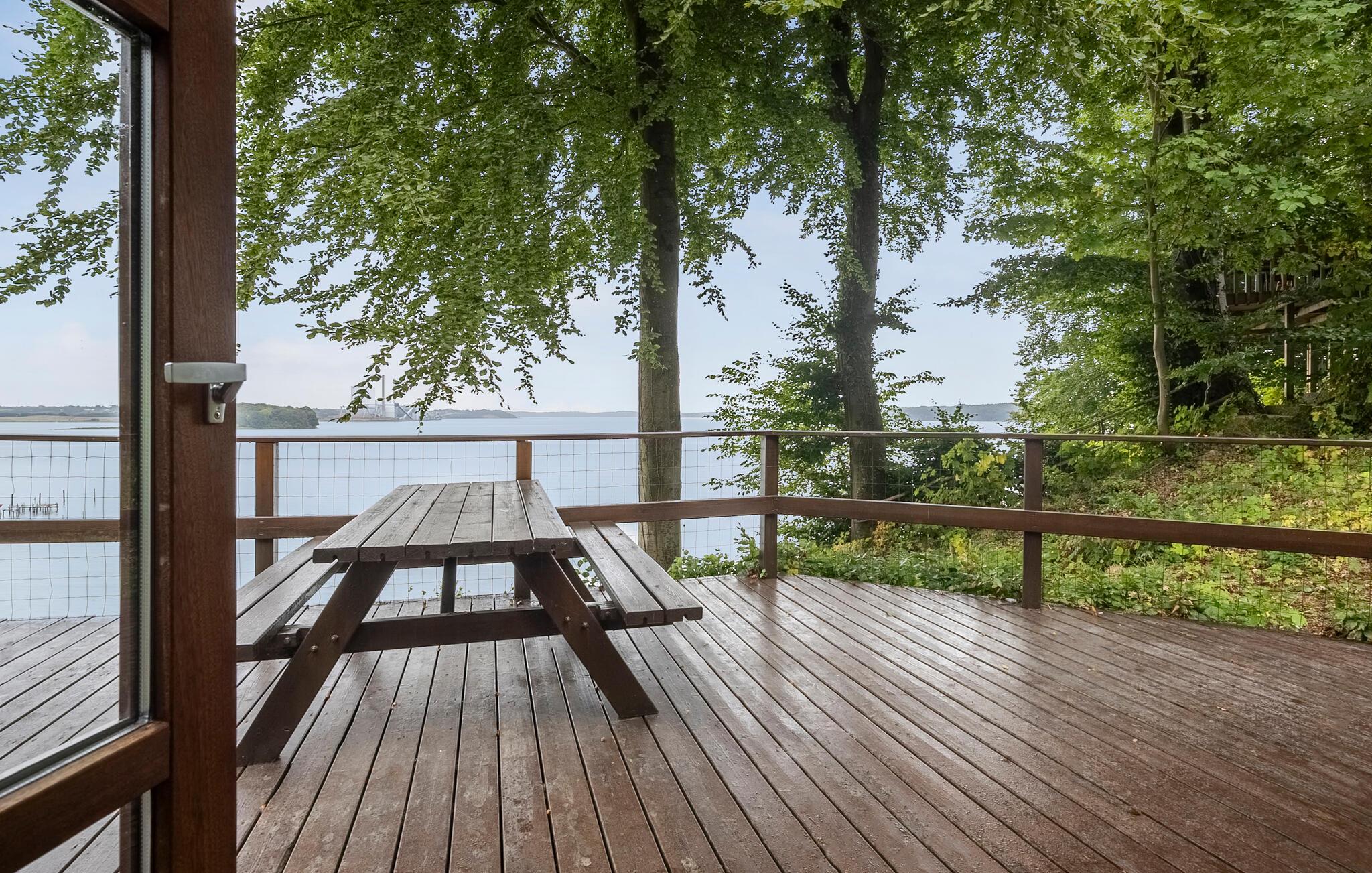 Charmerende træsommerhus med panoramaudsigt over Kolding Fjord, kun 40 m fra stranden på stor naturgrund.