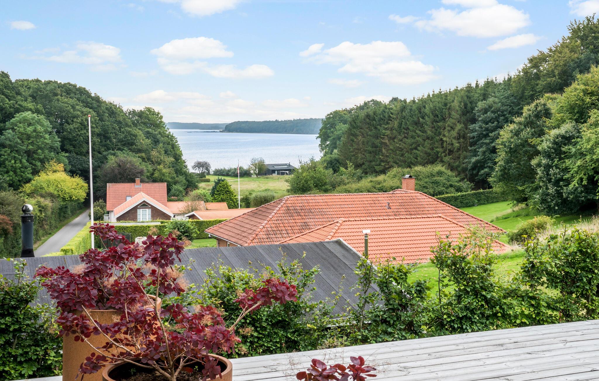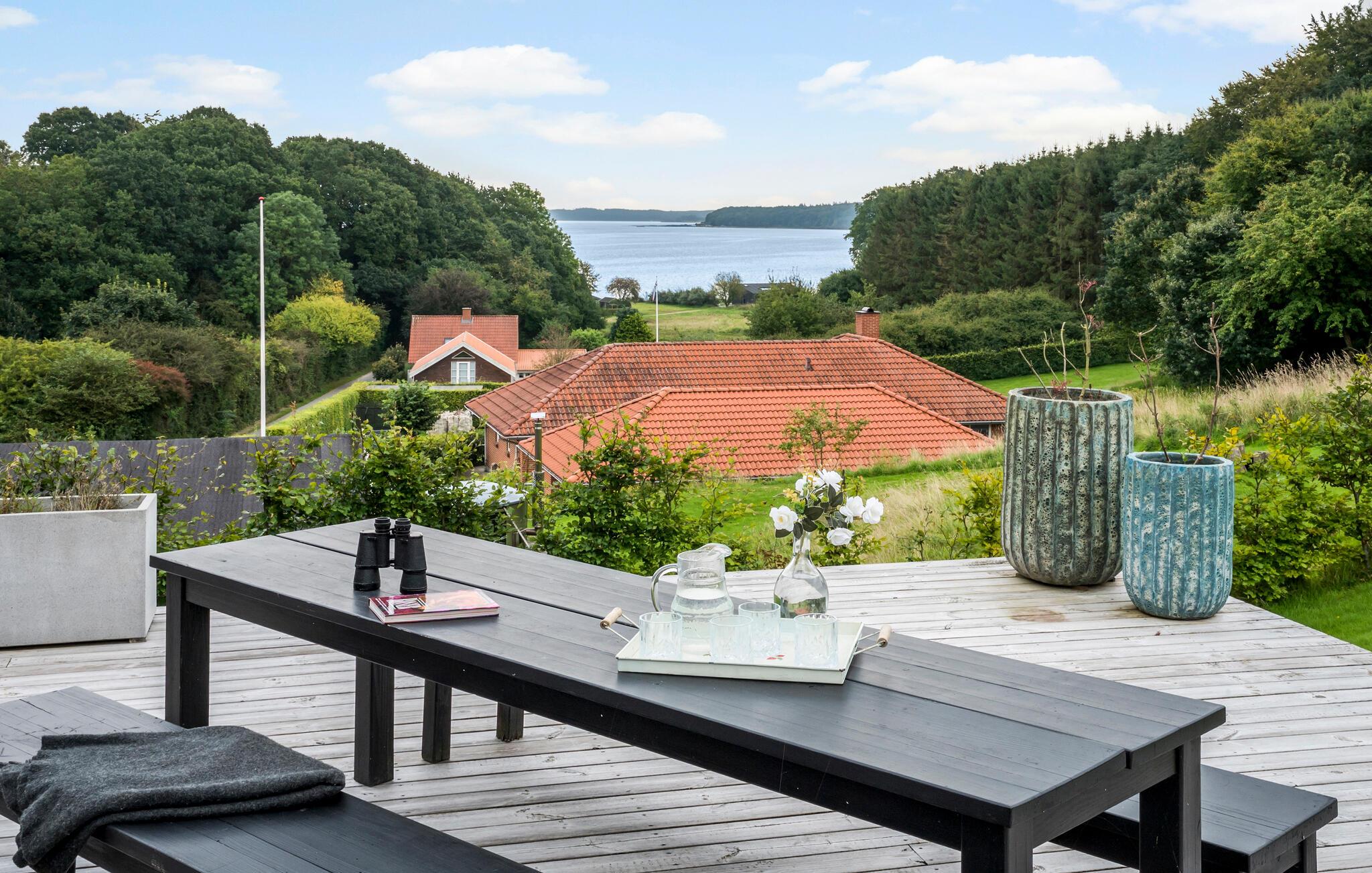 Stilfuldt og lyst feriehus med panoramaudsigt over Kolding Fjord og udendørs spa i Drejens.